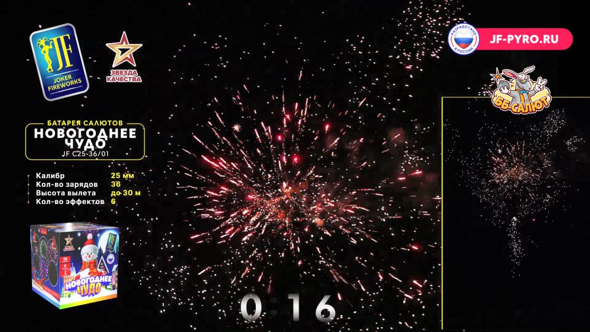 1. Красные салюты с мерцанием и кометами. 2. Разноцветный пион с треском и кометами. 3. Серебряный пион с красным мерцанием. 4. Пурпурные салюты с зелёным мерцанием и кометами. 5. Красно-голубые салюты с мерцанием и кометами. 6. Пышный золотой опадающий купол с кометами.