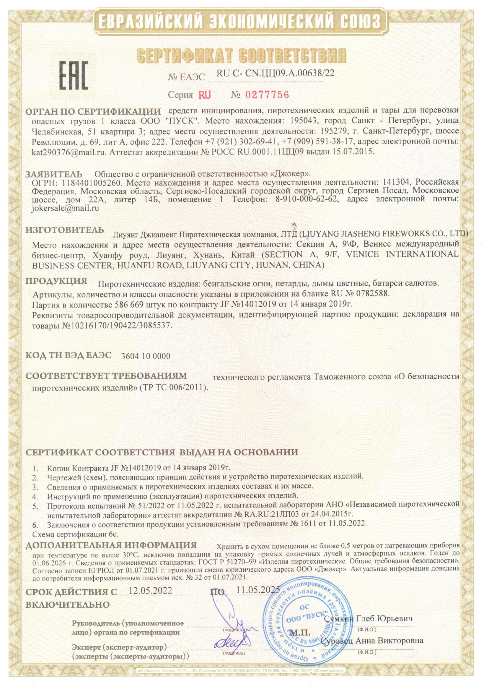 Срок годности всех пиротехнических изделий, представленных в магазине: до 2026 - 2028 года (срок годности конкретного изделия Вы можете уточнить у оператора)