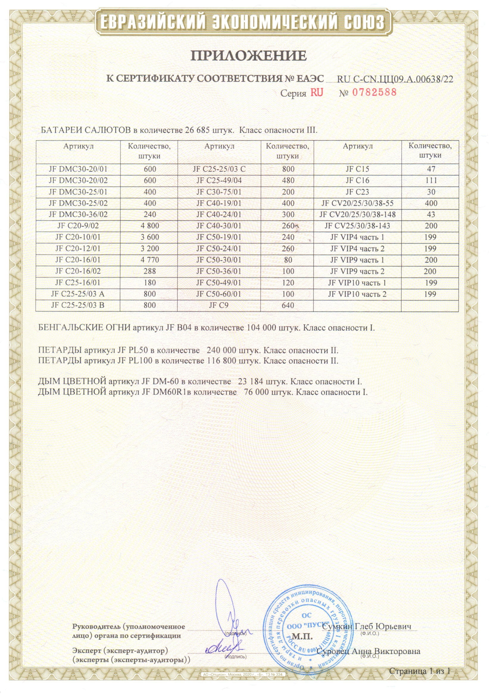 1. Трещащая пальма с кометой. 2. Серебряная пальма с красно-зелёным мерцанием. 3. Разноцветный салют с треском и кометой. 4. Зелёная ива с мерцанием и кометой. 5. Красная ива с мерцанием и кометой. 6. Серебряная ива с мерцанием и кометой. 7. Красная пальма с треском и кометой. 8. Зелёная пальма с треском и кометой. 9. Цветная пальма с треском и кометой. 10. Опадающий купол с красным мерцанием.