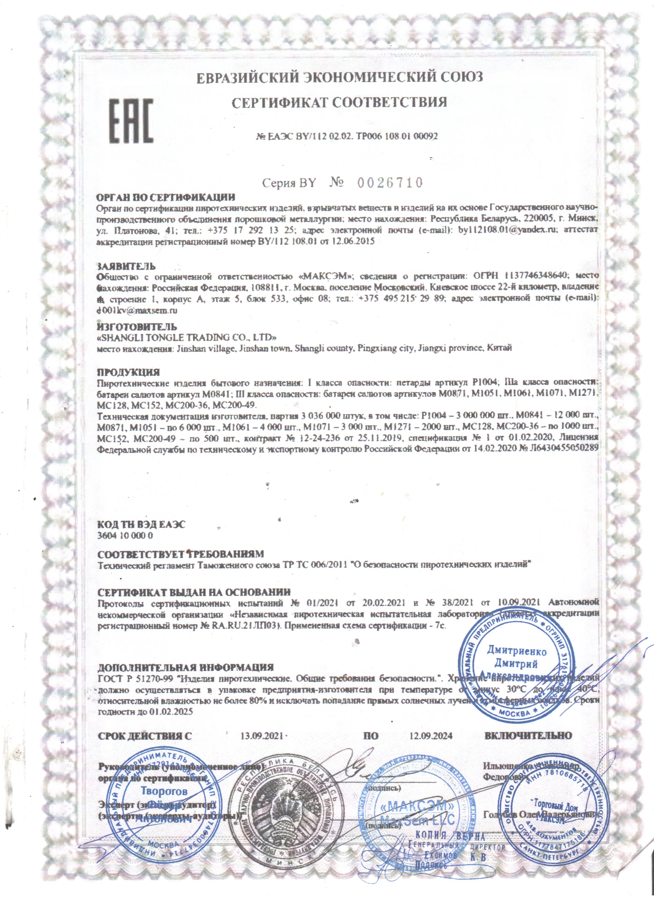 Срок годности всех пиротехнических изделий, представленных в магазине: до 2026 - 2028 года (срок годности конкретного изделия Вы можете уточнить у оператора)