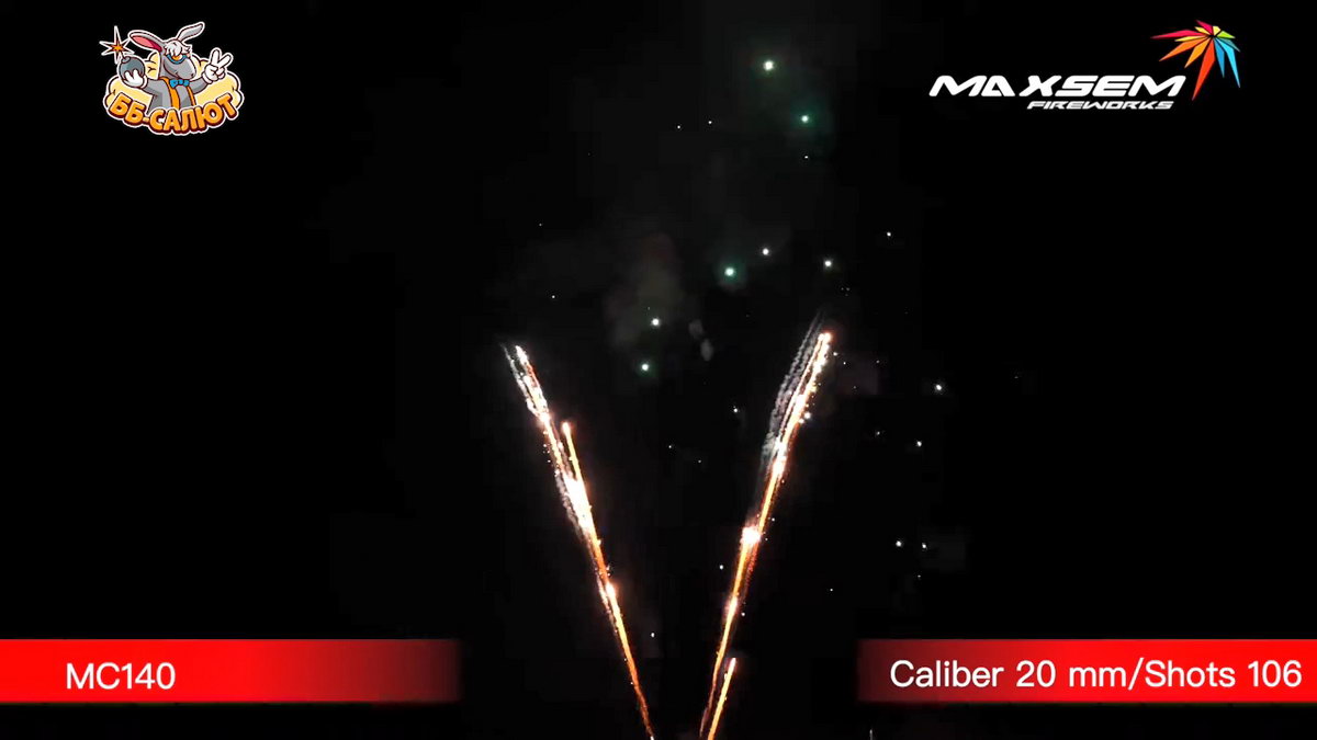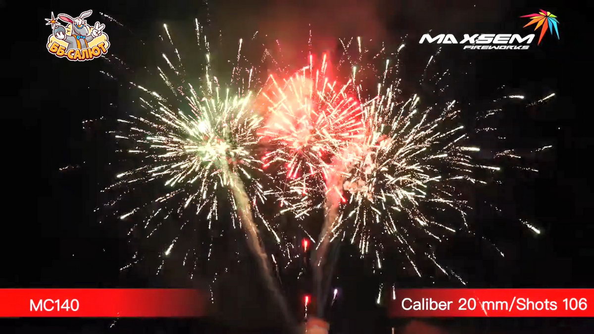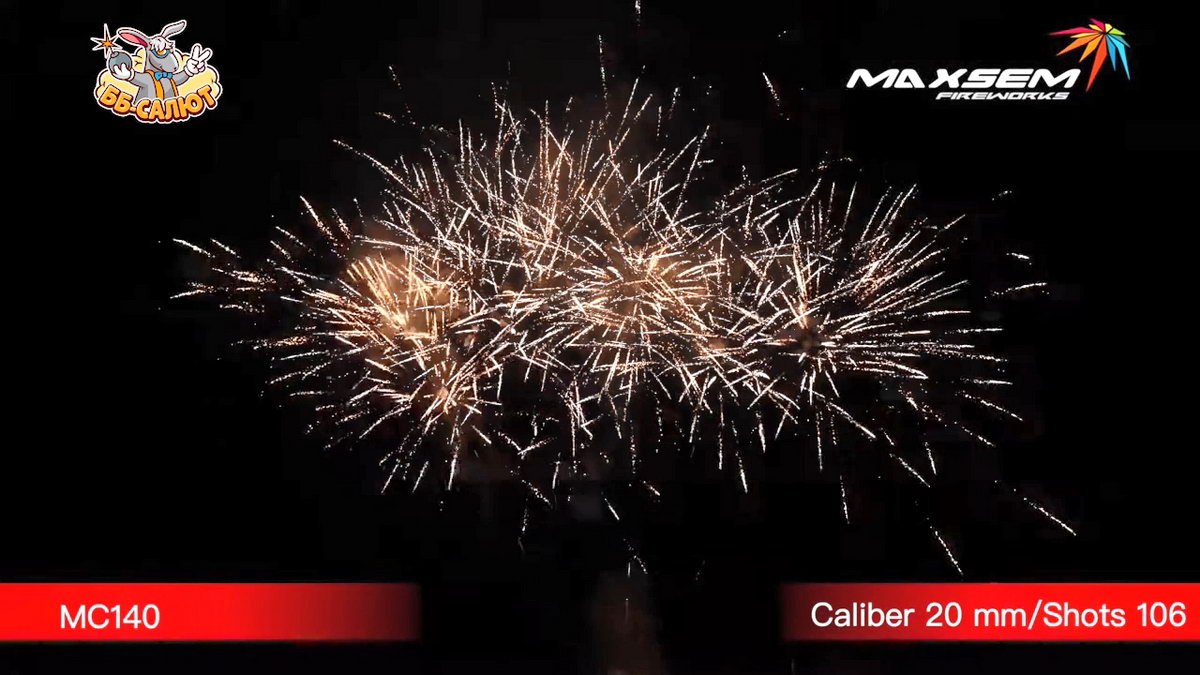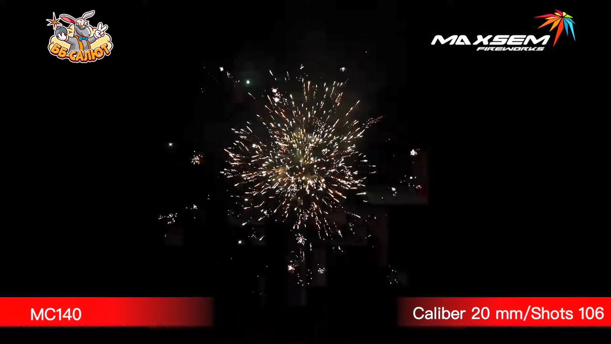 1. Белая пушистая волна с мерцанием. 2. Золотые кометы с хвостом. 3. Золотые парчовые короны. 4. Бело-зеленое мерцание. 5. Финал: Желто-зеленые пионы с красным мерцанием.