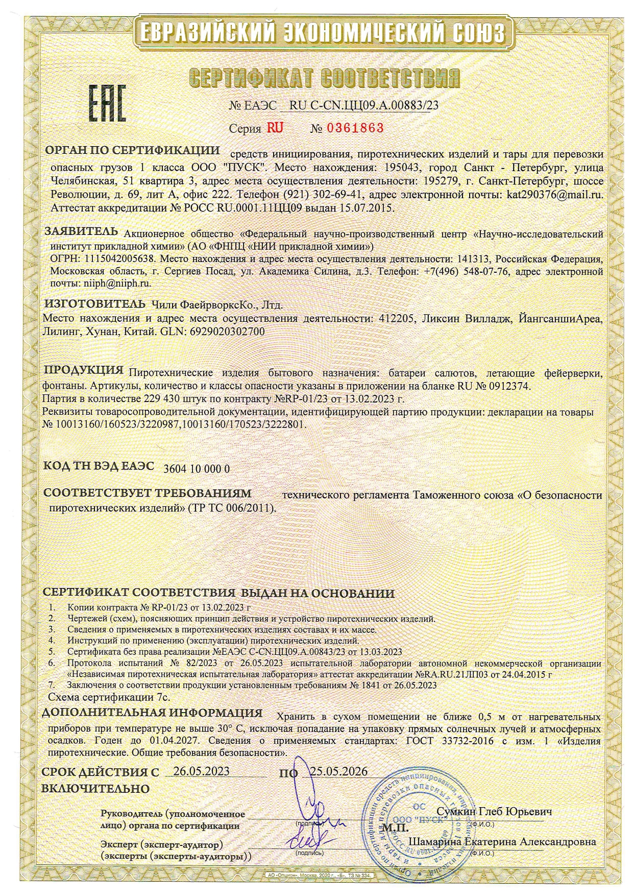 Магазин фейерверков ББ-Салют предоставляет гарантию на весь ассортимент интернет-магазина и розничных магазинов ББ-Салют! Мы торгуем пиротехникой самых лучших, проверенных торговых марок. Все изделия сертифицированы для продажи на территории России и имеют актуальный срок годности.