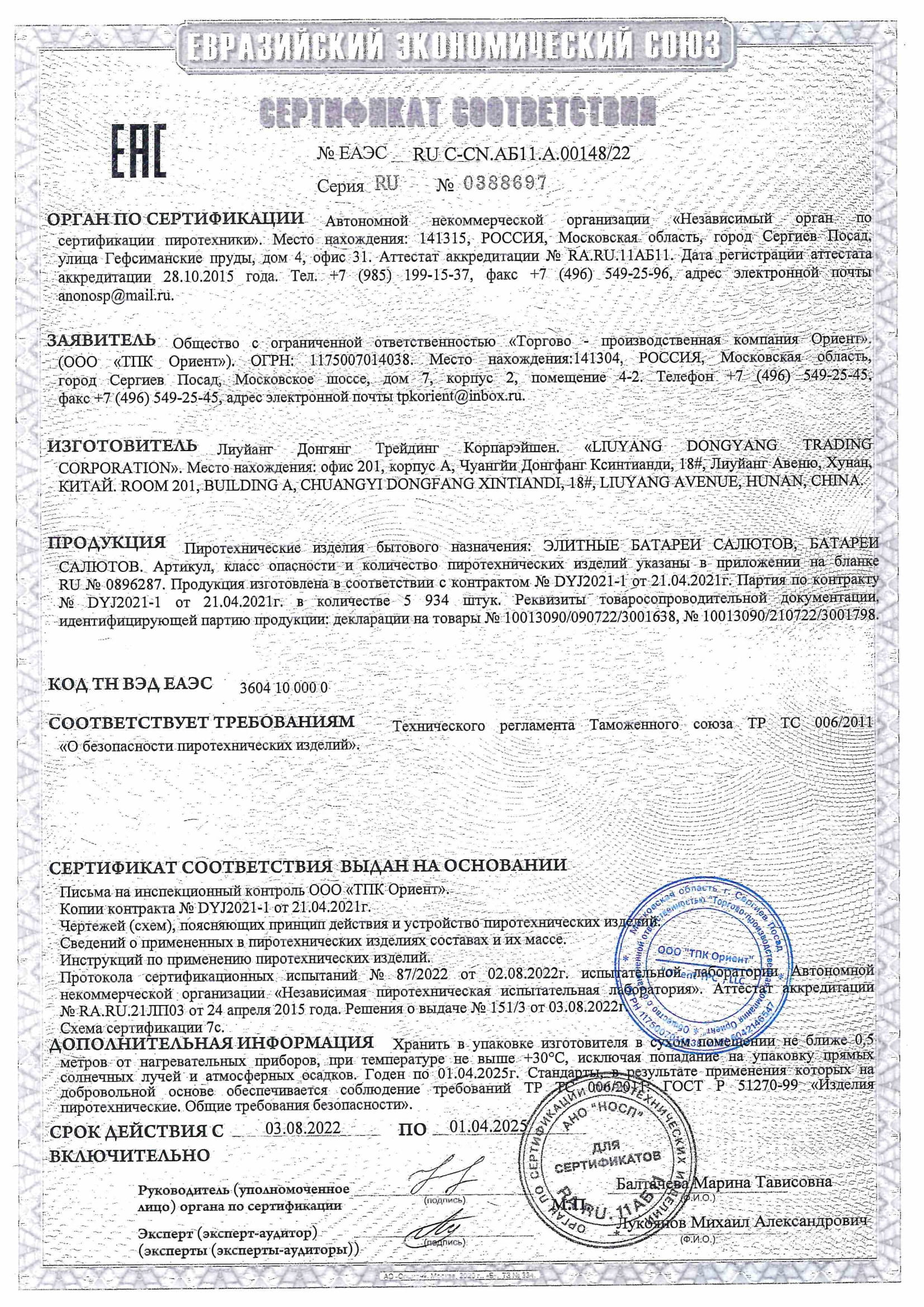 Магазин фейерверков ББ-Салют предоставляет гарантию на весь ассортимент интернет-магазина и розничных магазинов ББ-Салют! Мы торгуем пиротехникой самых лучших, проверенных торговых марок. Все изделия сертифицированы для продажи на территории России и имеют актуальный срок годности.
