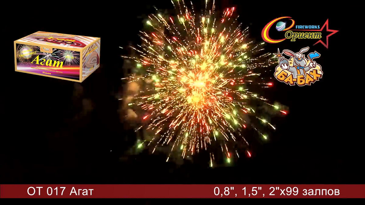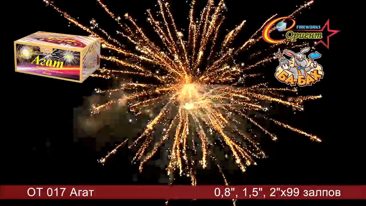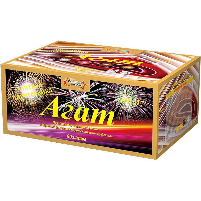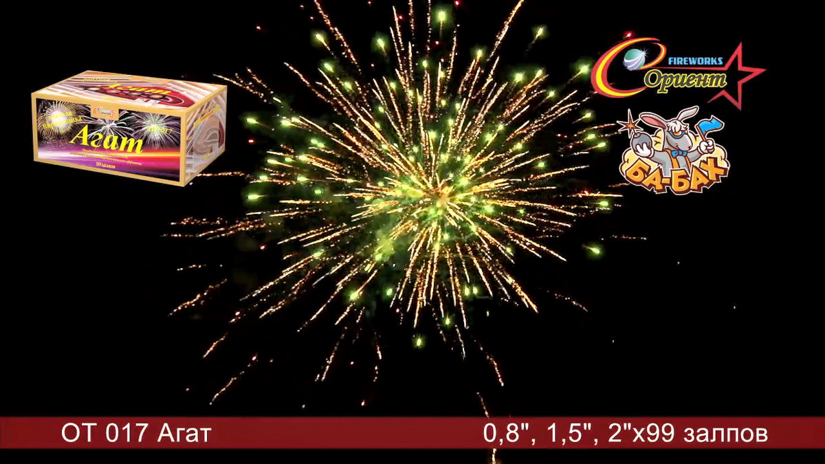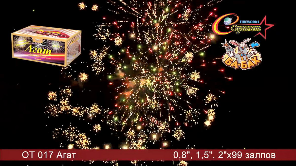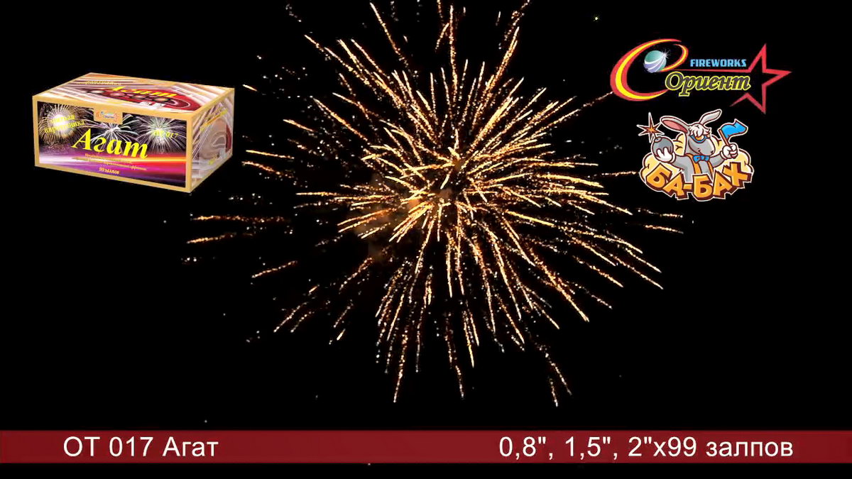 Пальмы, пионы, хризантемы с мерцанием и треском, кроссеты различных цветов, и непременно - яркая концовка с парчовыми элементами. Не один эффект не повторяется дважды! Салют даже не двух, а ТРЕХуровневый - каждый залп как бы постепенно раскрывается, как распускающийся экзотический цветок. Кроме этого, "Агат" является мультикалиберным салютом, т.е. выстреливают залпы различного калибра, что делает салют еще более красивым и разнообразным.