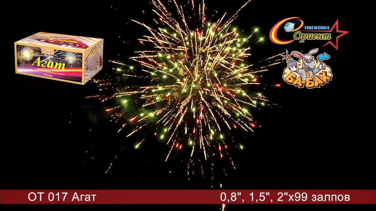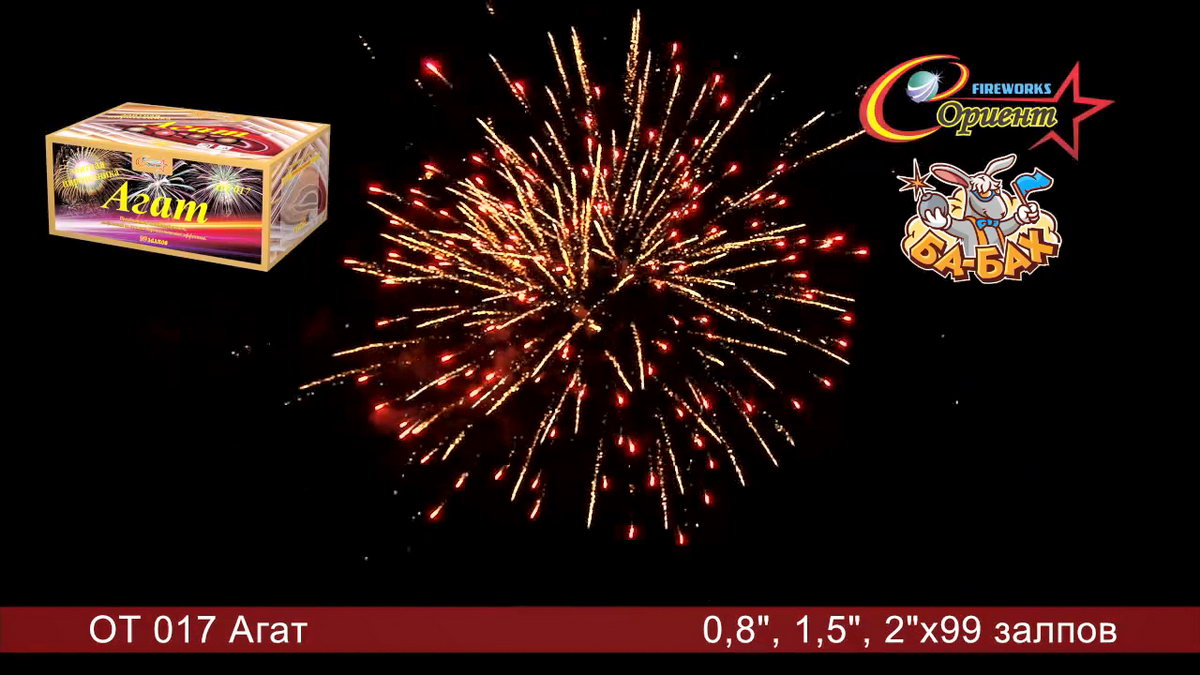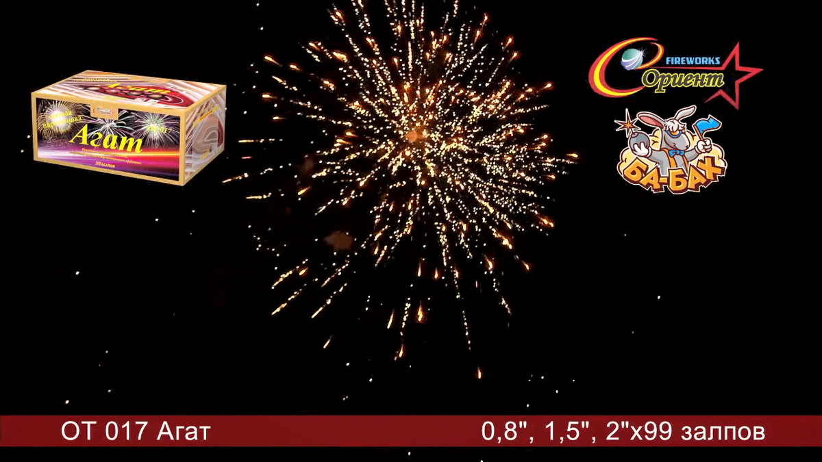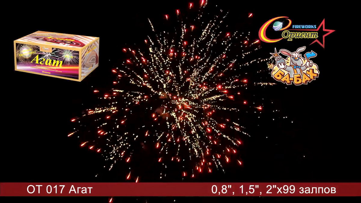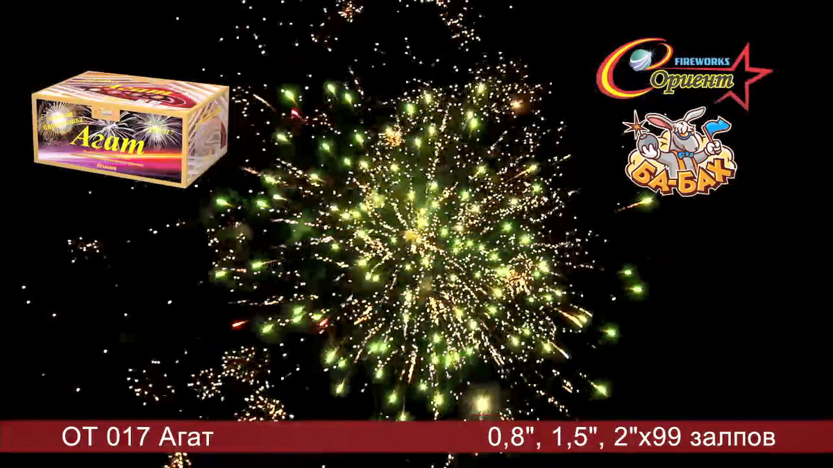 Пальмы, пионы, хризантемы с мерцанием и треском, кроссеты различных цветов, и непременно - яркая концовка с парчовыми элементами. Не один эффект не повторяется дважды! Салют даже не двух, а ТРЕХуровневый - каждый залп как бы постепенно раскрывается, как распускающийся экзотический цветок. Кроме этого, "Агат" является мультикалиберным салютом, т.е. выстреливают залпы различного калибра, что делает салют еще более красивым и разнообразным.