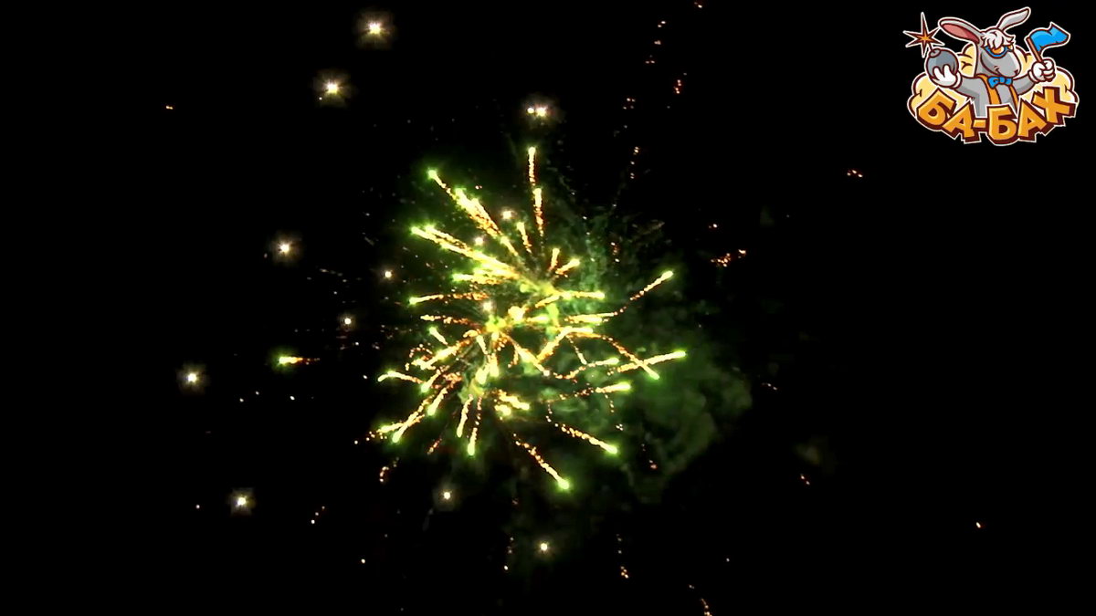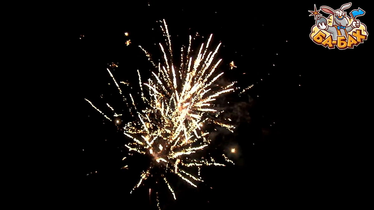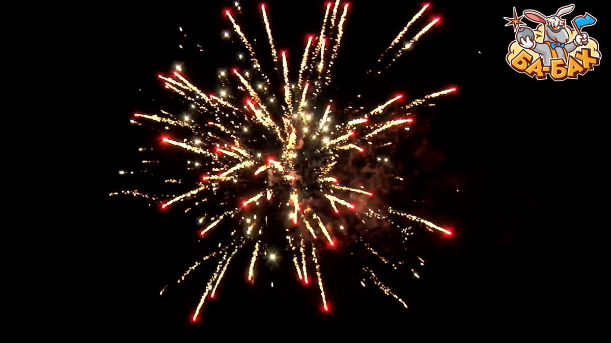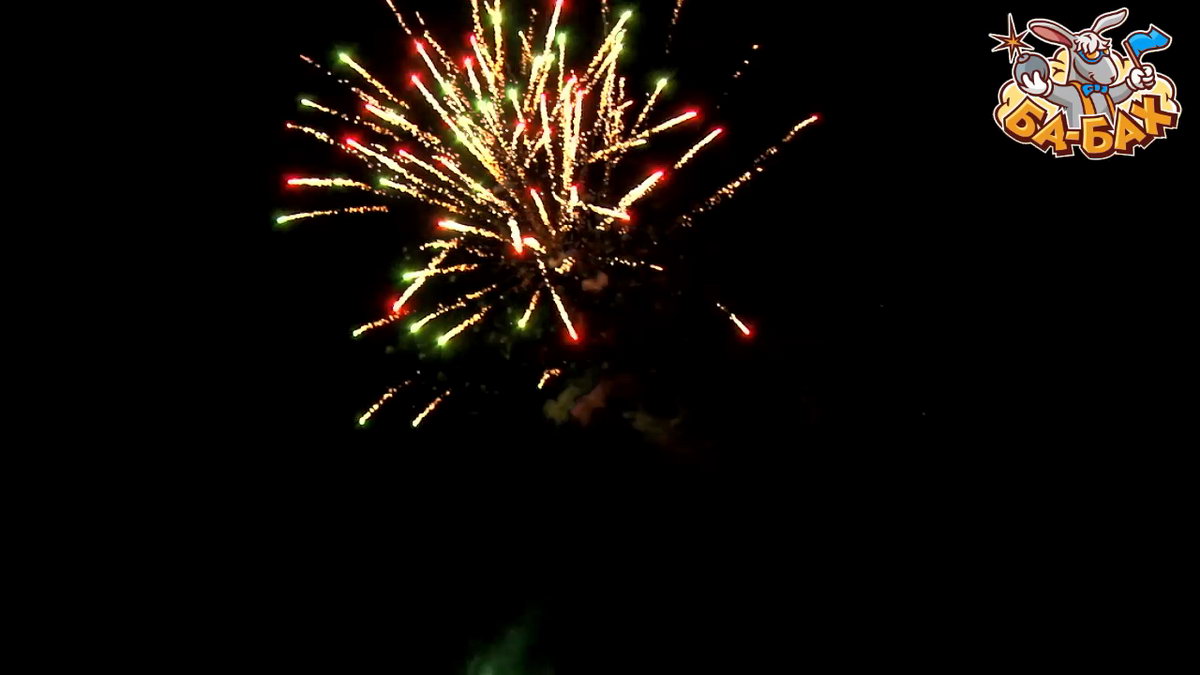 1. Салют из красных, зеленых, серебряных хризантем с мерцанием. 2. Золотые трещащие мерцающие огни.