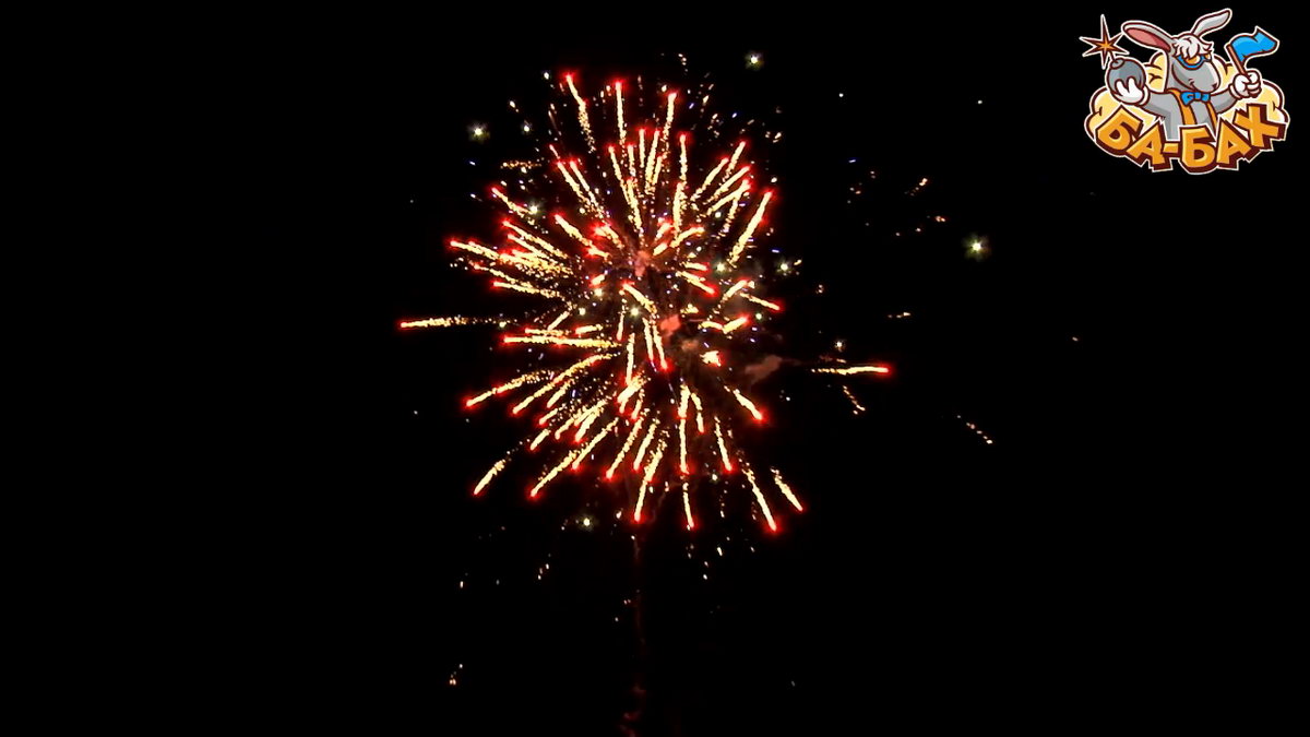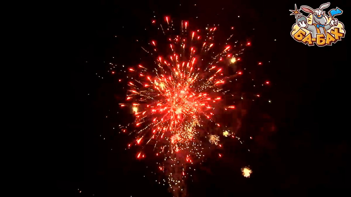 1. Салют из красных хризантем с синими, серебряными, пурпурными огнями и золотыми мерцаниями. 2. Красные мерцающие пионы с золотым треском.