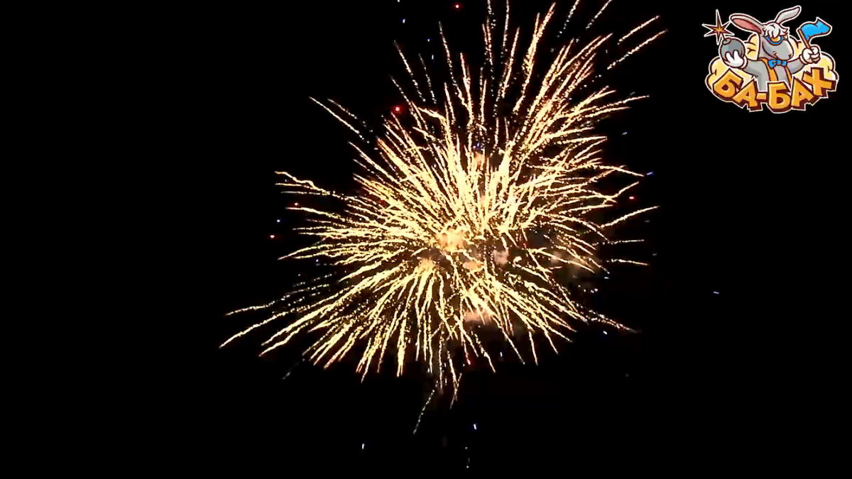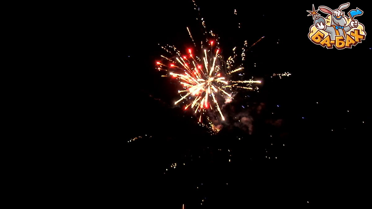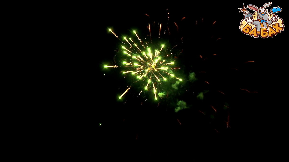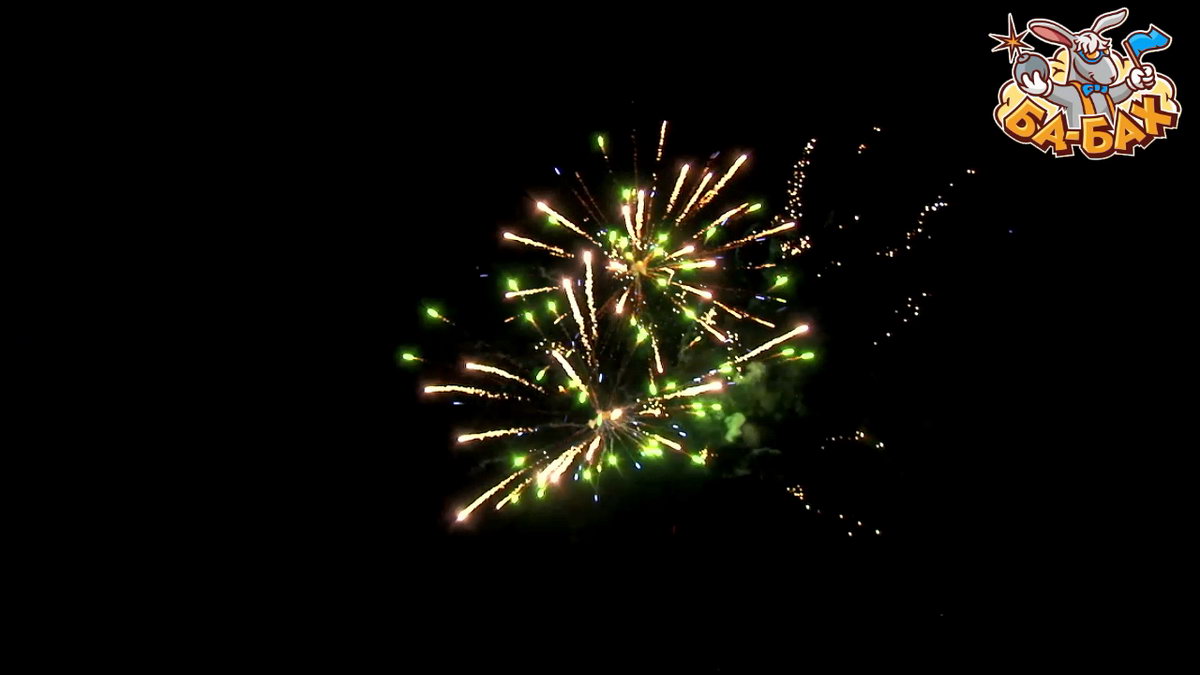 1. Салют из красных и зеленых хризантем с золотым мерцанием. 2. Залпы из серебряных хризантем с треском и мерцанием.