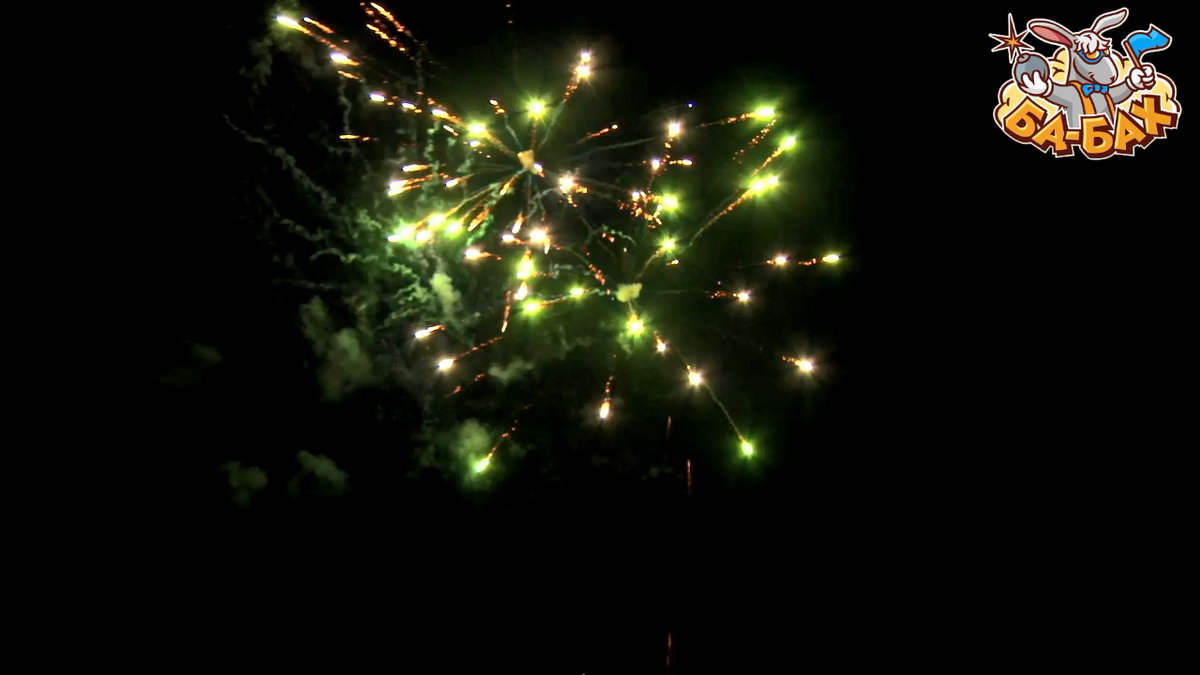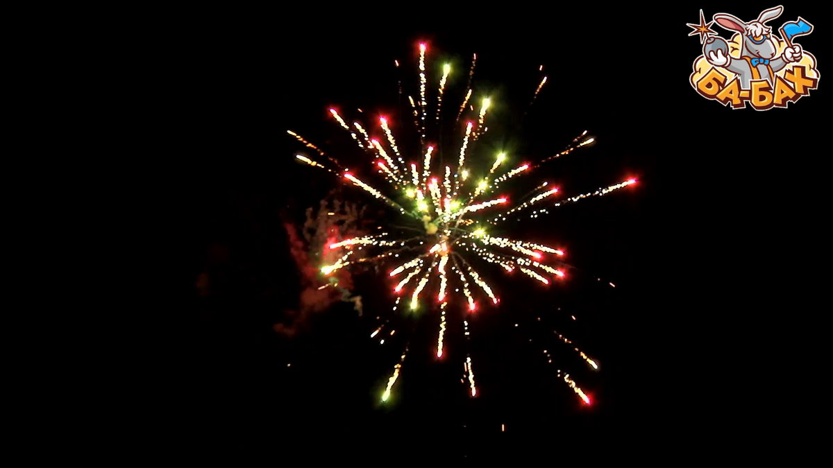 1. Салют из красных, зеленых, серебряных хризантем с треском, мерцанием и свистом. 2. Желтые, зеленые, белые, синие мерцающие пионы.