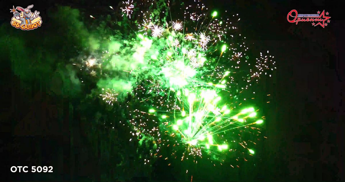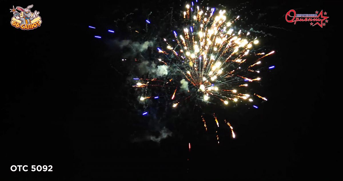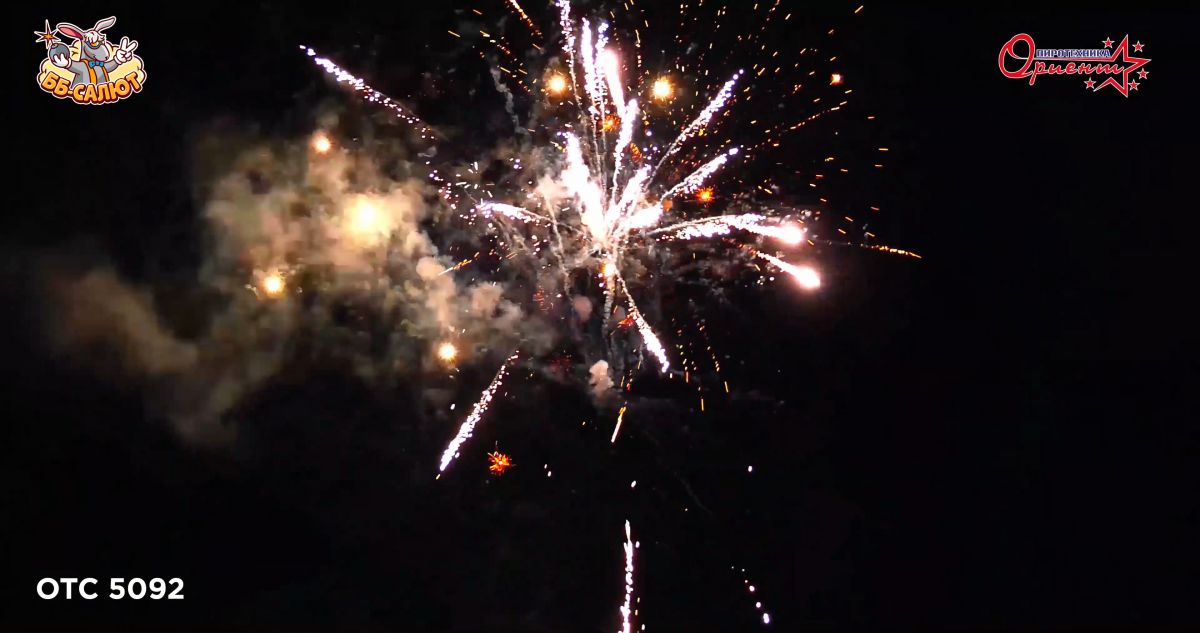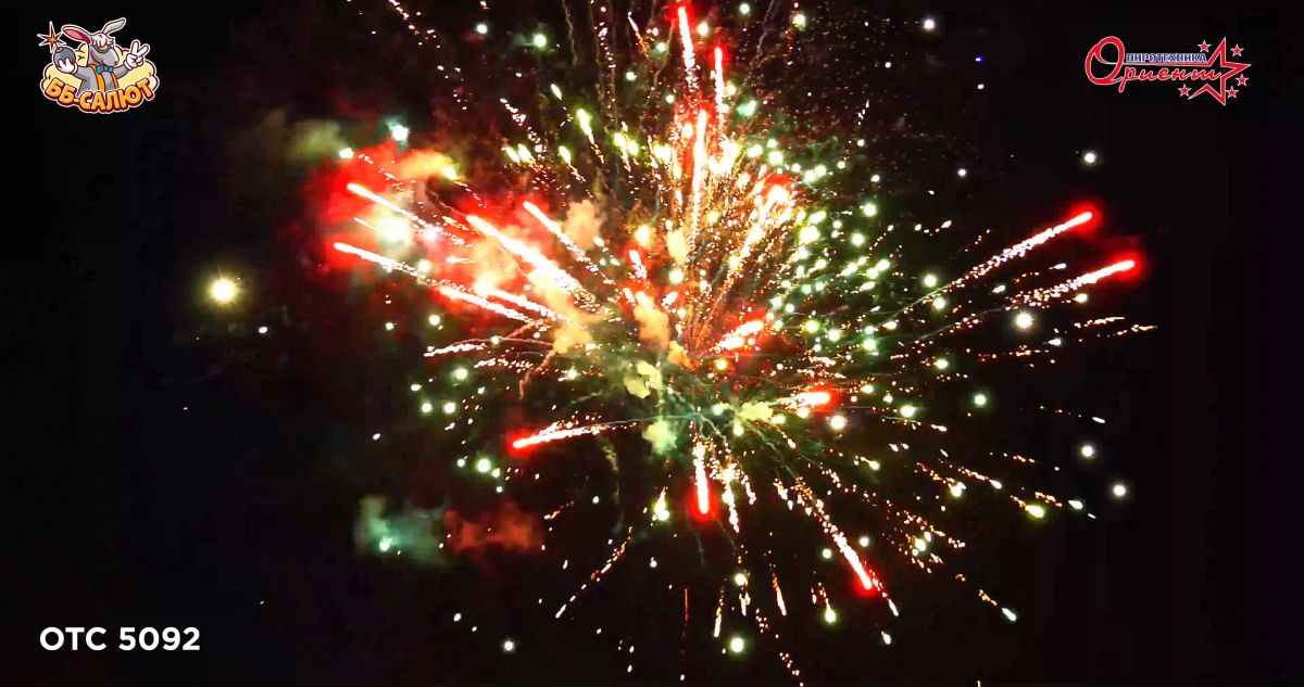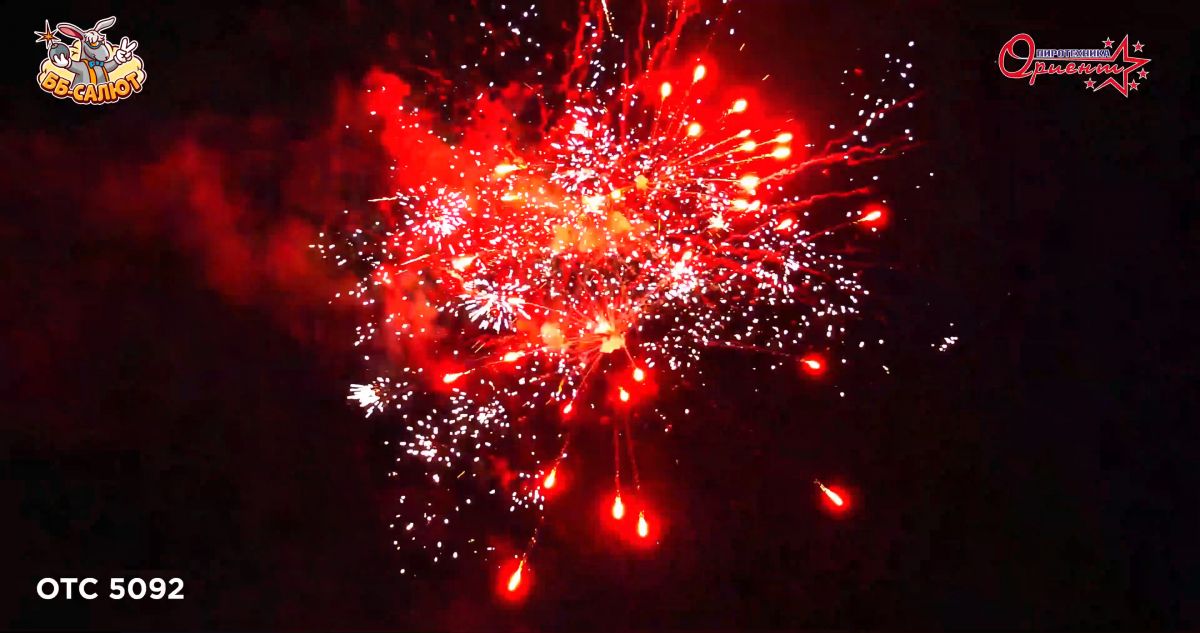 1. Салют из синих звезд с серебряными мерцаниями. 2. Красные пальмы с зелеными мерцаниями и золотым дождем. 3. Трещащих кометы. 4. Серебряные хризантемы с треском. 5. Красные кометы с золотыми хризантемами.