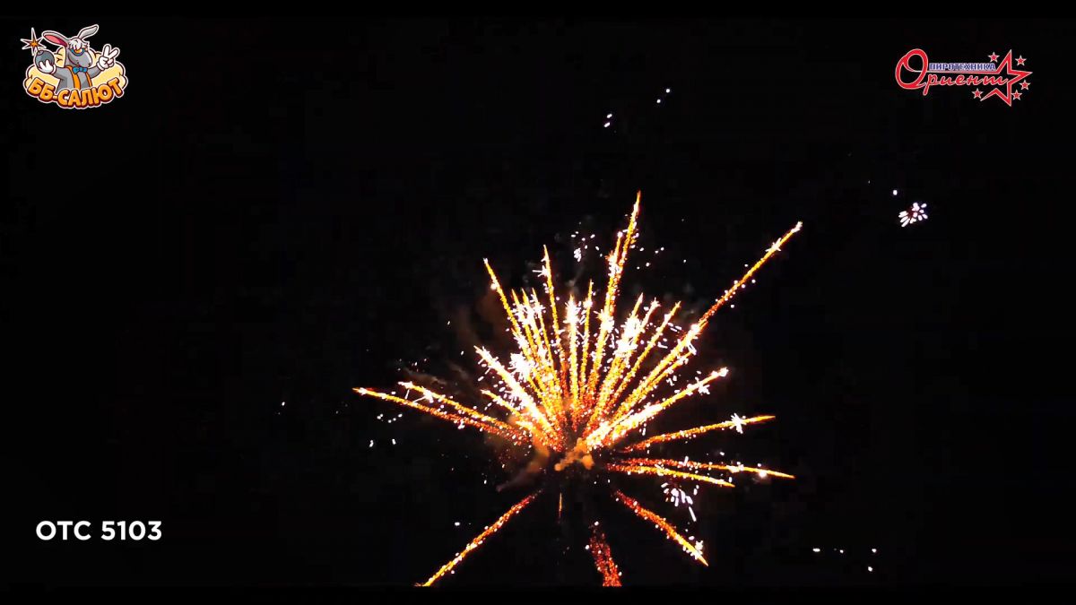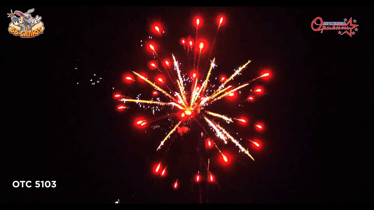 1. Салют из золотых трещащих ив с красными звездами. 2. Трещащие кометы. 3. Зеленые огни с треском. 4. Красные пальмы с золотым трещащим облаком.