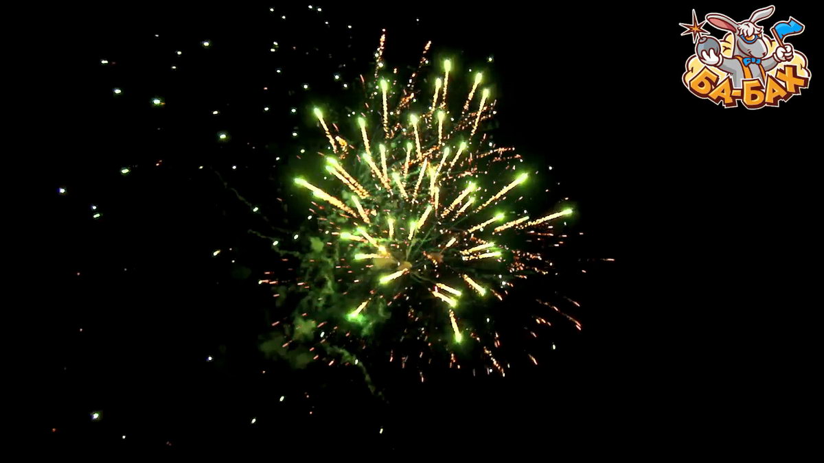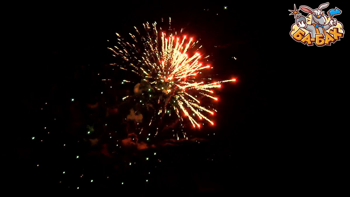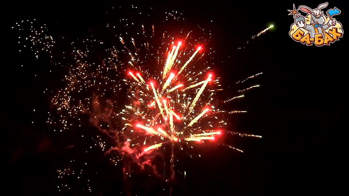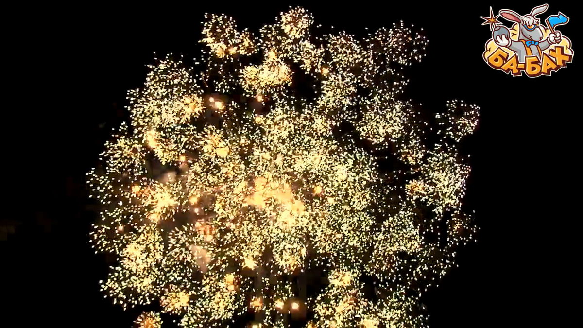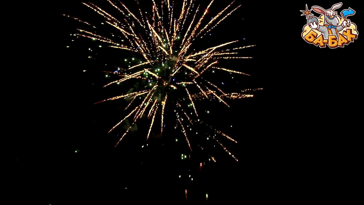 1. Салют из золотых хризантем с красными, зелеными, синими огнями с мерцанием и треском.