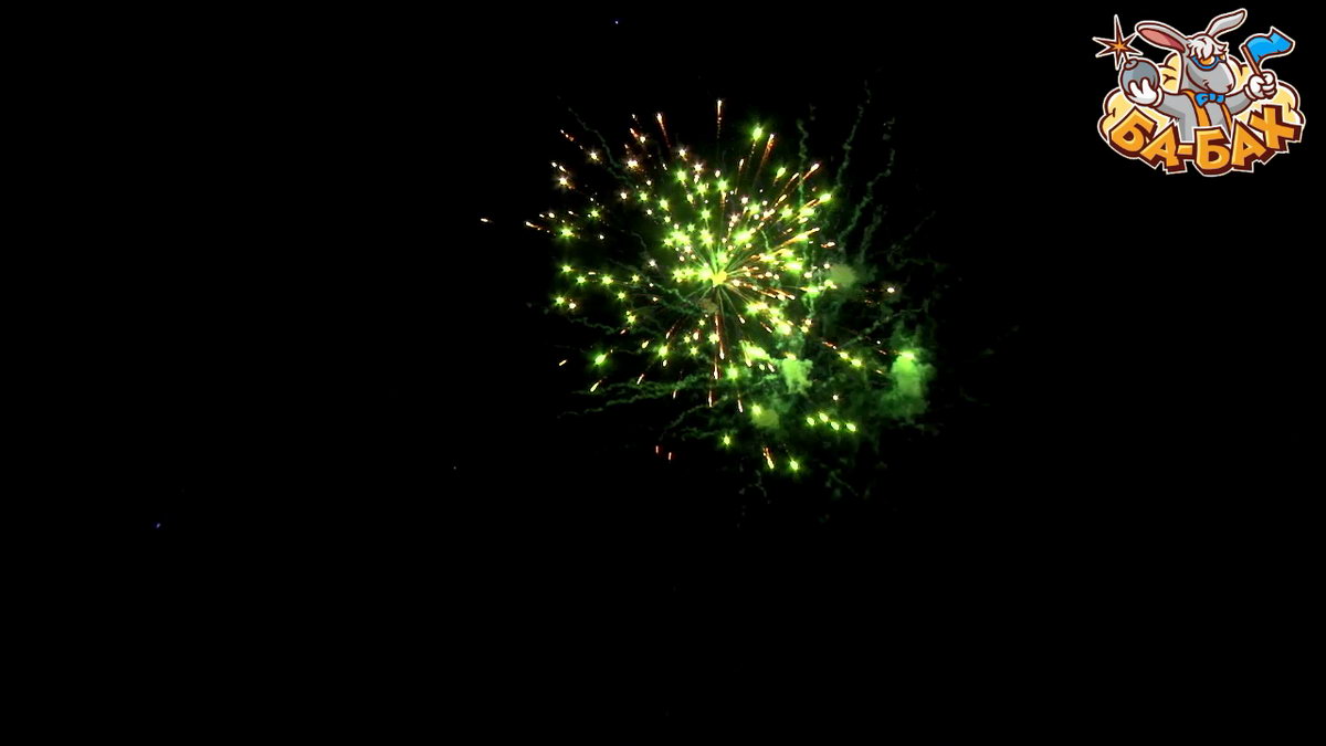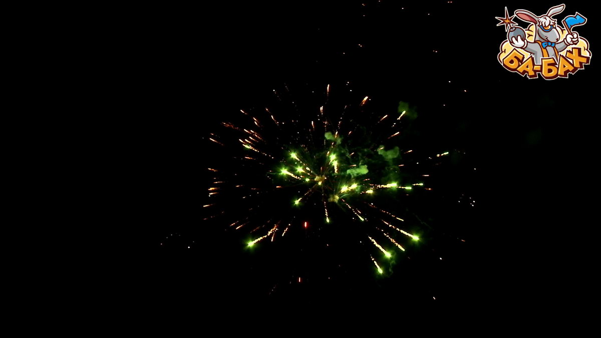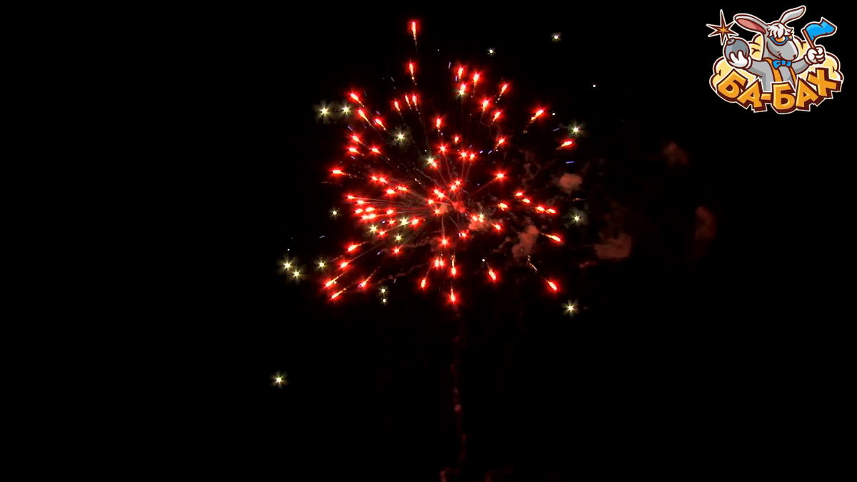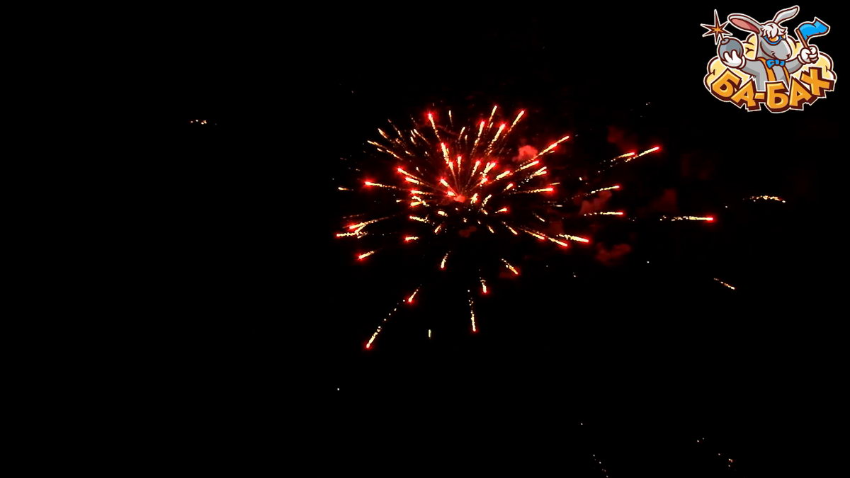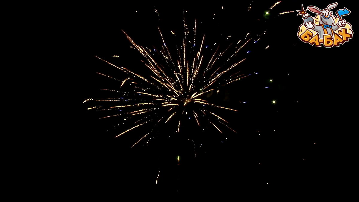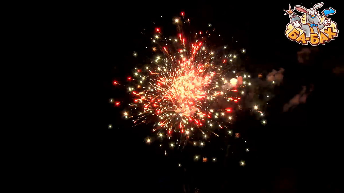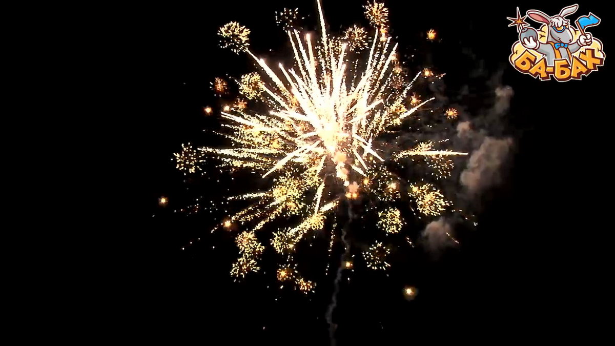 1. Салют из разноцветных пионов с белым мерцанием. 2. Золотые трещащие пальмы и хризантемы с красными и зелеными огнями. 3. Золотые ивы с синими звездами.