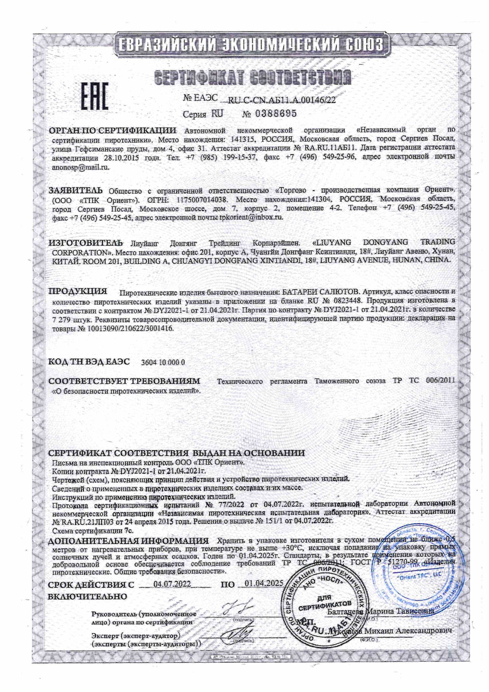 - Обратите внимание, что при покупке фейерверка Вы несете полную ответственность за соблюдение правил хранения, техники безопасности и инструкции по запуску изделия!