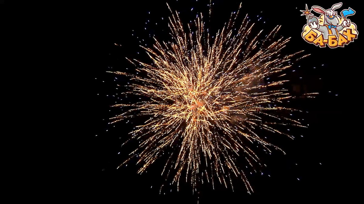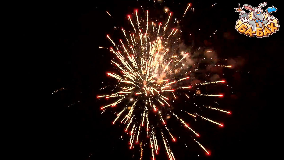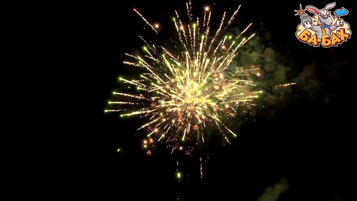1. Салют из красных, зеленых, серебряных пальм с треском и мерцанием, переходящих в золотые трещащие облака с синими огнями.