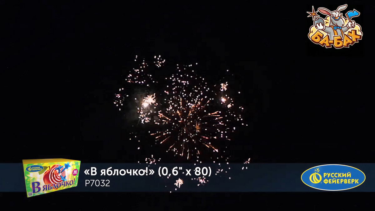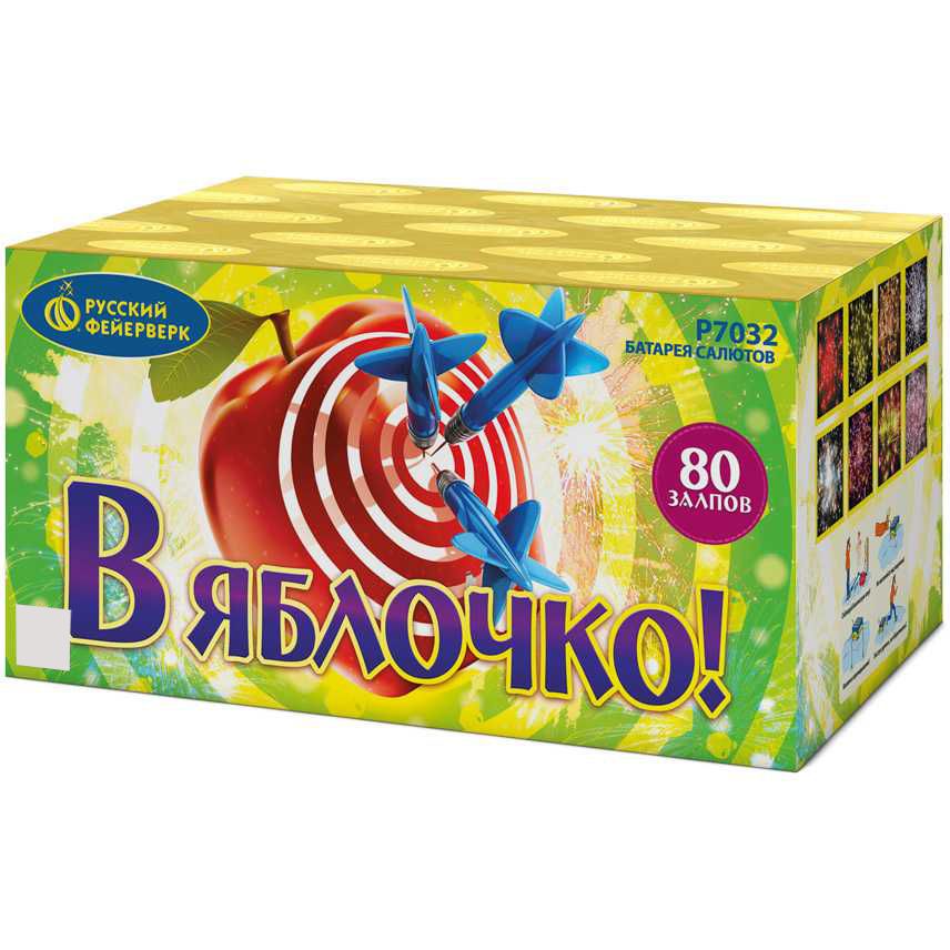 Красочный фейерверк В яблочко! включает в себя 8 ярких эффектов, которые раскроются на высоте 25 метров. Зрители увидят очаровательные разноцветные пионы: красные, желтые, белые, сине-желтые, зелено-фиолетовые. Некоторые будут сопровождаться шумным треском. Кульминацией шоу станет несколько залпов, которые раскроются красочными хризантемами, купающимися в большом трещащем облаке. Шоу сопровождается громкими выстрелами, яркими огнями и звонким треском, которые оставят море позитива!