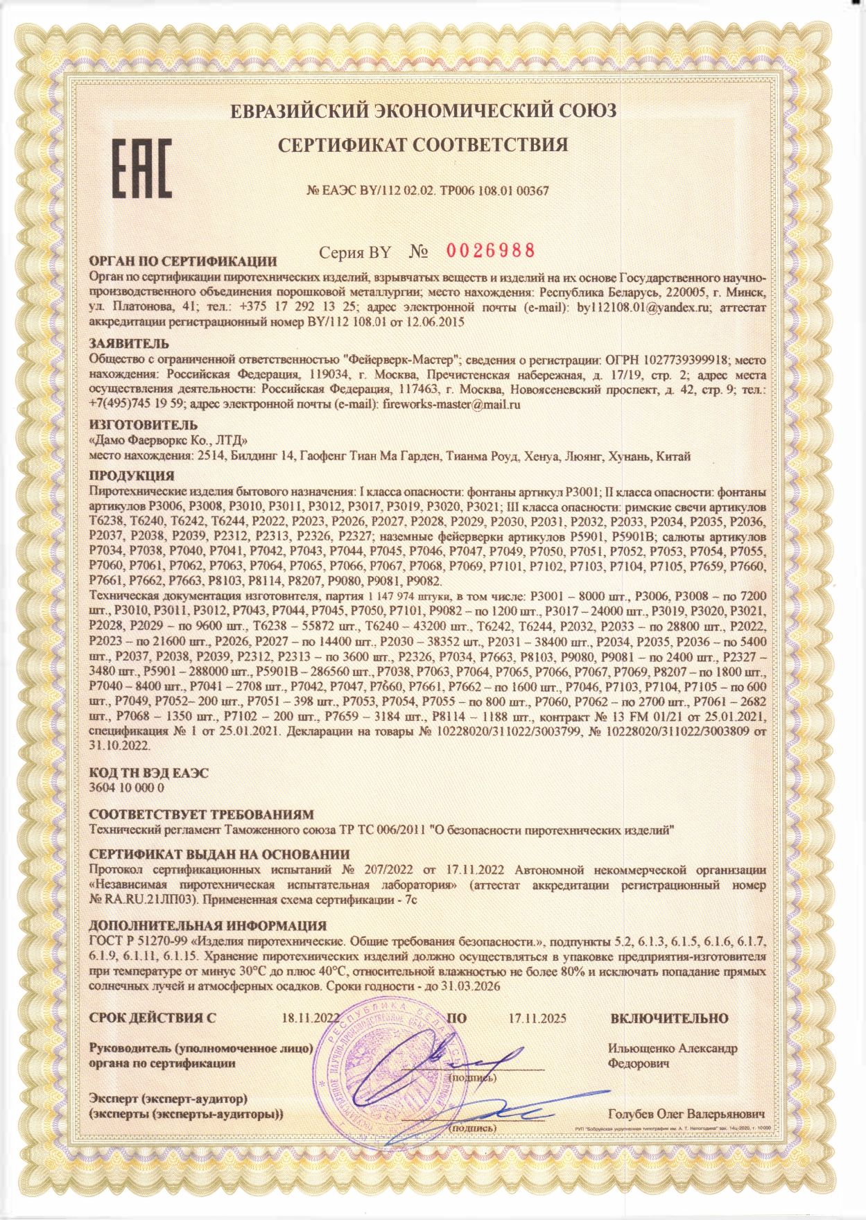 Магазин фейерверков ББ-Салют предоставляет гарантию на весь ассортимент интернет-магазина и розничных магазинов ББ-Салют! Мы торгуем пиротехникой самых лучших, проверенных торговых марок. Все изделия сертифицированы для продажи на территории России и имеют актуальный срок годности.