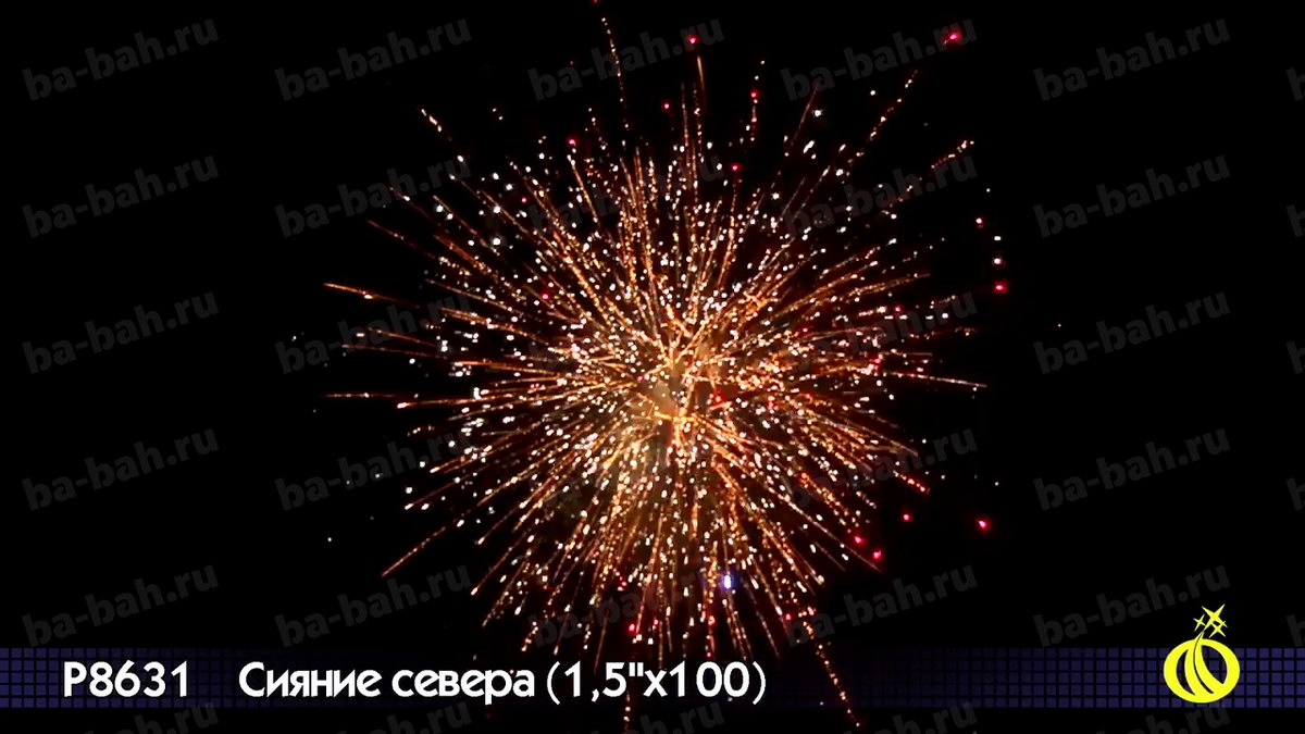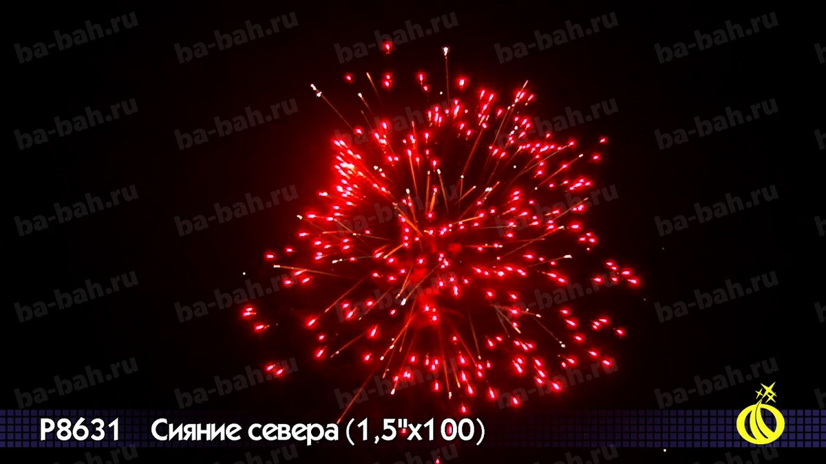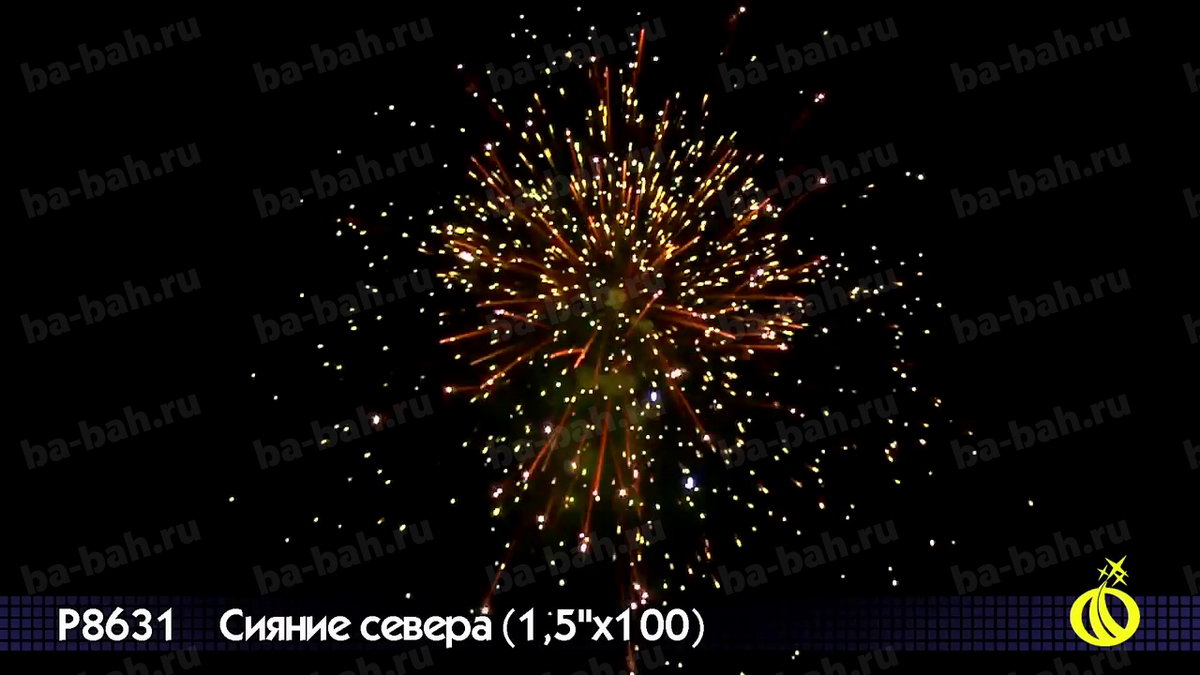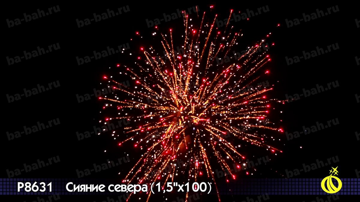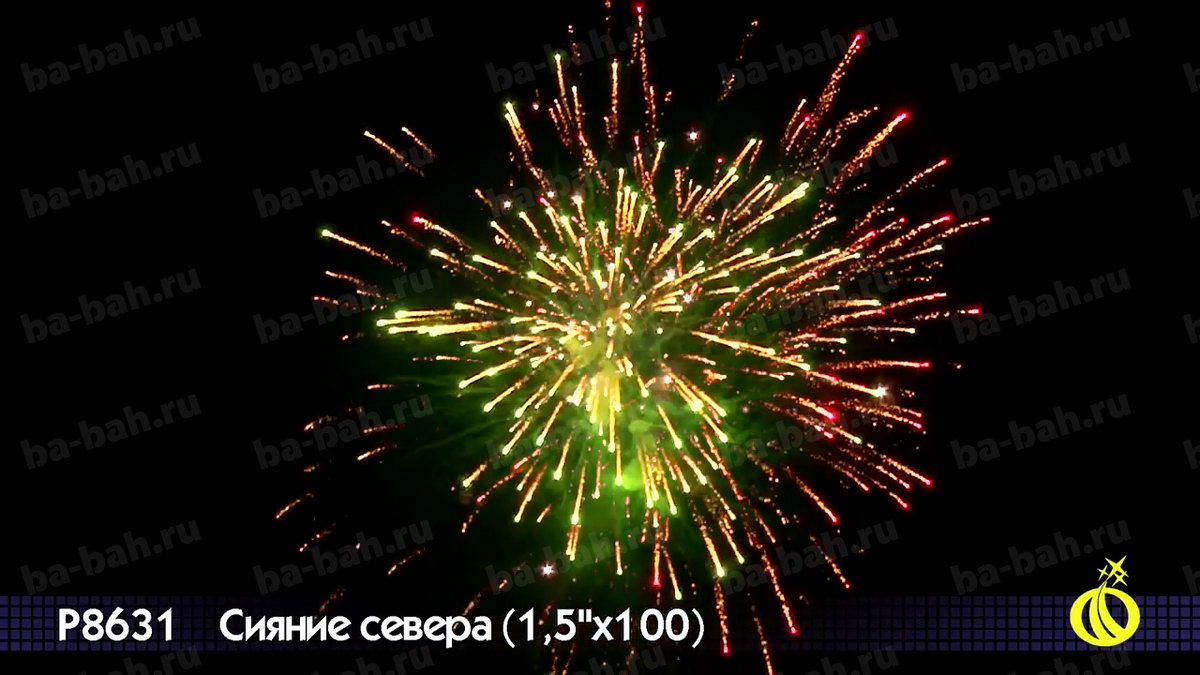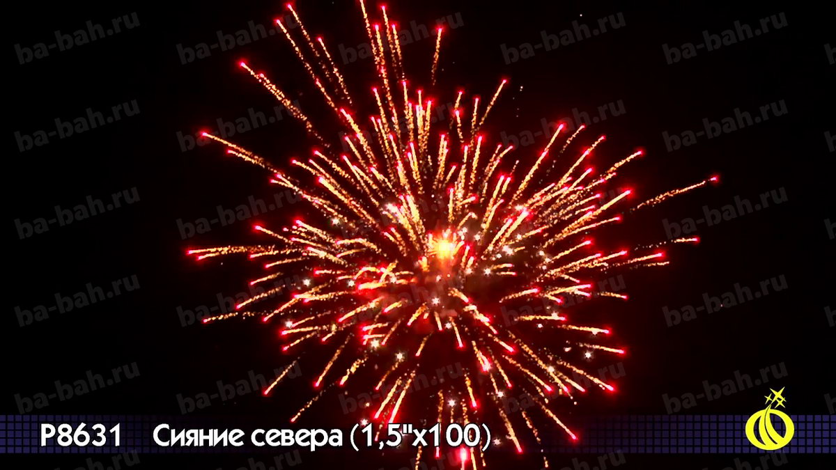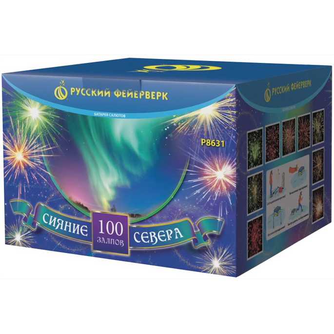 Невероятный по красоте и мощи салют "Сияние Севера" сочетает большой калибр - 1,5 дюйма (38 мм) - с большим числом залпов: целых 100 штук! Вас ждет захватывающее и долгое пиротехническое шоу с множеством эффектов: золотистые кометы