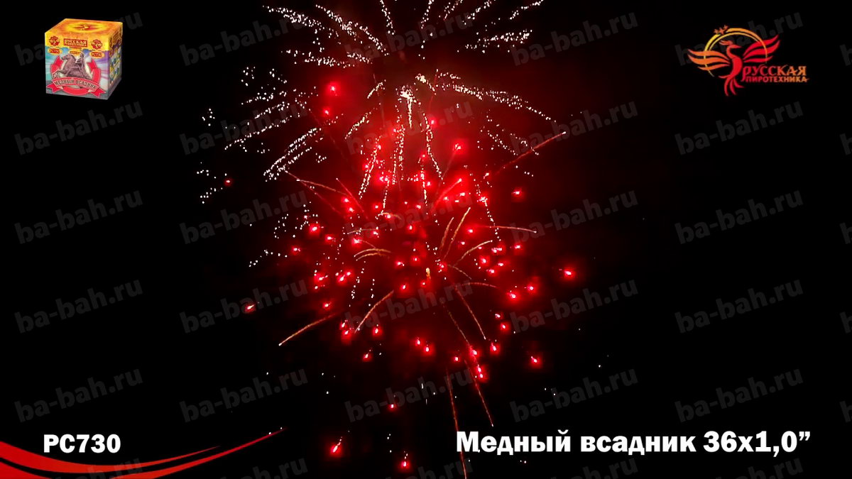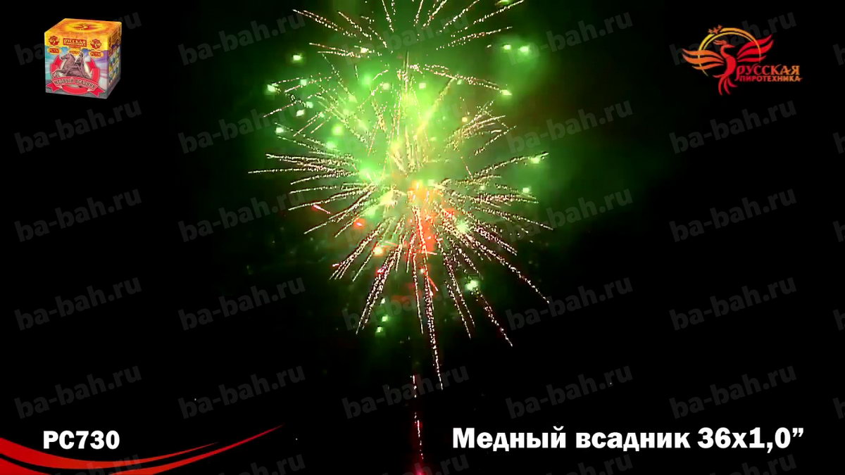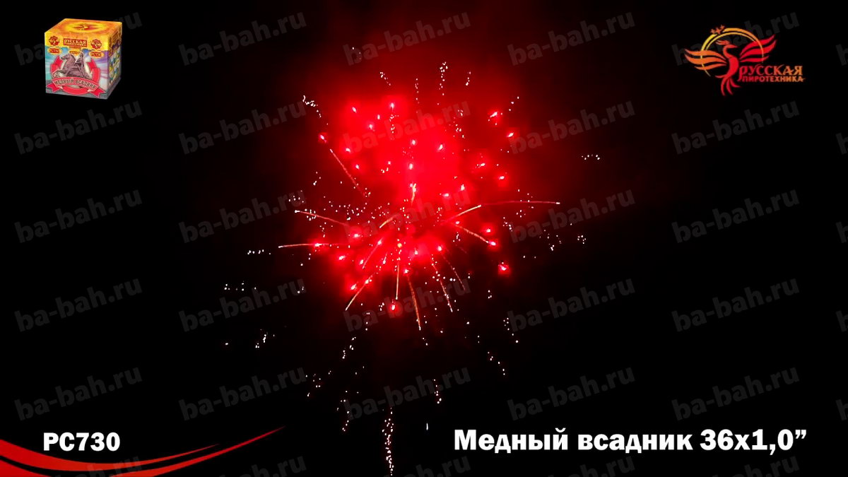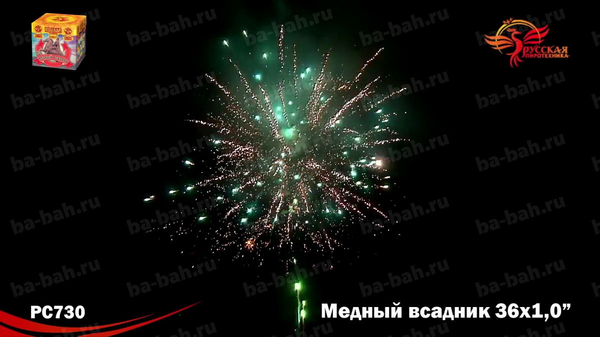 К новогоднему сезону 2013-2014 года известный производитель салютов "Русская Пиротехника" подошел во всеоружии. Было представлено очень много новинок, среди которых немало будущих хитов. Наверняка одним из этих хитов станет фейерверк "Медный всадник". Это первоклассная, очень красивая батарея на 36 зарядов, для которой были отобраны самые любимые эффекты российских покупателей: трещащие сферы ("тысяча хризантем"), мерцание, эффект парчи, рассыпающие искры золотые форсы, крупные разноцветные звезды - красные, зеленые и голубые. Не забыта и обязательная мощная концовка из нескольких залпов!