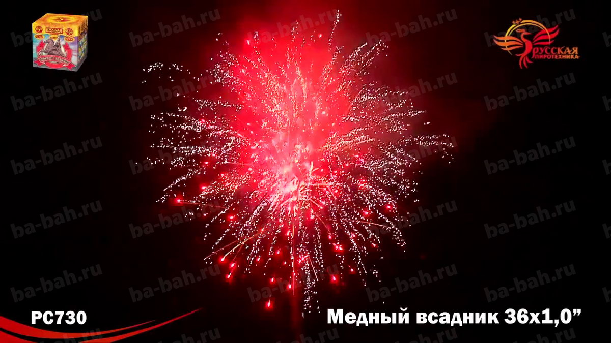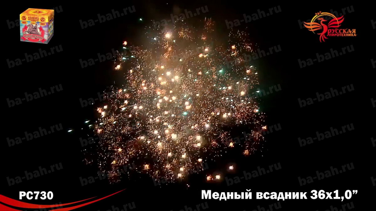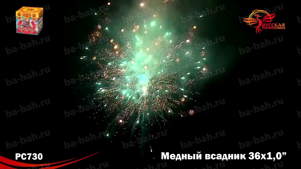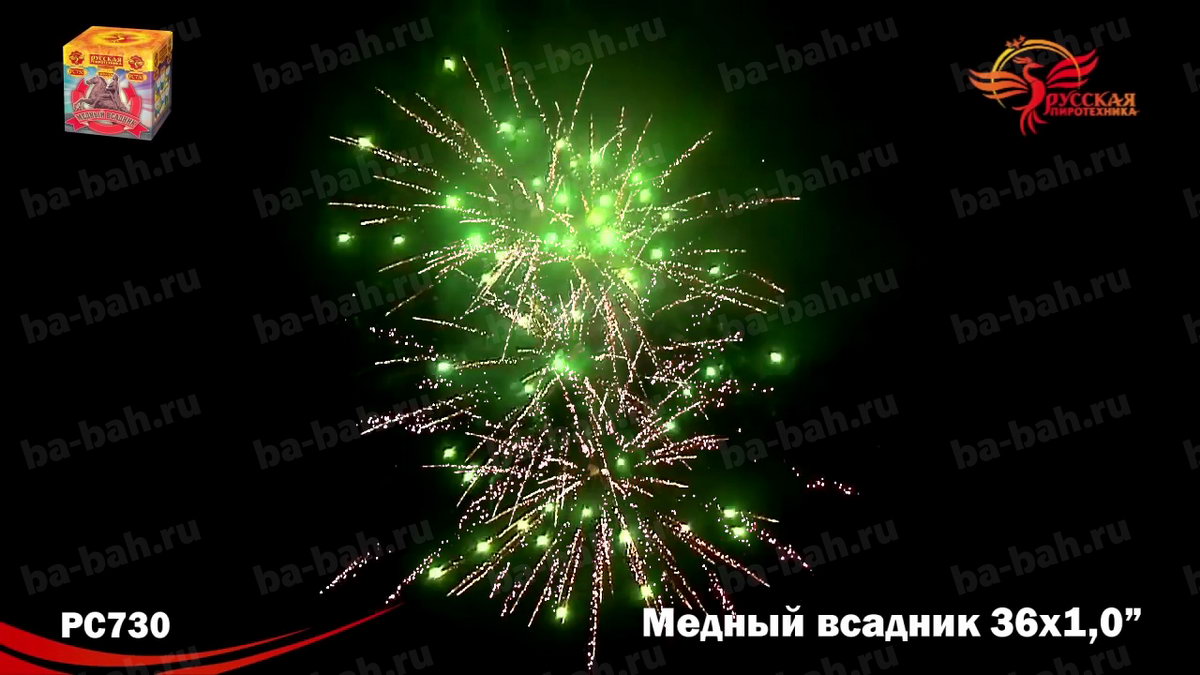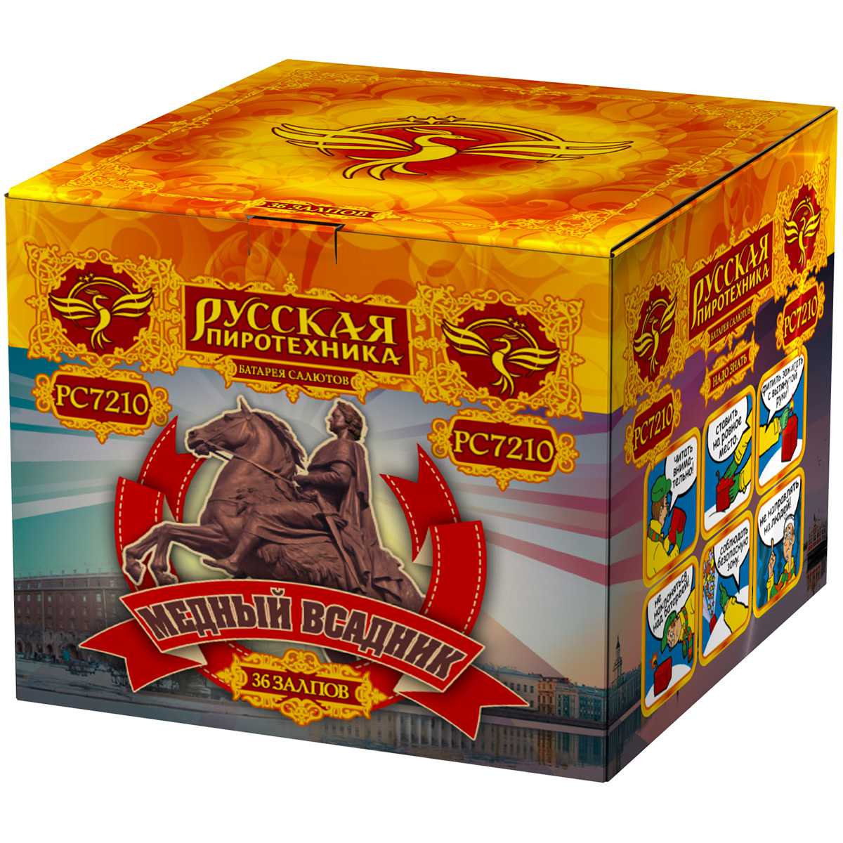 К новогоднему сезону 2013-2014 года известный производитель салютов "Русская Пиротехника" подошел во всеоружии. Было представлено очень много новинок, среди которых немало будущих хитов. Наверняка одним из этих хитов станет фейерверк "Медный всадник". Это первоклассная, очень красивая батарея на 36 зарядов, для которой были отобраны самые любимые эффекты российских покупателей: трещащие сферы ("тысяча хризантем"), мерцание, эффект парчи, рассыпающие искры золотые форсы, крупные разноцветные звезды - красные, зеленые и голубые. Не забыта и обязательная мощная концовка из нескольких залпов!