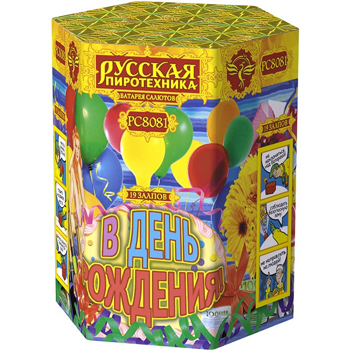Чтобы гарантировать имениннику хорошее настроение, приходите не с пустыми руками, а с коробочкой салюта! Это подарок, который всегда будет к месту, который гарантировано вызовет восхищенные возгласы. Разумеется, наиболее удачным выбором станет фейерверк "В день рождения", ведь помимо "правильного" названия, он содержит великолепные пиротехнические эффекты, а его цена не ляжет тяжким бременем на кошелек дарителя. Разноцветные кометы, взлетев высоко к небесам, расцветут роскошными двухцветными пионами: красными с синим, фиолетовыми с зеленым, красными с серебряным, голубыми с золотом. Залпы сопровождаются искристыми форсами, мерцанием и трещащими золотыми облаками.