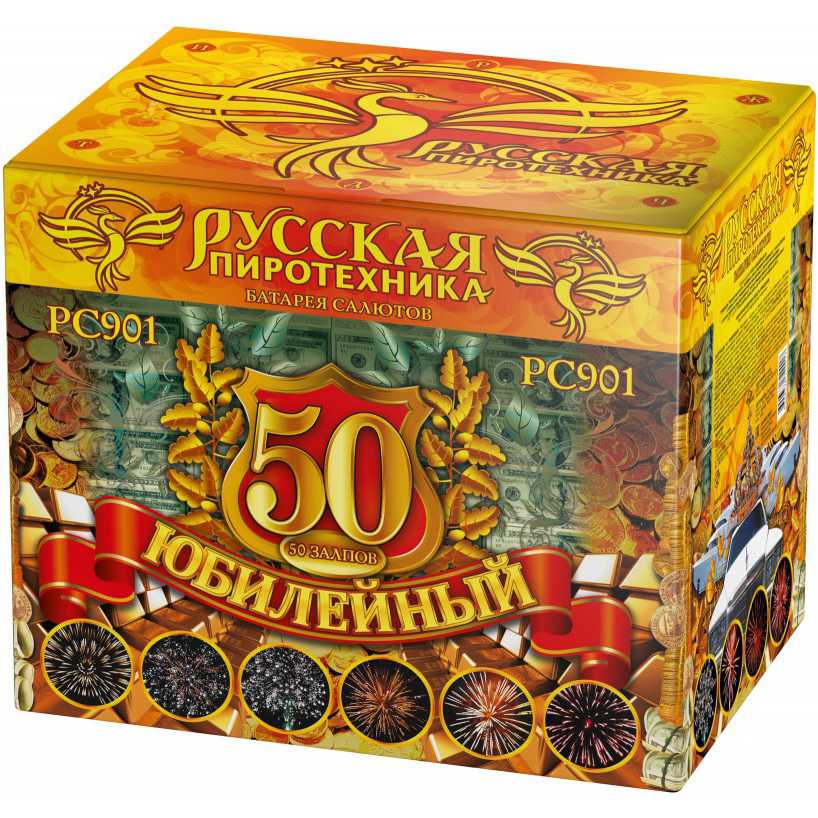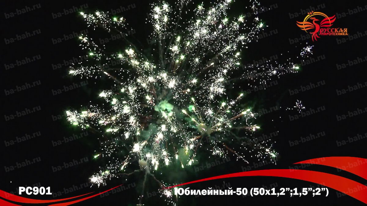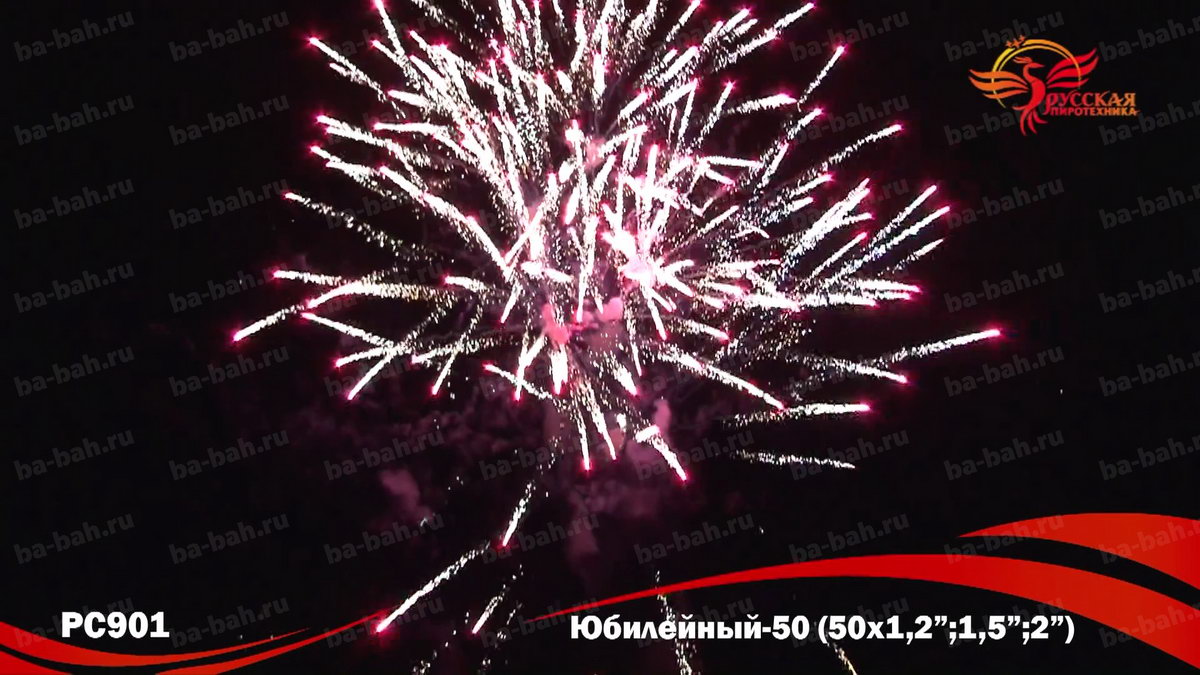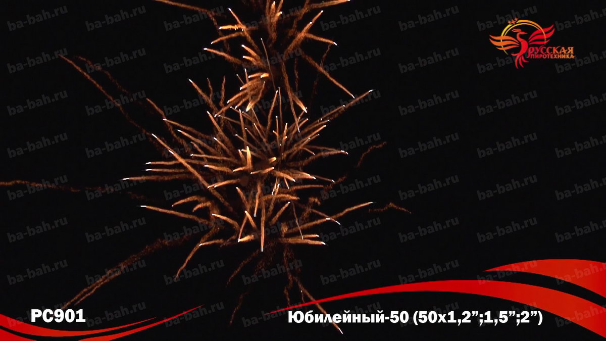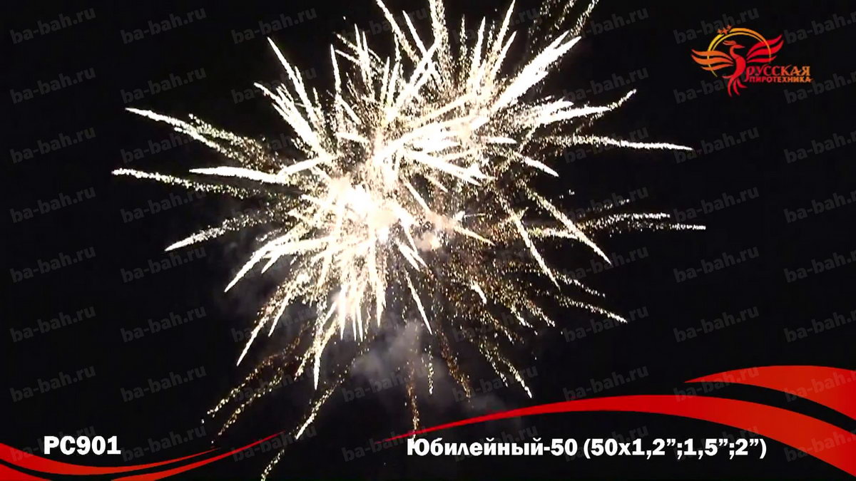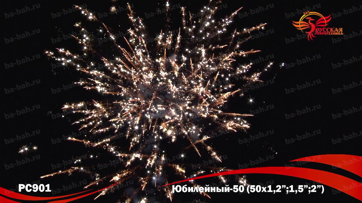 "Юбилейный-50" - мультикалиберный салют, т.е. в коробку упакованы салютные заряды различного диаметра. Это придает фейерверку еще большее разнообразие и красоту. Одним словом, этот салют - достойное зрелище для юбилея. Он оставит в немом восхищении и самого юбиляра, и его гостей!