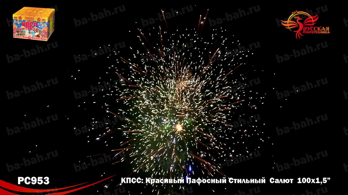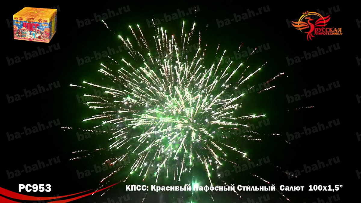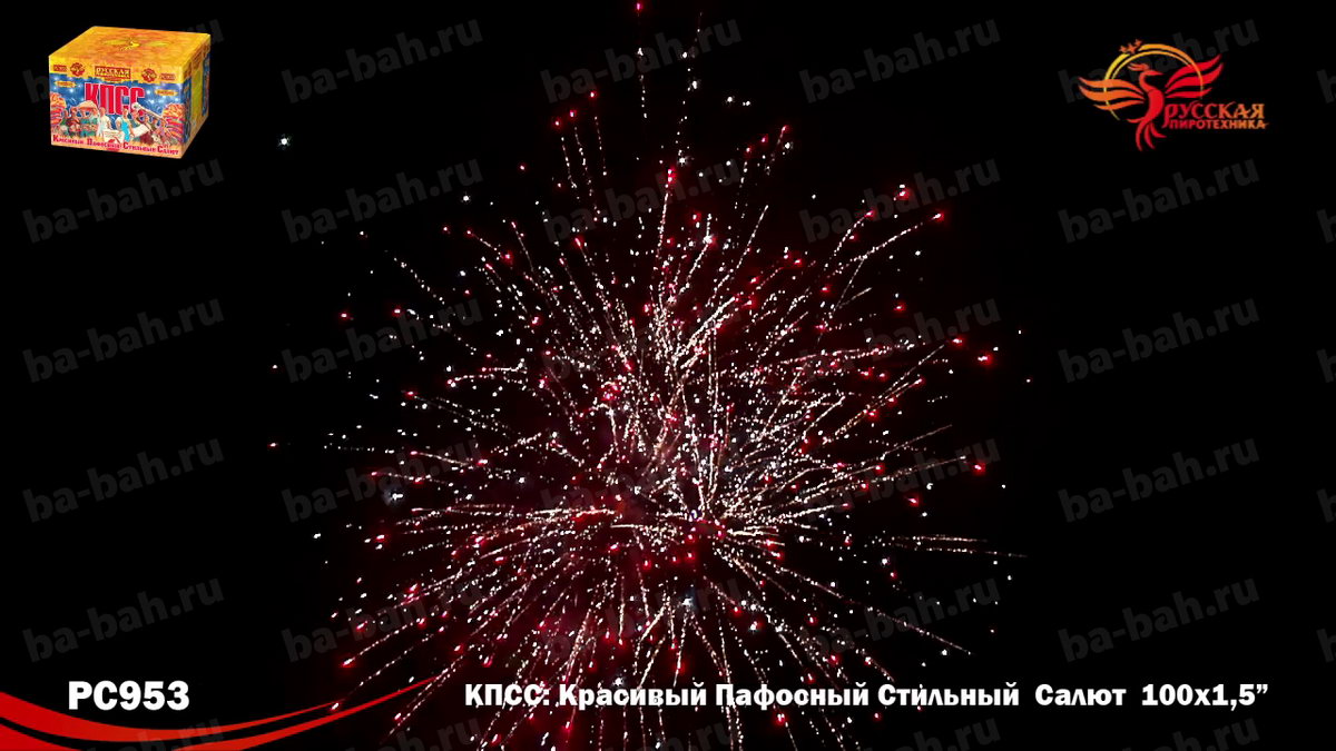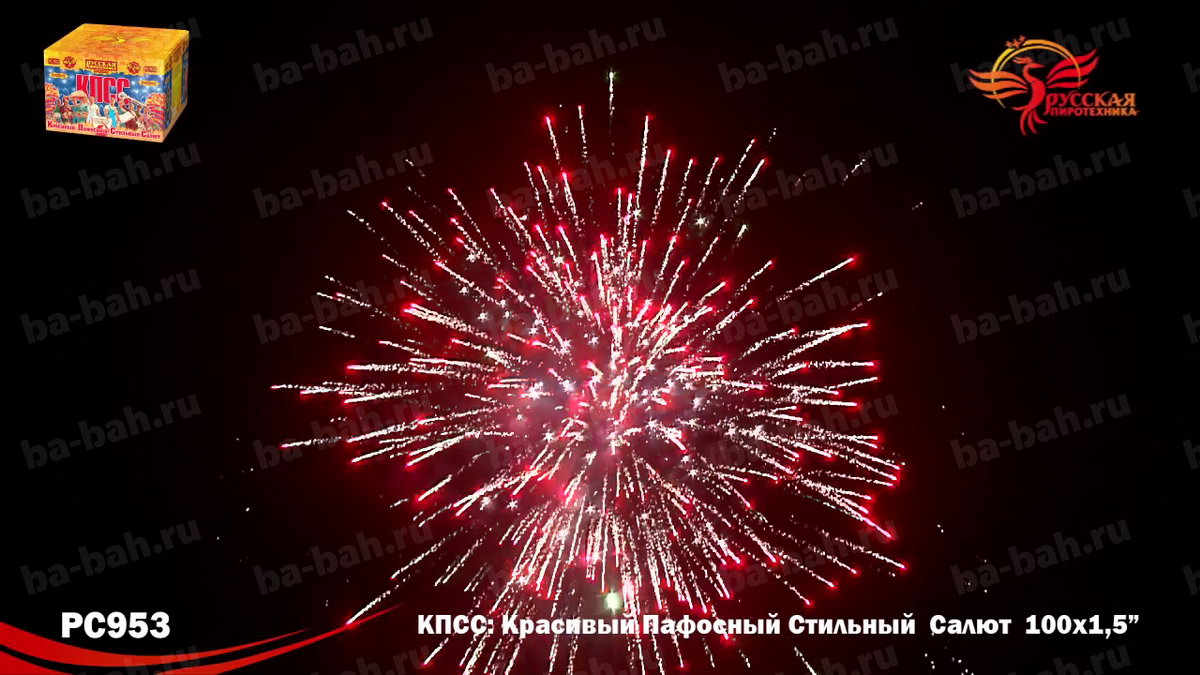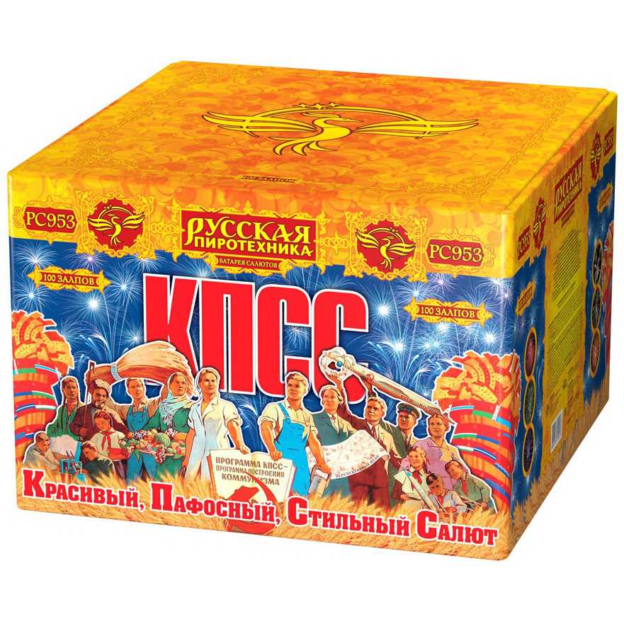 КПСС (Красивый Пафосный Стильный Салют) - это выдержанная в стиле "советского плаката" коробка и ошеломляющие 100 залпов крупного полуторадюймового калибра! Каждое слово названия - Красивый, Пафосный, Стильный Салют - в полной мере отражает характер этой дорогой и мощной батареи. 12 разнообразных эффектов включает в себя различные комбинации огромных огненных сфер красного, зеленого, белого, фиолетового и синего цвета, мерцающих огней и облаков, белых и серебряных хризантем и золотых искристых комет-швермеров с шуршащими искрами. Чтобы оценить силу и яркость эффектов фейерверка КПСС, посмотрите видеоролик, но помните, что он не передает и 10% от живого впечатления!