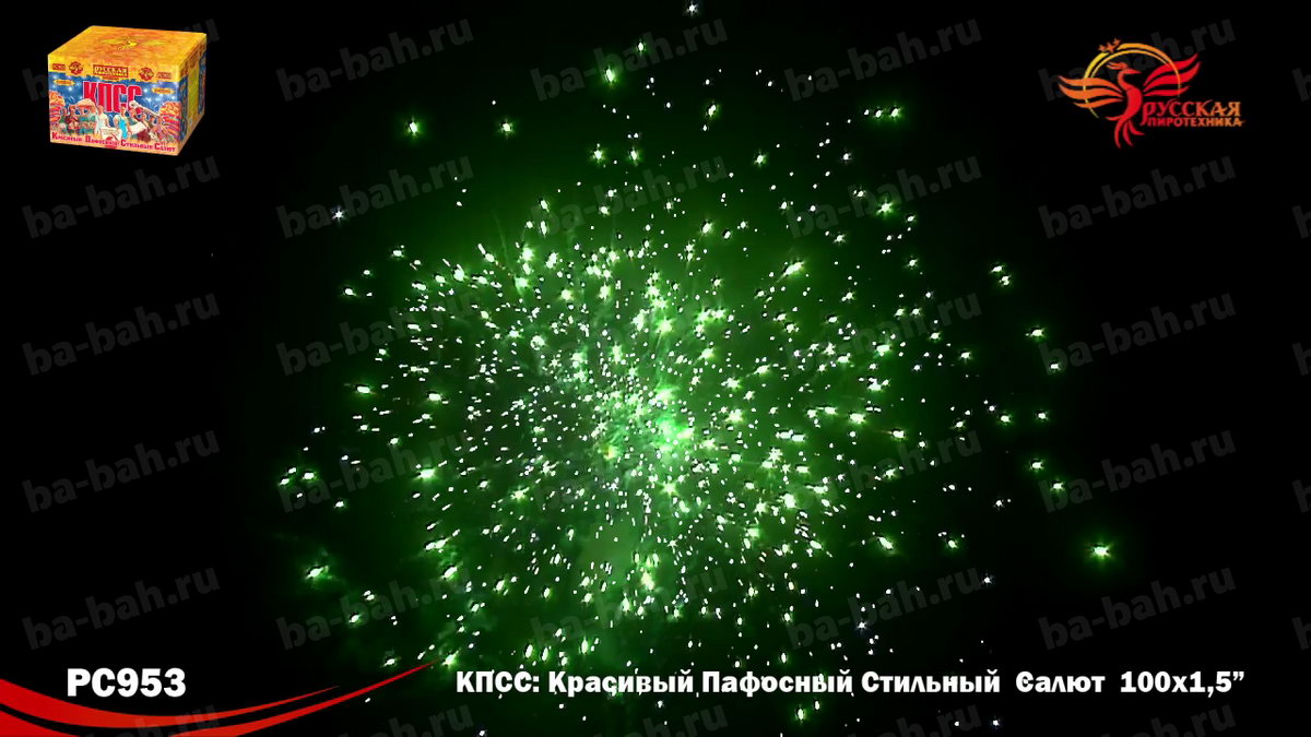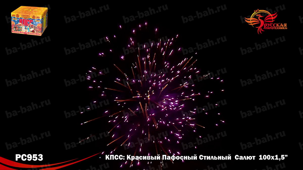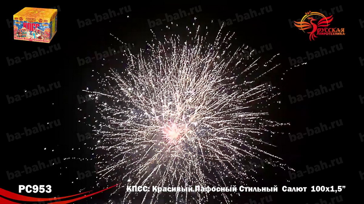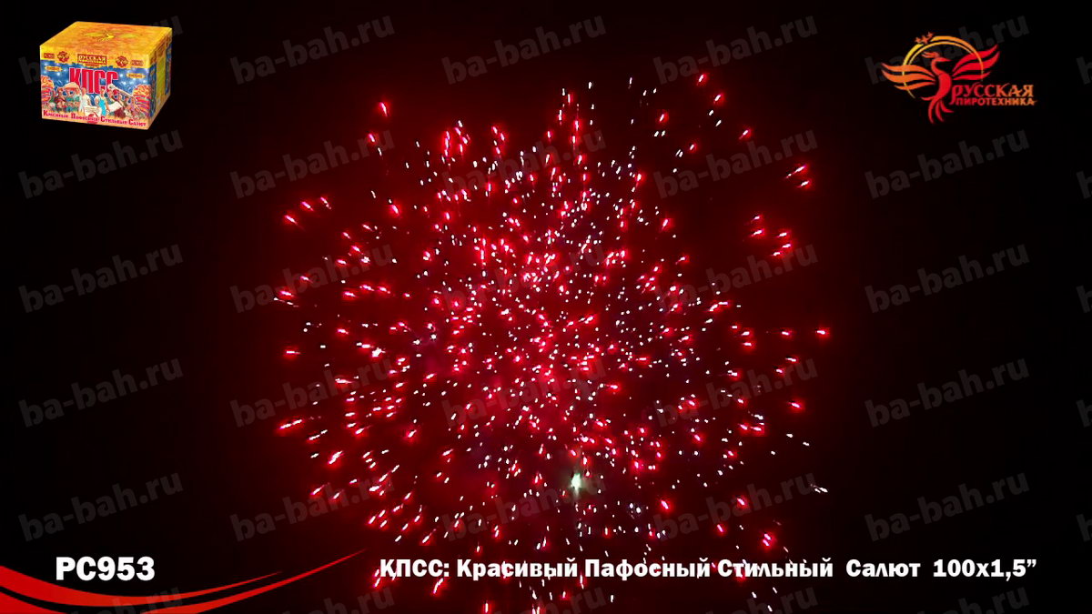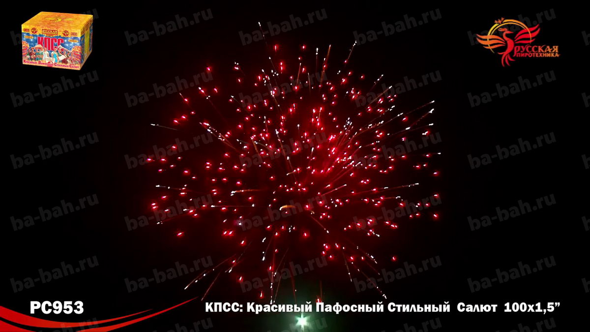 КПСС (Красивый Пафосный Стильный Салют) - это выдержанная в стиле "советского плаката" коробка и ошеломляющие 100 залпов крупного полуторадюймового калибра! Каждое слово названия - Красивый, Пафосный, Стильный Салют - в полной мере отражает характер этой дорогой и мощной батареи. 12 разнообразных эффектов включает в себя различные комбинации огромных огненных сфер красного, зеленого, белого, фиолетового и синего цвета, мерцающих огней и облаков, белых и серебряных хризантем и золотых искристых комет-швермеров с шуршащими искрами. Чтобы оценить силу и яркость эффектов фейерверка КПСС, посмотрите видеоролик, но помните, что он не передает и 10% от живого впечатления!
