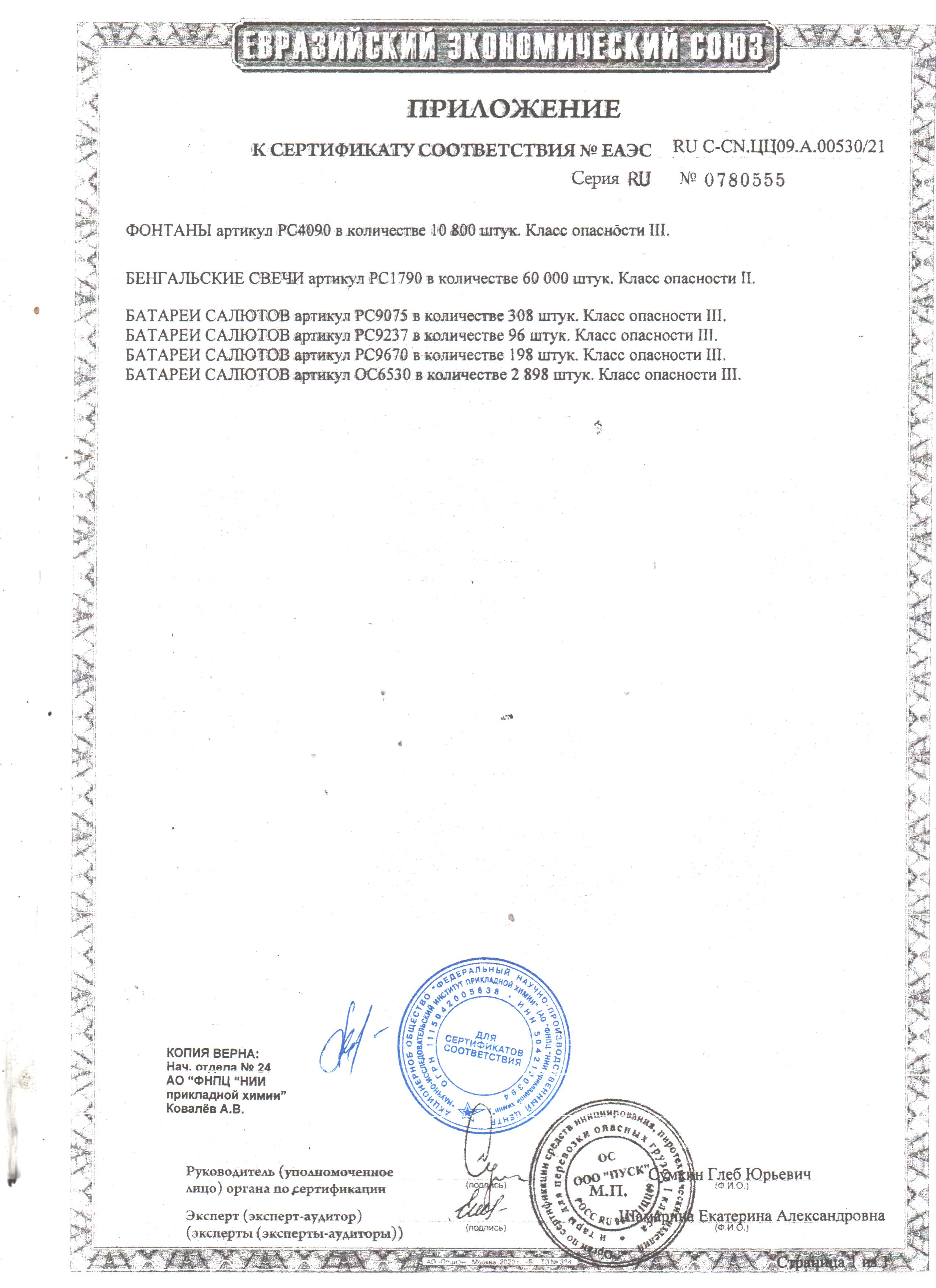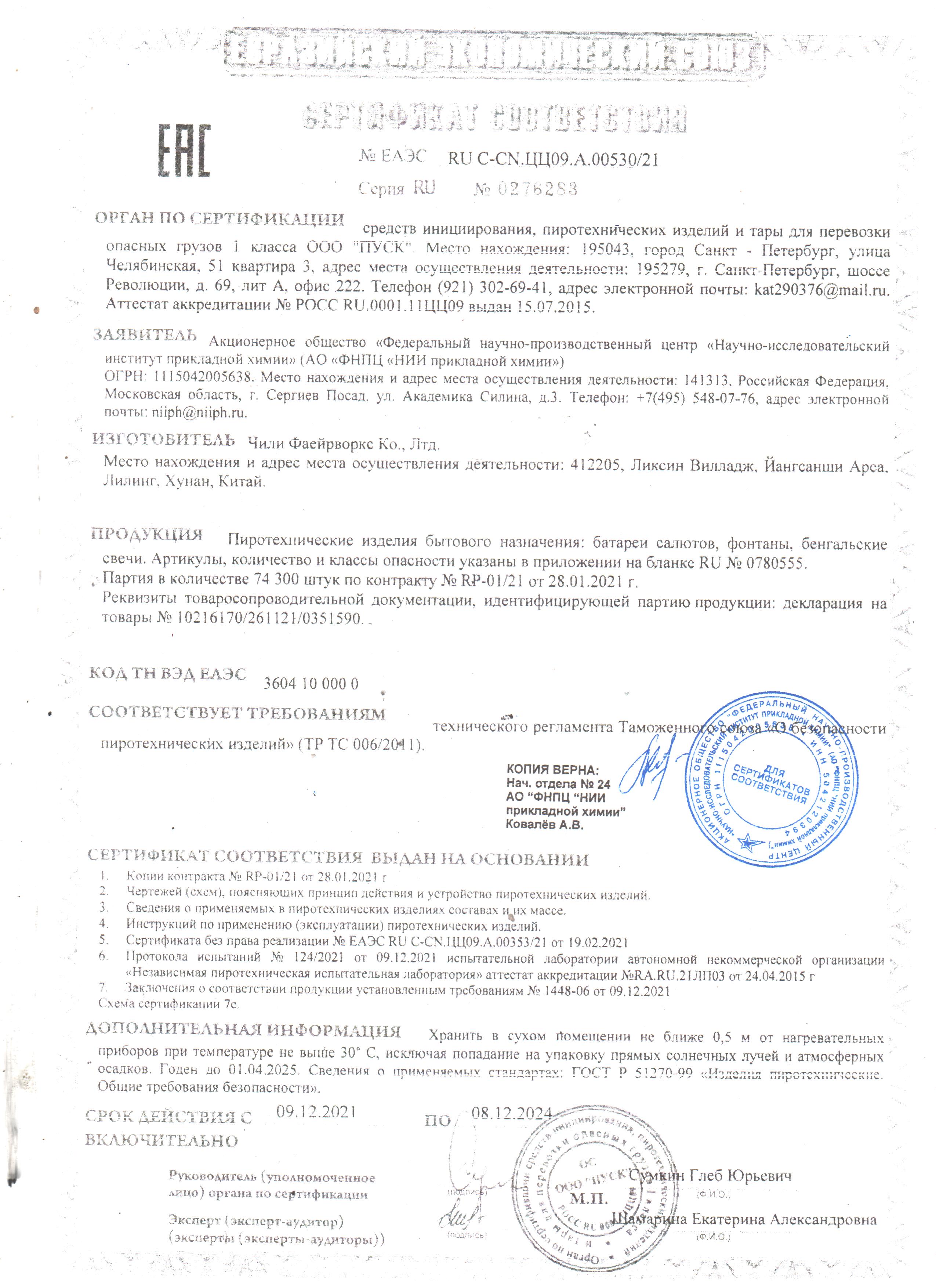 Магазин фейерверков ББ-Салют предоставляет гарантию на весь ассортимент интернет-магазина и розничных магазинов ББ-Салют! Мы торгуем пиротехникой самых лучших, проверенных торговых марок. Все изделия сертифицированы для продажи на территории России и имеют актуальный срок годности.