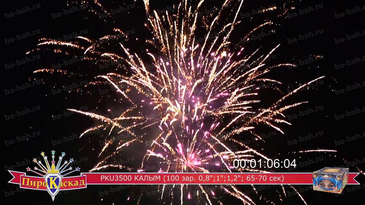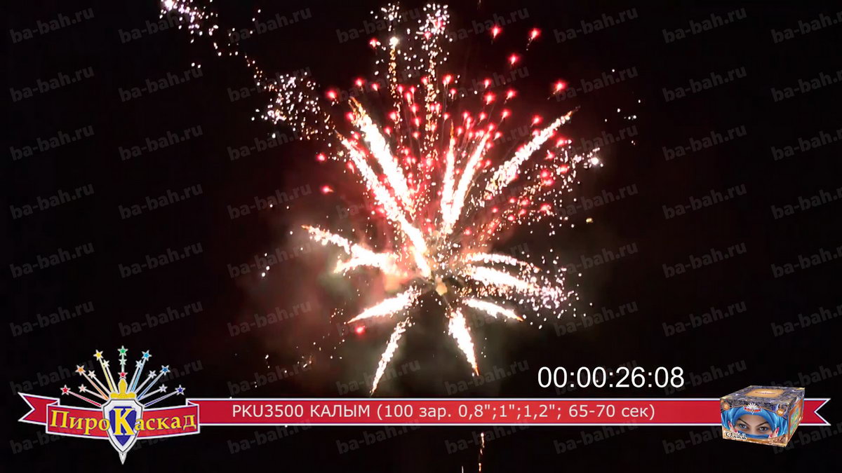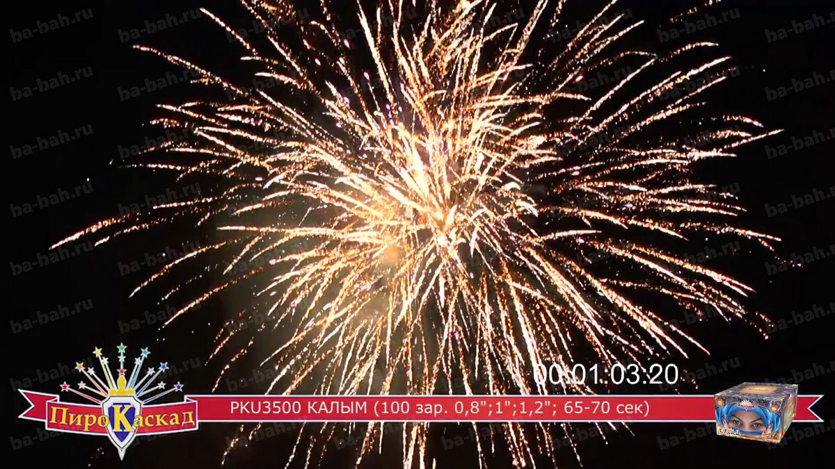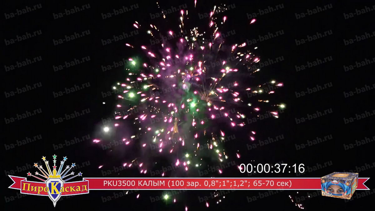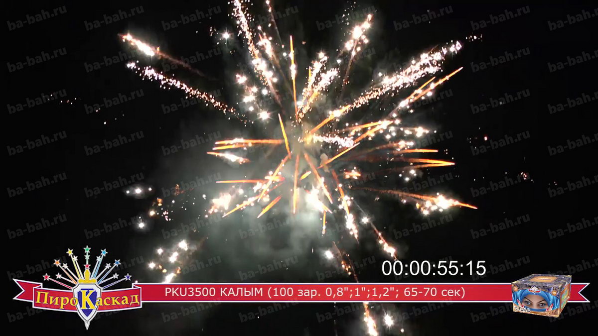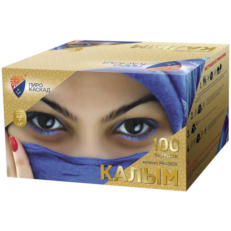 "Я за тебя калым отдам" - поется в известной песне про любовь. Что может лучше выразить эмоции и чувства влюбленного мужчины, чем оглушительный и ослепительно яркий фейерверк? Салют "Калым", с восточной красавицей в небесно-синем платке, как раз такой: в нем жар и яркость разноцветных звезд сочетается с мощью громких залпов. Такой салют растопит сердце даже самой гордой и строптивой девушки. Перечень эффектов: фиолетовые звезды с зеленым мерцанием