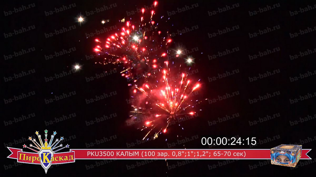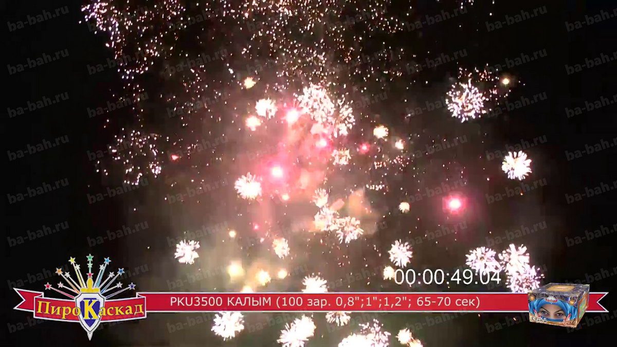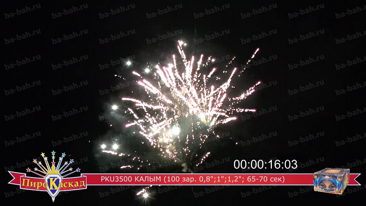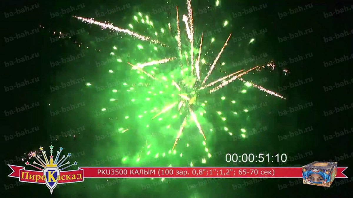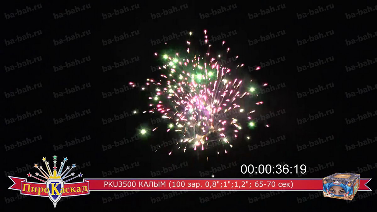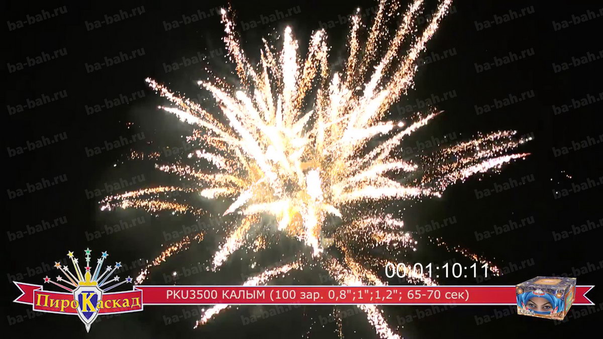 "Я за тебя калым отдам" - поется в известной песне про любовь. Что может лучше выразить эмоции и чувства влюбленного мужчины, чем оглушительный и ослепительно яркий фейерверк? Салют "Калым", с восточной красавицей в небесно-синем платке, как раз такой: в нем жар и яркость разноцветных звезд сочетается с мощью громких залпов. Такой салют растопит сердце даже самой гордой и строптивой девушки. Перечень эффектов: фиолетовые звезды с зеленым мерцанием