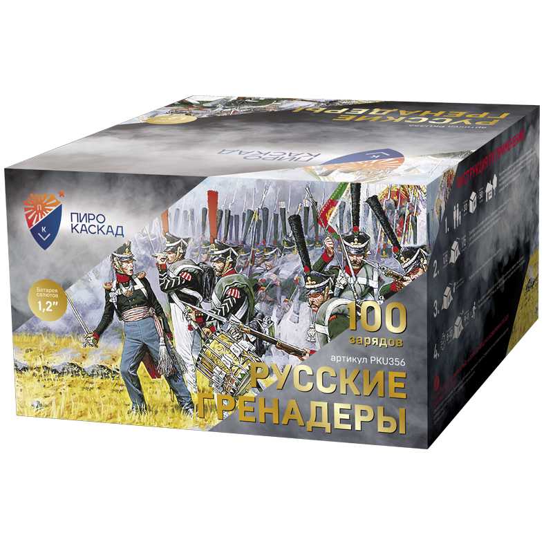 Серия фейерверков "Бородино" - коллекция великолепных 100-зарядных батарей, посвященных славе русского оружия. Ведь безусловно, Отечественная война 2812 года - одна из наиболее славных страниц российской истории... Открывает серию фейерверк "Русские гренадеры". Гренадерами, как хорошо известно, были самые лучшие, как сейчас любят говорить "элитные" войска, настоящие спецназовцы наполеоновских времен, которые использовались во время штурма укрепленных городов и крепостей.