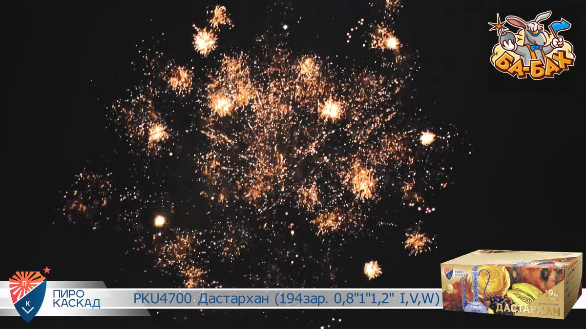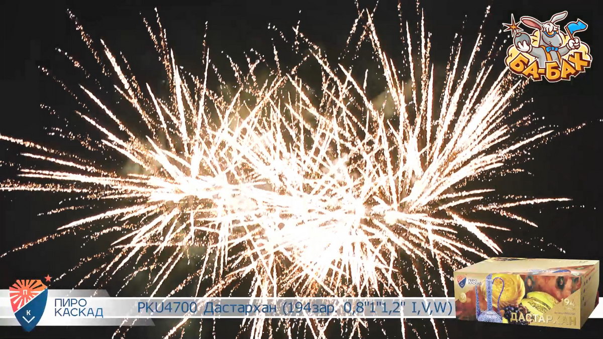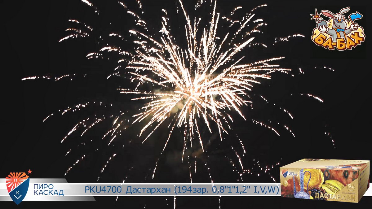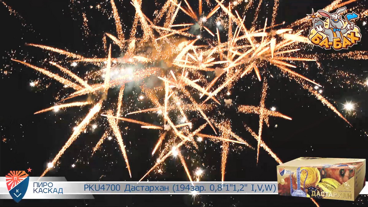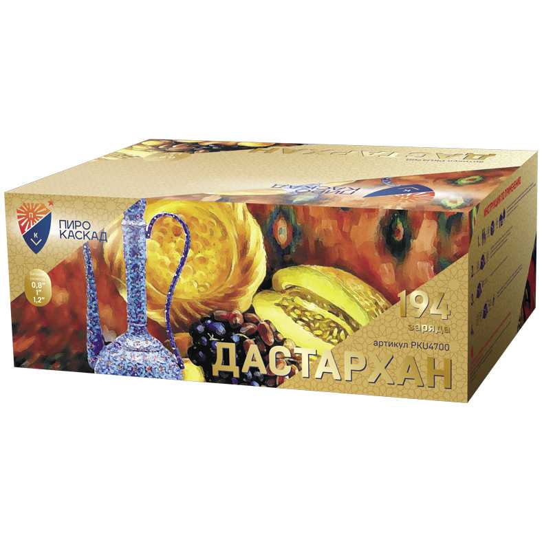 Как известно, народы Востока славятся своим гостеприимством. Любого гостя встречают с щедростью и радушием, одним из показателей которого конечно же будет стол, ломящийся от восточных явств и сладостей. Называют такую трапезу "Дастархан". Купите салют с таким же названием - и вас ждет настоящее пиротехническое пиршество, удивительно разнообразное и щедрое! Почти 200 залпов разукрасят небо по-восточному яркими и пышными цветами всех оттенков радуги. Перечень эффектов: парчовая пальма с трещащими форсами