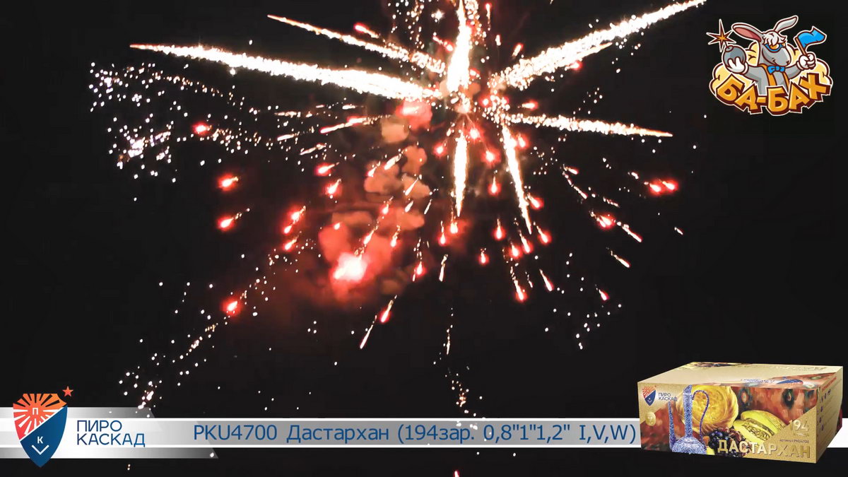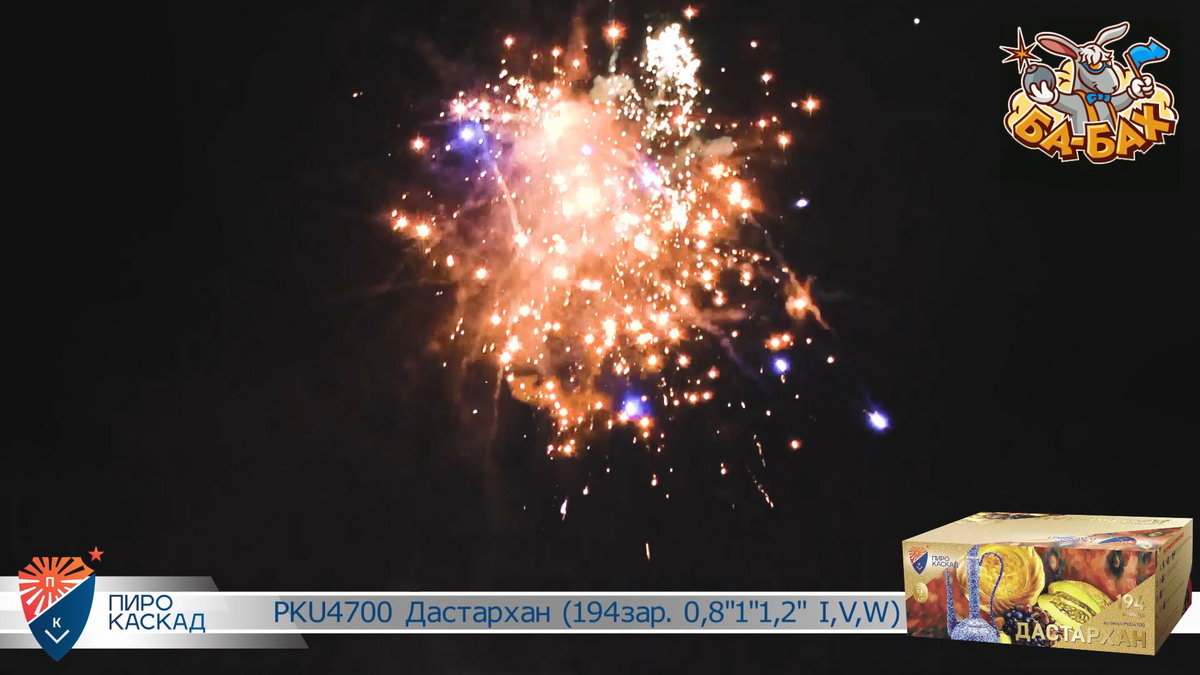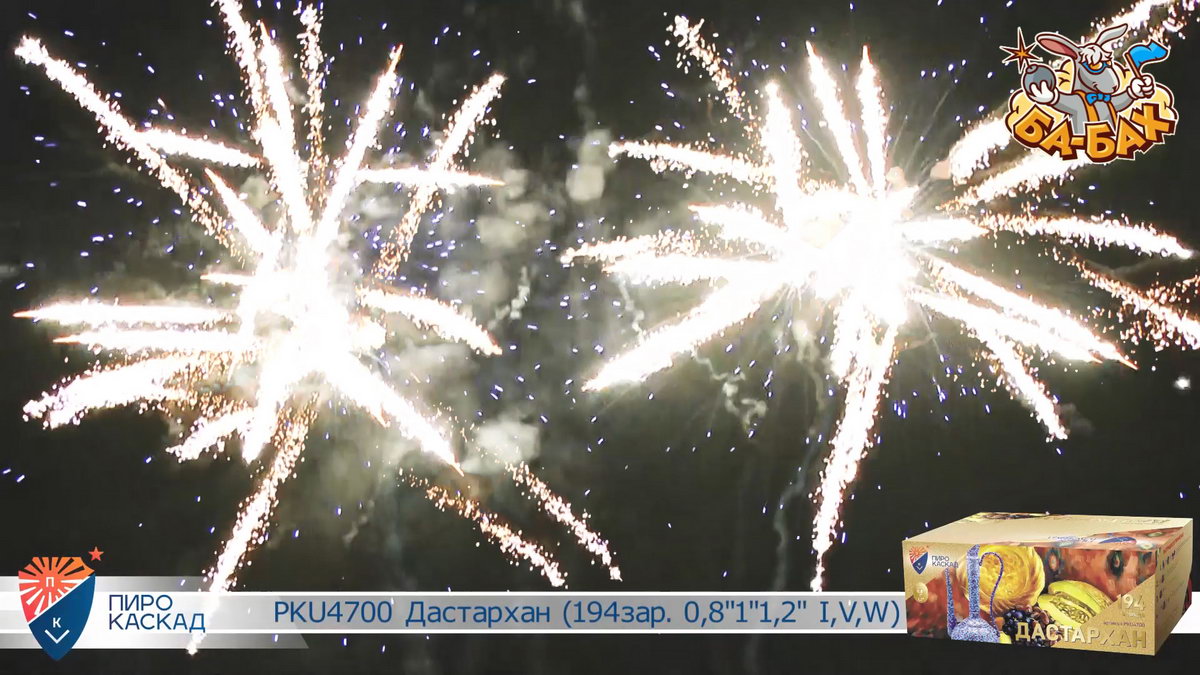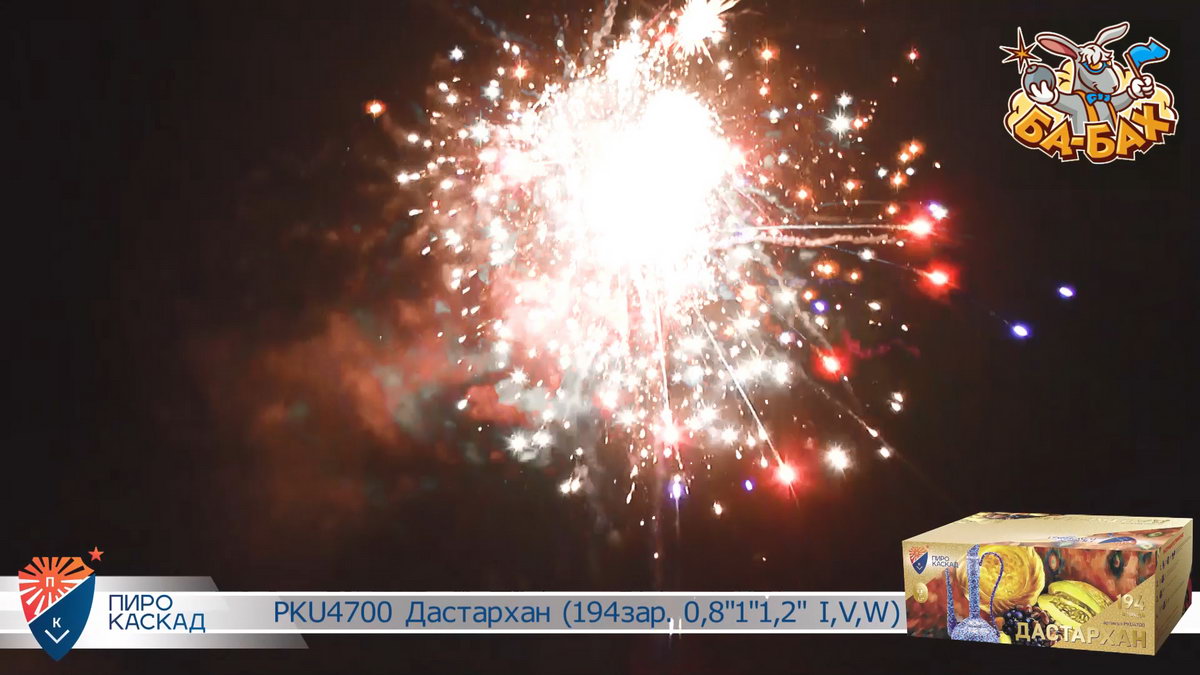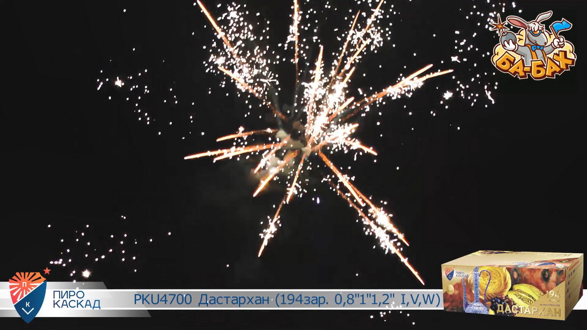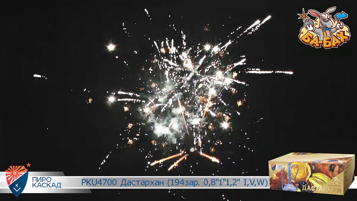 Как известно, народы Востока славятся своим гостеприимством. Любого гостя встречают с щедростью и радушием, одним из показателей которого конечно же будет стол, ломящийся от восточных явств и сладостей. Называют такую трапезу "Дастархан". Купите салют с таким же названием - и вас ждет настоящее пиротехническое пиршество, удивительно разнообразное и щедрое! Почти 200 залпов разукрасят небо по-восточному яркими и пышными цветами всех оттенков радуги. Перечень эффектов: парчовая пальма с трещащими форсами