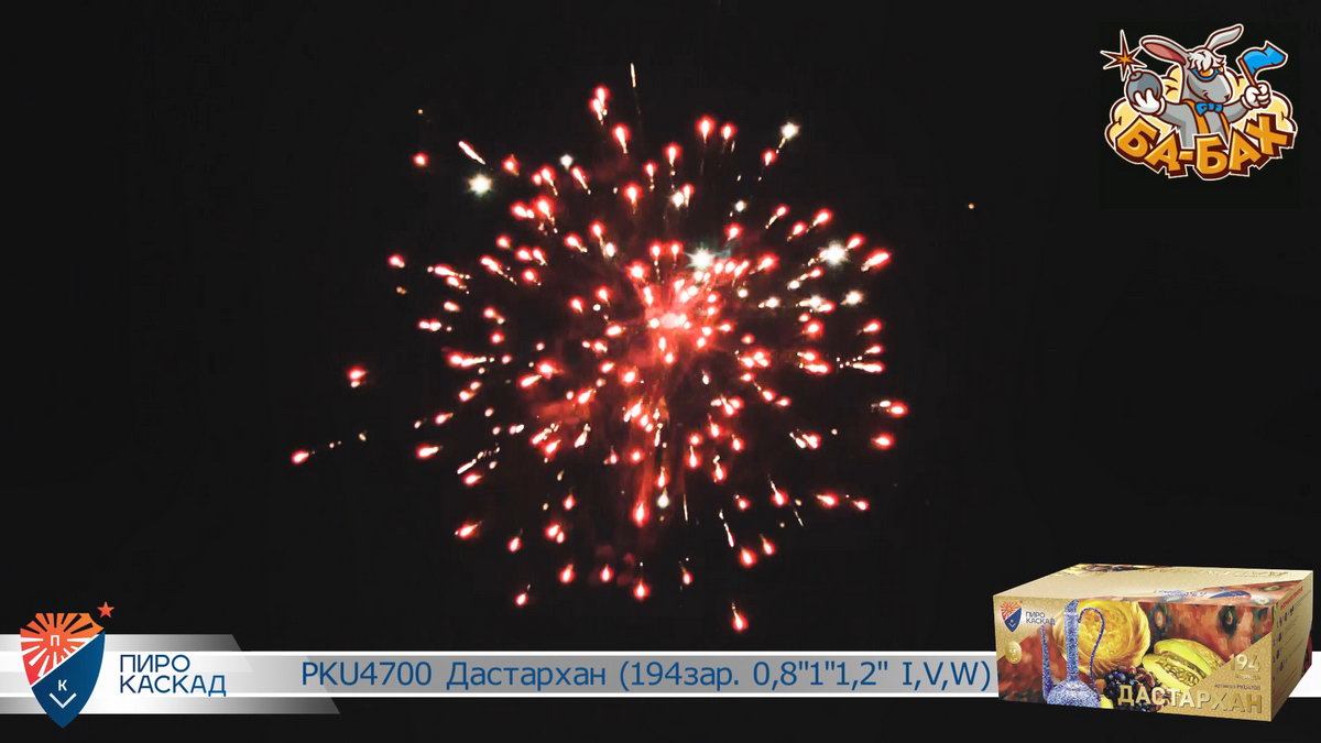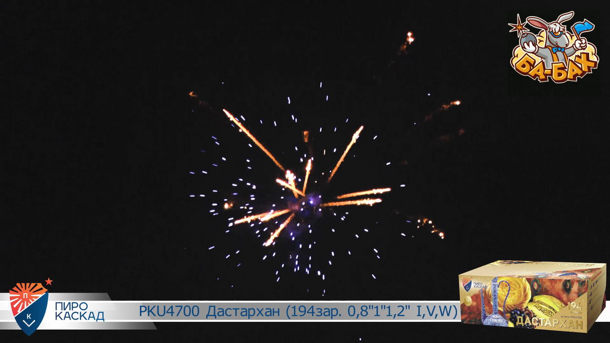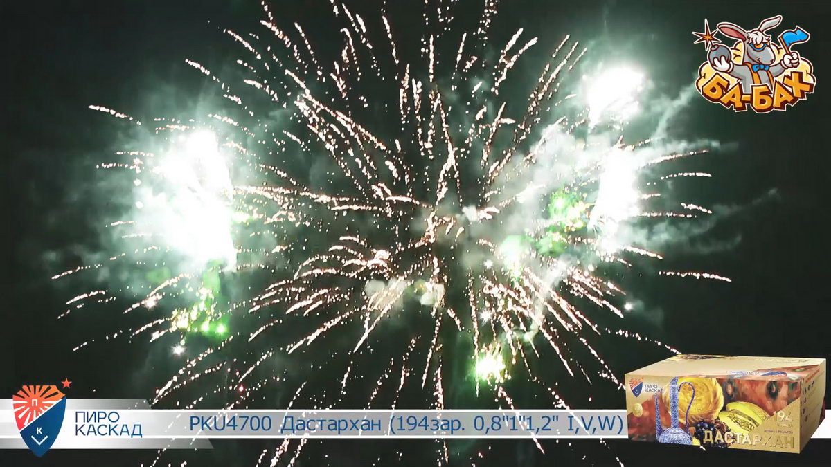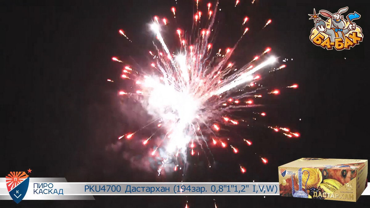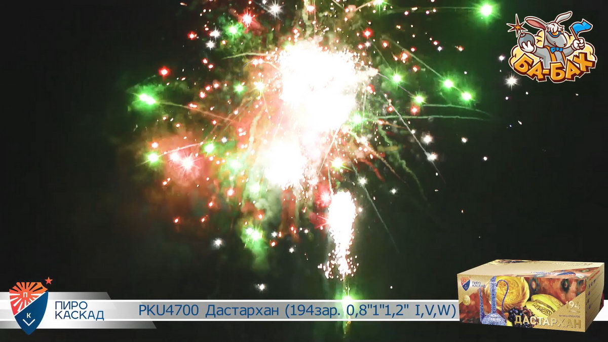Как известно, народы Востока славятся своим гостеприимством. Любого гостя встречают с щедростью и радушием, одним из показателей которого конечно же будет стол, ломящийся от восточных явств и сладостей. Называют такую трапезу "Дастархан". Купите салют с таким же названием - и вас ждет настоящее пиротехническое пиршество, удивительно разнообразное и щедрое! Почти 200 залпов разукрасят небо по-восточному яркими и пышными цветами всех оттенков радуги. Перечень эффектов: парчовая пальма с трещащими форсами