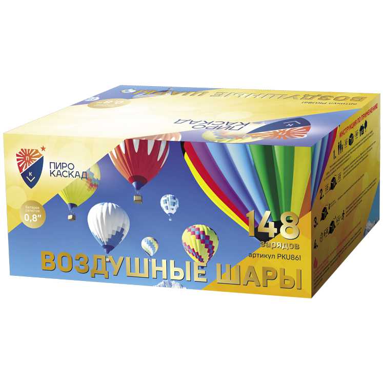 Если Вам когда-нибудь посчастливилось побывать на фестивале вохдухоплавания, когда в воздух одновременно поднимается несколько десятков воздушных шаров, цеппелинов и дирижаблей самых причудливых форм и расцветов, то вы можете получить примерное представление об эффектах фейерверка "Воздушные шары"! Из небольшой коробки, как из ящика Пандоры, вырывается целых 148 разноцветных сияющих шаров - только не воздушных, а огненных. Но зрелище не становится от этого хуже, совсем наборот! Это описание - не просто красивая метафора: в качестве главного эффектов салюта действительно использованы разноцветные сферы-пионы всех возможных расцветок и размеров.