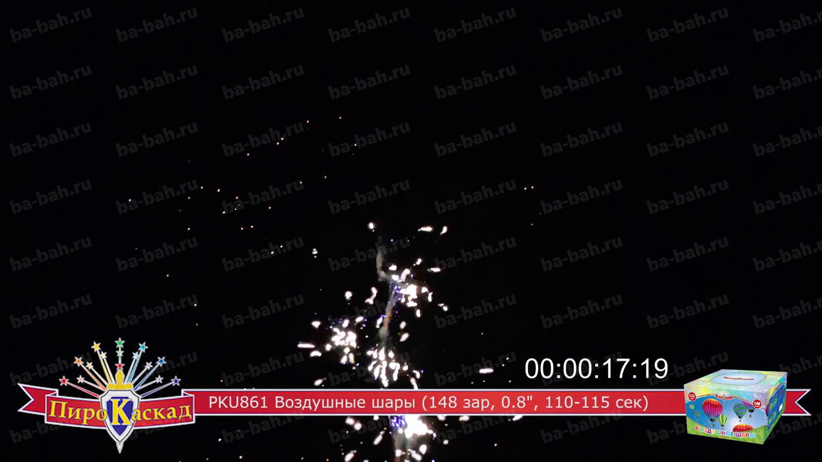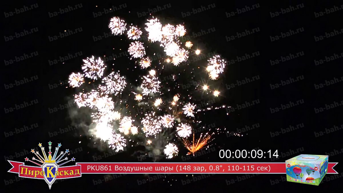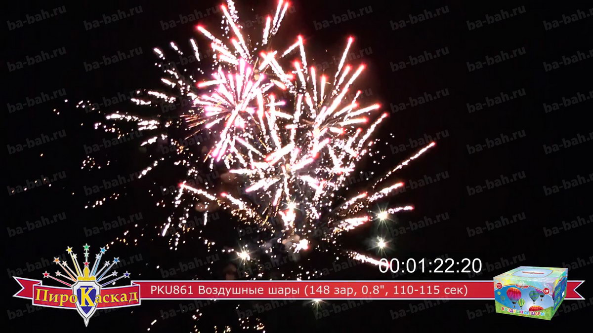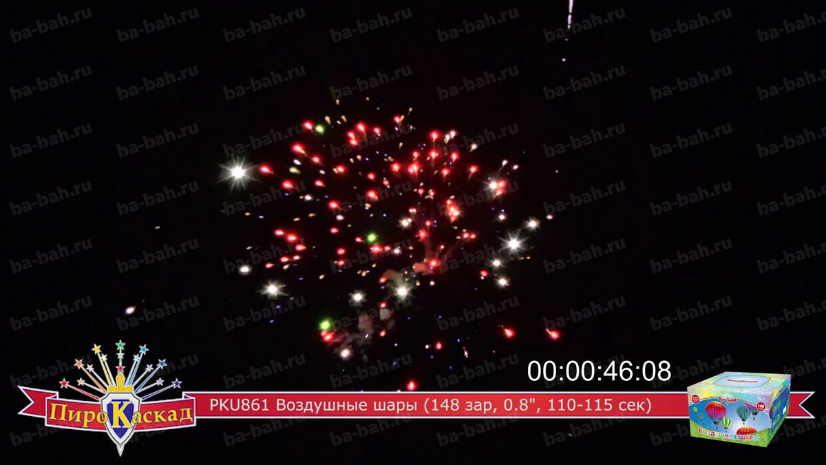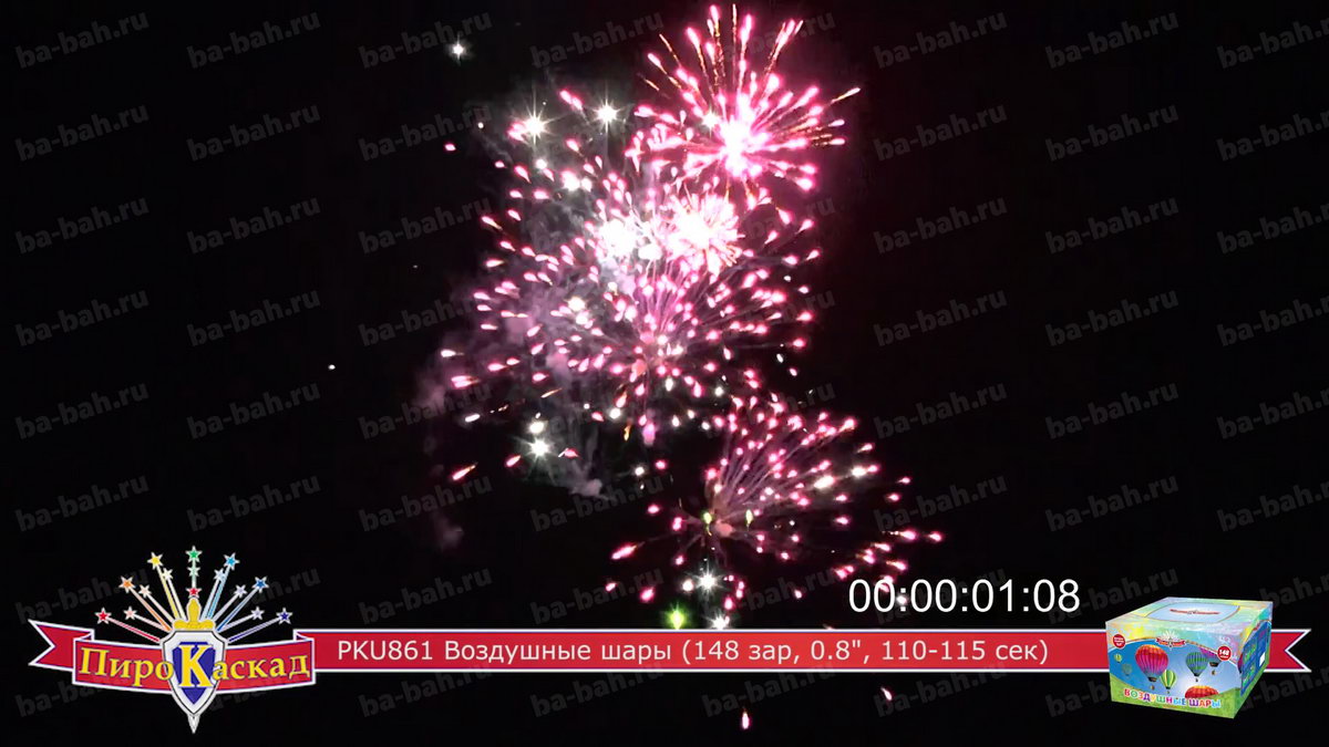 Эффекты: пурпурные сферы с серебристым мерцанием; множество маленьких разноцветных хризантем; небесно-синие звезды с серебряными рыбками; цветные звезды с трещащей сферой; салатовые пионы и свистящие кометы; сферы из звезд, окрашенных в цвета российского флага - красно-бело-синие; букеты из красные, зеленые и синих пионов; финал: залп серебристых пальм с трещащими сферами. Видеоролик, к сожалению, не передает всей красоты фейерверка "Воздушные шары", поэтому просто поверьте нам на слово: выглядит он замечательно!