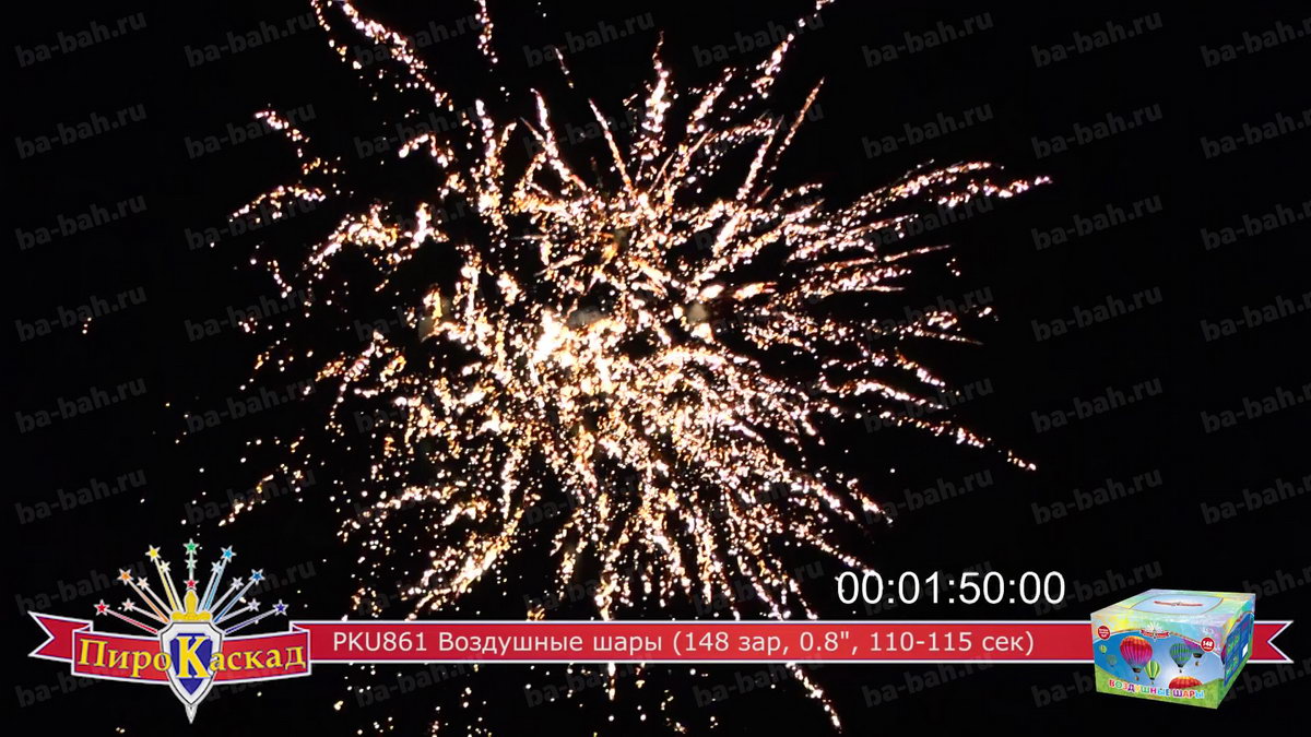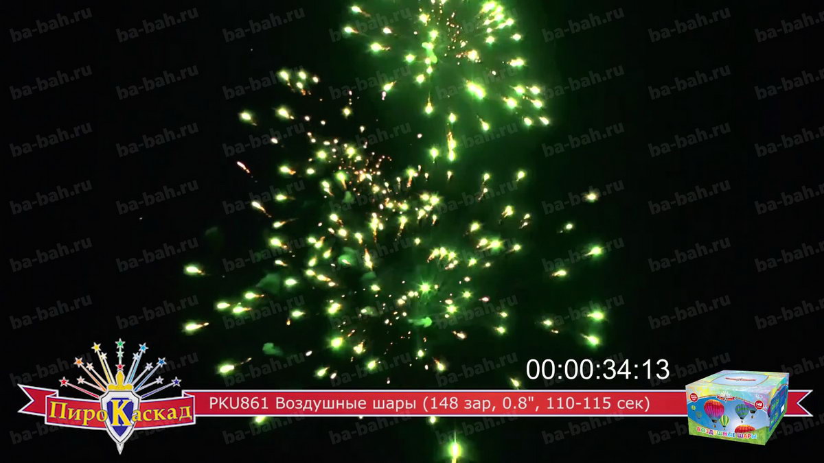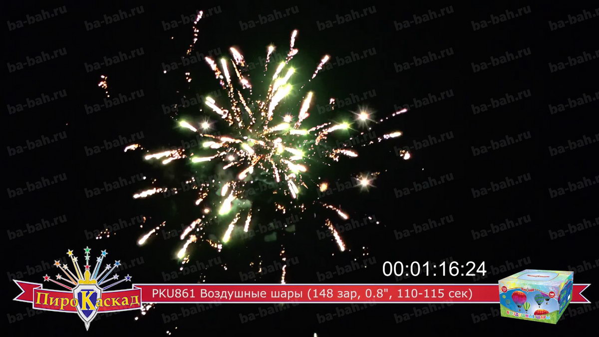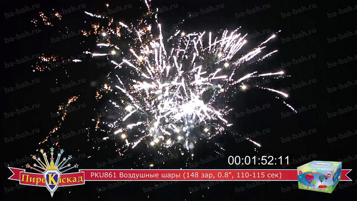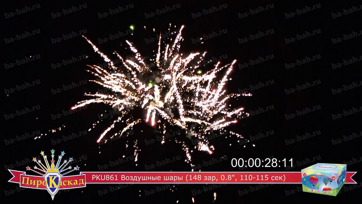 Эффекты: пурпурные сферы с серебристым мерцанием; множество маленьких разноцветных хризантем; небесно-синие звезды с серебряными рыбками; цветные звезды с трещащей сферой; салатовые пионы и свистящие кометы; сферы из звезд, окрашенных в цвета российского флага - красно-бело-синие; букеты из красные, зеленые и синих пионов; финал: залп серебристых пальм с трещащими сферами. Видеоролик, к сожалению, не передает всей красоты фейерверка "Воздушные шары", поэтому просто поверьте нам на слово: выглядит он замечательно!