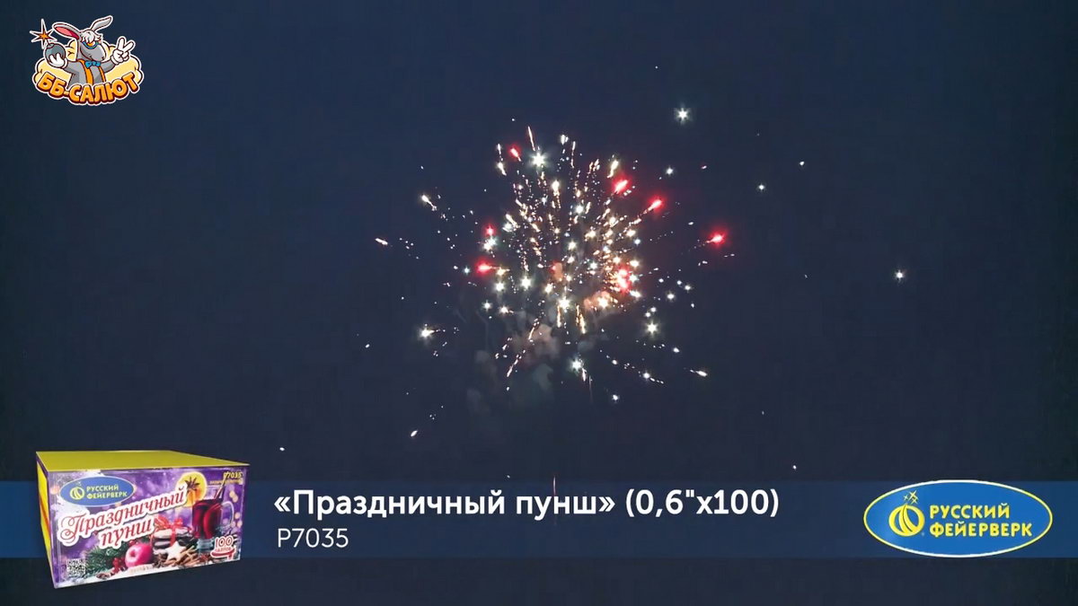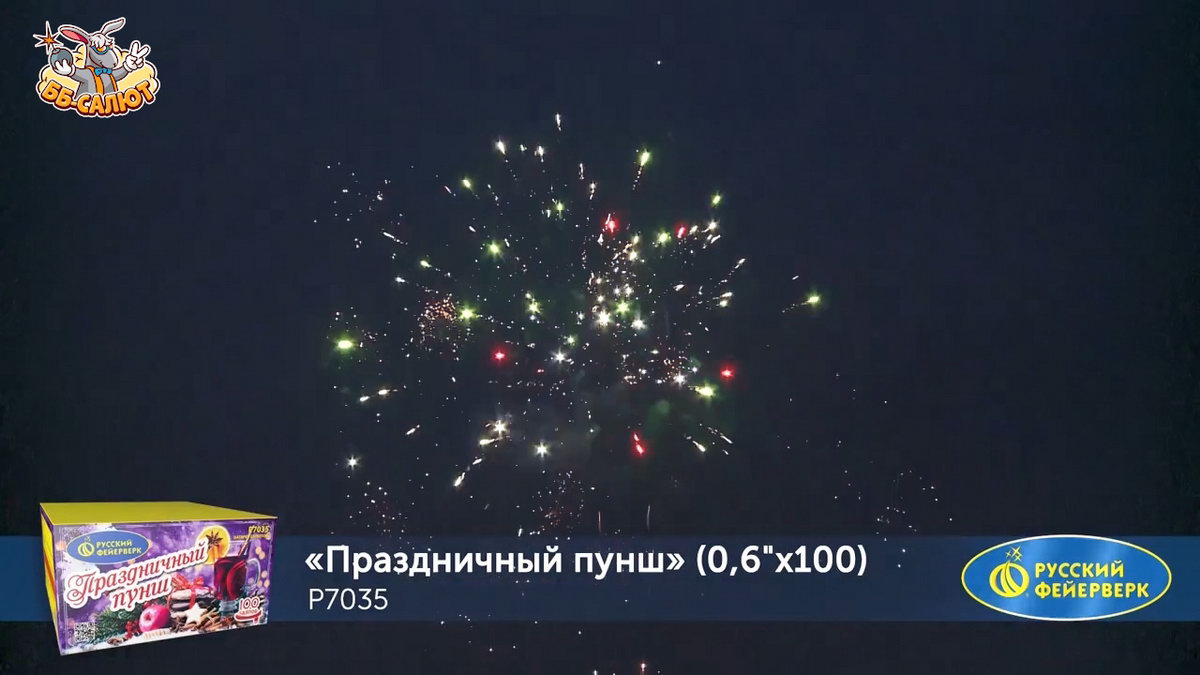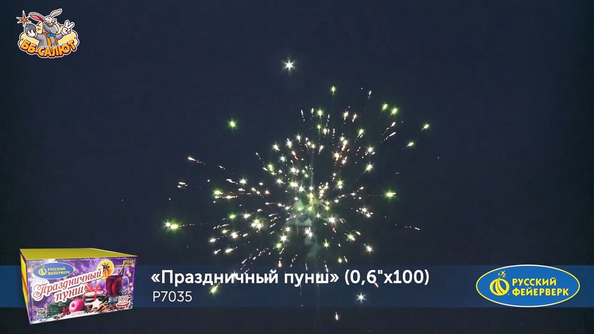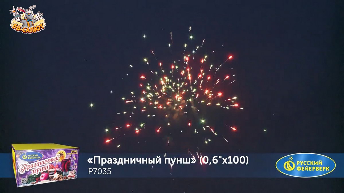 Веселый пиротехнический фейерверк Праздничный пунш - это аж 100 залпов за 85 секунд! В нем профессионально смешаны: красно-белый мерцающий пион, а еще зелено-белый, оранжево-зеленый, красно-зеленый пион с облаком трещащего дождя и пятый – очень радостный свист, вылетающих ракет. Остается только насладиться вкусом этого праздничного пунша!