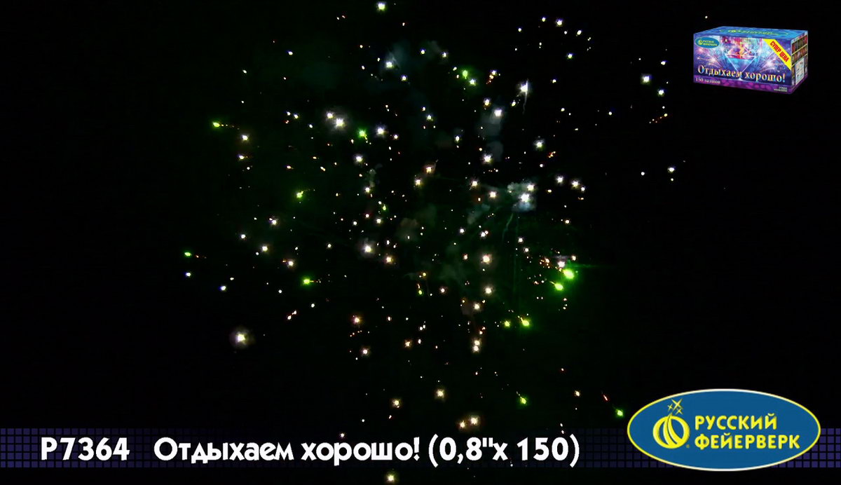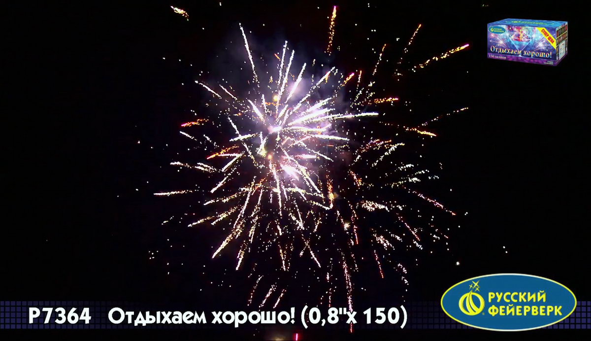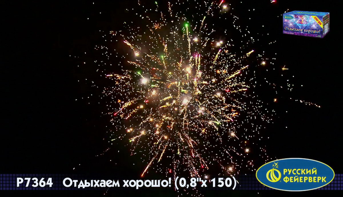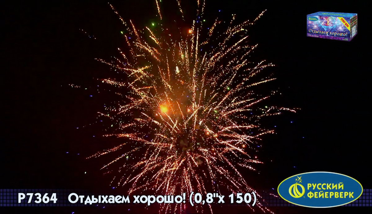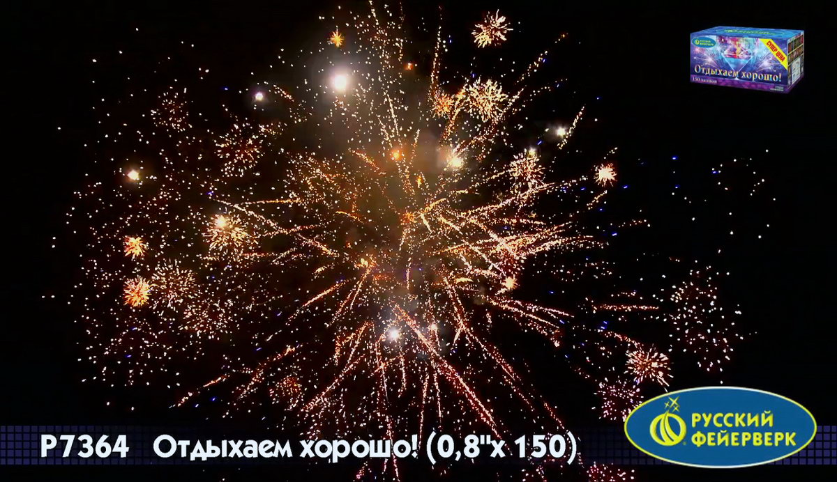 С таки количество пиротехнических элементов, 150 залпов, отдыхать можно не просто хорошо, а с шиком! Это не салют, а грандиозный масштабный спектакль, где главными актерами назначаются только самые востребованные покупателями эффекты - настоящие "звезды сцены". Рассмотрим их отдельно. Вступительная часть салюта - это спокойные, убаюкивающие внимание сферы из зеленых и розовых огней с мерцающими звездами, синими и лимонными мерцающими вспышками, желтые и голубые вспышки огней, сиреневые и белые мерцающие сферы. Постепенно напряжение салюта нарастает и частота выстрелов увеличивается. Основная часть спектакля - это появление красных огней с белыми и золотыми хвостами, белоснежные и медные хвосты, пышные золотые кометы. Каждый залп выстреливающих комет сопровождается облаками трещащих острых искр, пока все происходящее не достигает максимального темпа. Завершением всего этого неспокойного карнавала красок становится феерический незабываемый финал: медно-рыжие тонкие кометы в окружении разноцветного мерцания трещащих искристых облаков. Отдыхать хорошо не запретишь! Остается только позавидовать тем, чей отдых пройдет в компании этого первоклассного, создающего настроение праздника, фейерверка!