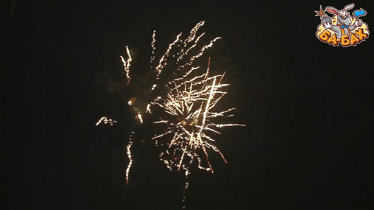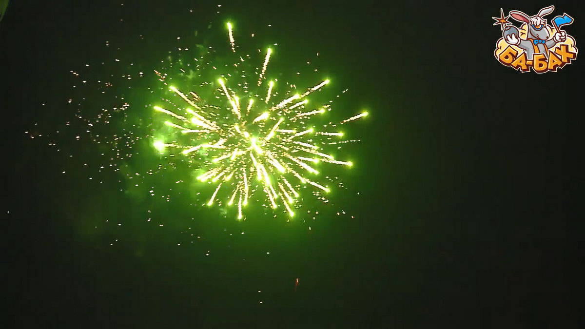 1. Красно-сине-белая мерцающая сфера (пион). 2. Свист. 3. Зеленые звезды с пышными хвостами (кокос) и облако треска (трещащий дождь). 4. Фиолетово-зеленая мерцающая сфера (пион). 5. Множество серебряных ниспадающих нитей (парча) и треск.