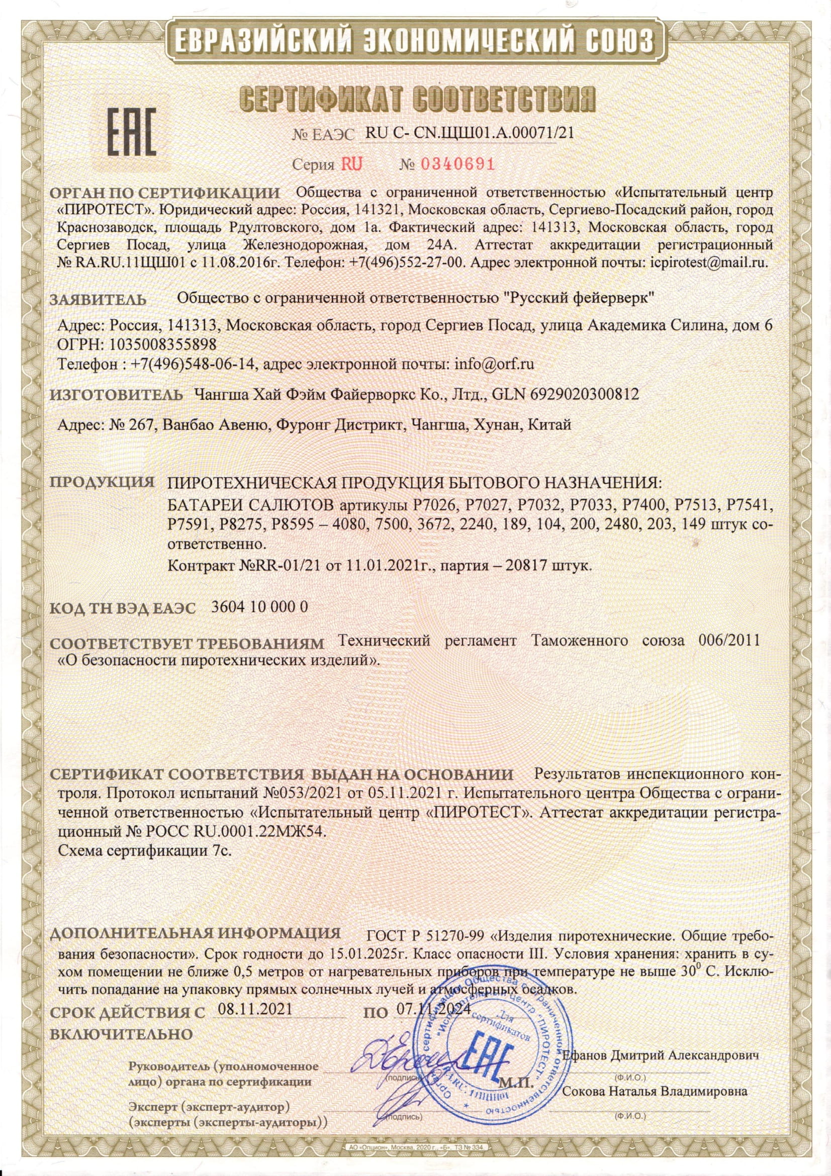 - К сожалению, мы не осуществляем доставку пиротехники в Калининградскую область, а также за пределы Российской Федерации.