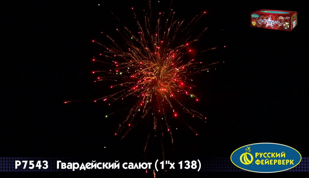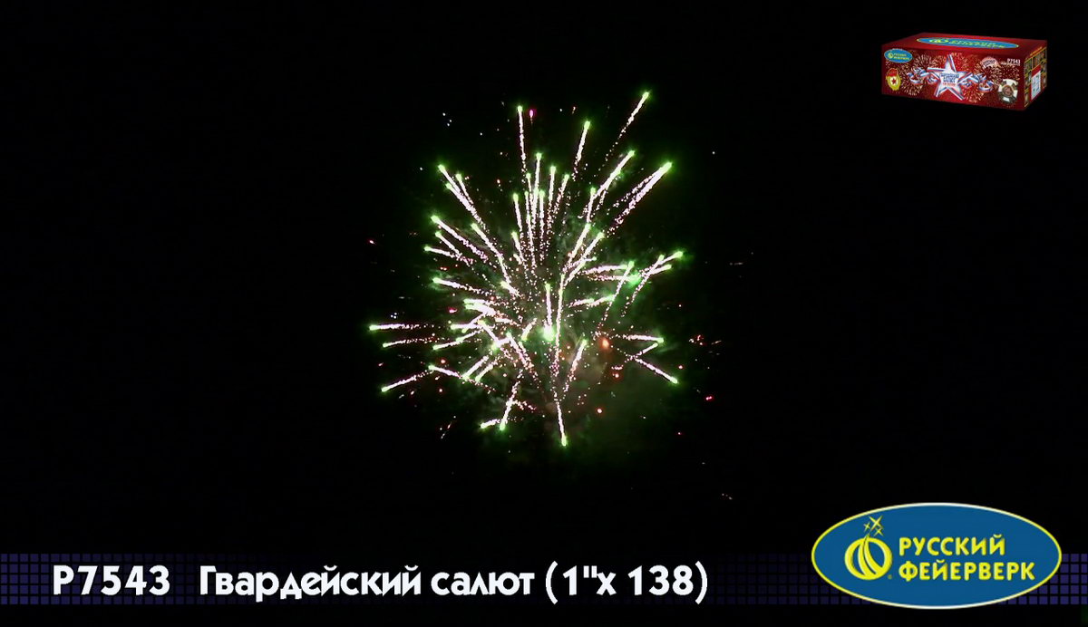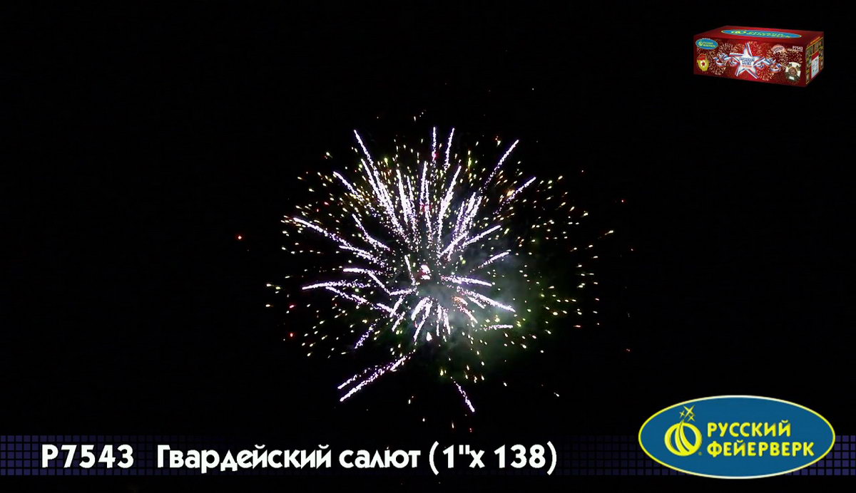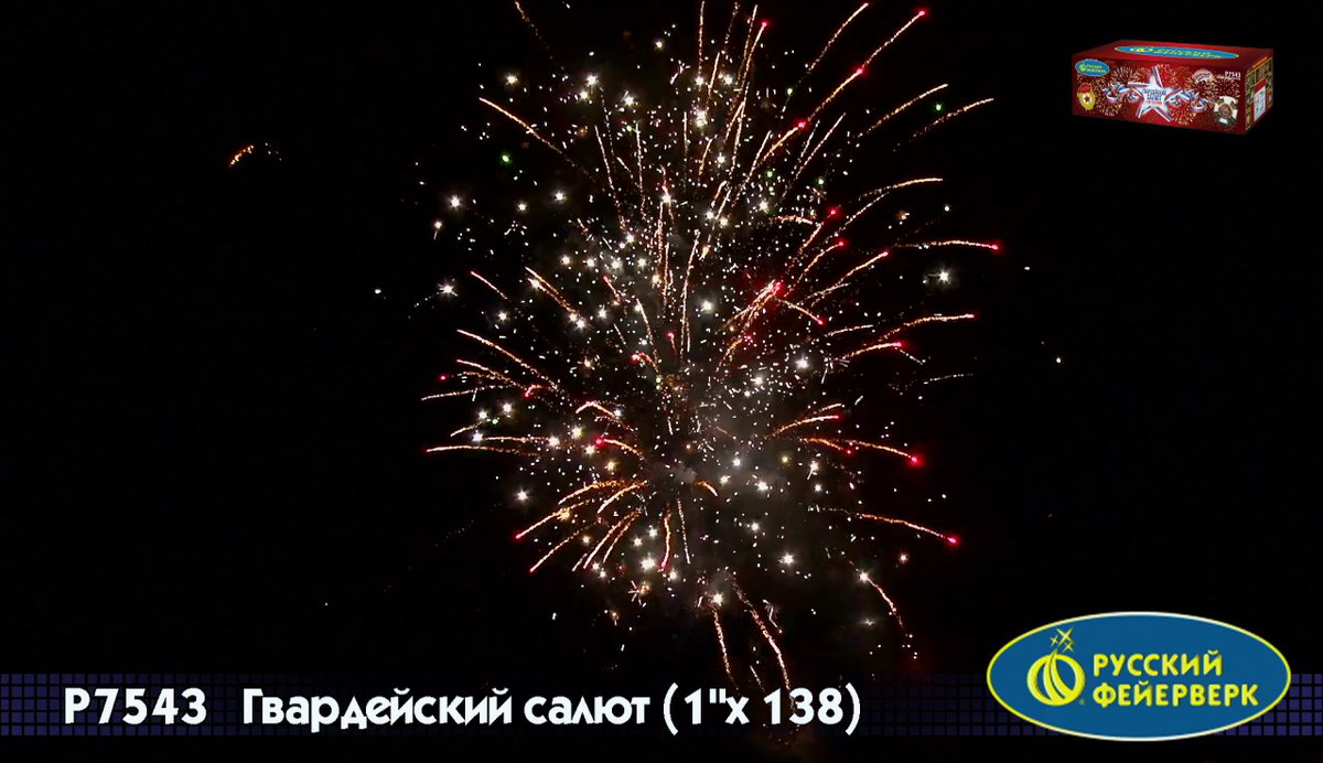 Мужественный представитель гордой и непобедимой русской пиротехники! Наша гвардия не отступает. Залп за залпом, оцените превосходство русской пиротехнической школы. В таких салютах все самое интересное обычно начинается посредине. Приступаем к исполнению. В авангарде выступают зеленые кометы с перламутровыми хвостами и медным сиянием, сиреневые кометы с золотым обрамлением из огней. И так продолжаться будет несколько раз, пока в салют не ворвется самоуверенная огненная пальма со своими медными и золотыми искрами, розовыми и зелеными огнями, она будет доказывать свою правоту несколько залпов, меняя себе пиротехнических спутников. А вот и он, торжественный момент кульминации!!! Веерный салют, да еще какой! По бокам плавно поднимаются розовые кометы с объемными насыщенными огненными шлейфами, а в центре в этот же момент выступает пышная белоснежная сфера с зелеными и красными огоньками. Гвардейскую атаку не остановить! Опять двухъярусный, да еще и веерный салют! Это что-то невероятное! Внизу: перламутровая трава с синими цветами, которые выстреливают в небо свой аромат, но под пути он теряется и превращается в розовых и зеленых рыбок. А потом идут белоснежные хвосты малиновых звезд и мерцания, перламутровые кометы с разноцветными огнями и нежным медным блеском. И опять без приглашения огненная пальма! Затянула свои длинные рассказы, махая при этом листьями и разбрасывая разноцветные огни и трещащие искры. А вот и наши знакомые веера. Опять на месте, опять ее прогнали. И так продолжается до самого финала! Первоклассный, долгий, и запоминающийся - "Гвардейский салют" с мужским характером!