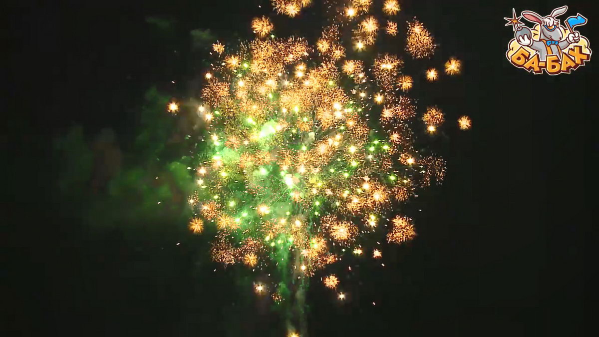 1. Свист. 2. Красные звезды с пышными хвостами (кокос) и зеленое мерцание. 3. Желтые звезды с пышными хвостами (кокос) и зеленое мерцание. 4. Зеленые звезды с пышными хвостами (кокос) и белое мерцание. 5. Красные звезды и облако треска (трещащая хризантема). 6. Зеленые звезды и облако треска (трещащая хризантема). 7. Множество серебряных ниспадающих нитей (парча) и красные звезды. 8. Оранжевые звезды и облако треска (трещащая хризантема). 9. Множество серебряных ниспадающих нитей (парча) и фиолетовые звезды. 10. Фиолетовые звезды с пышными хвостами (кокос) и белое мерцание. 11. Красные мерцающие букеты звезд (падающие листья). 12. Комета разрывается множеством серебряных ниспадающих нитей (парча) и красным мерцанием. 13. Зеленые звезды и облако золотого треска (трещащая хризантема). 14. Множество золотых ниспадающих нитей (парча) и красное мерцание. 15. Трещащие букеты звезд (падающие листья). 16. Кометы с серебряными хвостами разрываются облаком треска (трещащая хризантема).