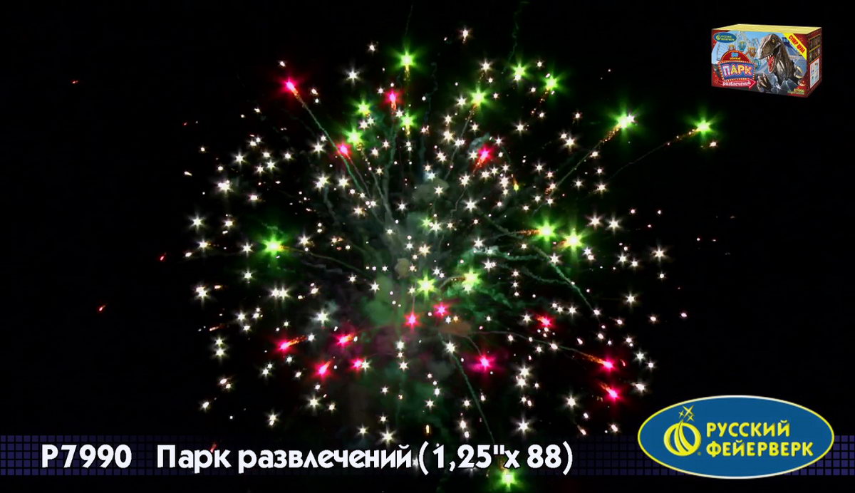 1. Зелено-красная сфера (пион) и белое мерцание. 2. Множество золотых ниспадающих нитей (парча) и зелено-фиолетовые звезды. 3. Красные звезды с пышными хвостами (кокос), синие звезды и треск. 4. Зелено-малиновая сфера (пион) и белое мерцание. 5. Зеленые звезды с пышными хвостами (кокос) и облако треска (трещащий дождь). 6. Множество золотых ниспадающих нитей (парча) и сине-красная сфера (пион). 7. Желто-синяя сфера (пион) и облако треска (трещащий дождь). 8. Красочная концовка: трещащая комета разрывается звездами с пышными трещащими хвостами (трещащий кокос) и малиново-синими звездами.