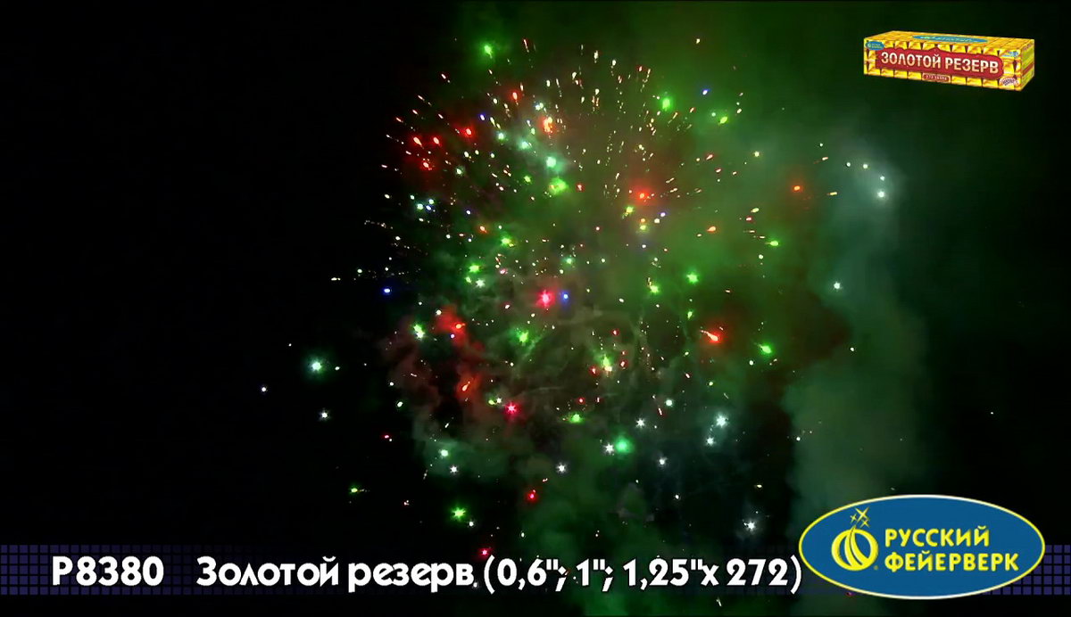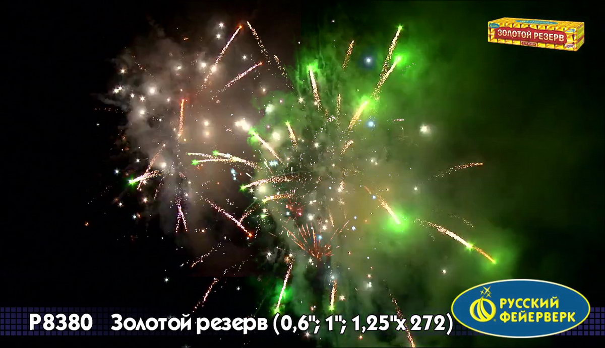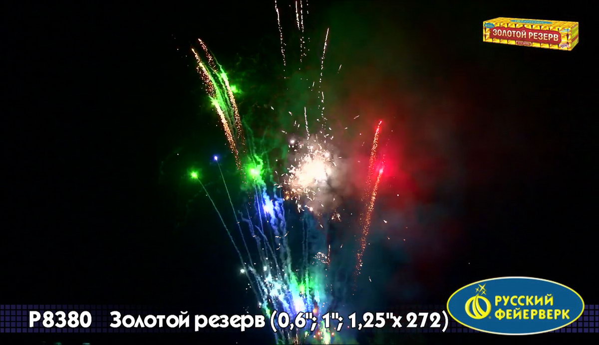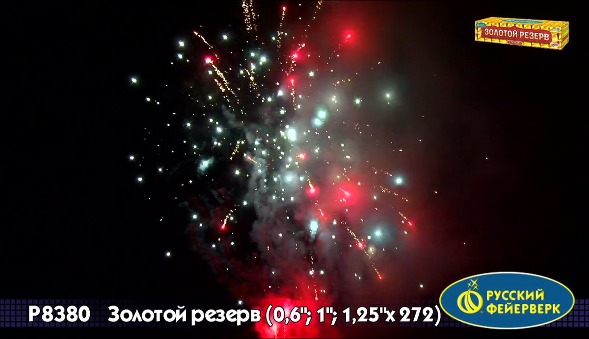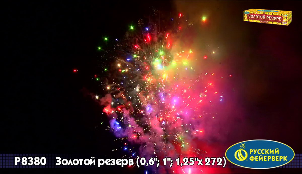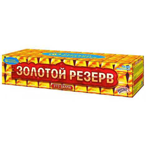 Фейерверк "Золотой резерв" по праву войдет в число легендарных супер-салютов. Это фейерверк "для своих" - для тех, кто знает толк в пиротехнике и умеет оценить красочность и размах салюта! 272 великолепных залпа! Если слишком волнуетесь, заранее успокойтесь, рекламы и перерыва на антракт здесь не предусмотрено! Сферы бирюзовых мерцающих и алых ярких огней, облака розовых мерцающих звезд и зеленых, сиреневых огней, изобилие рыжих тонких пальм, сине-розовый веер, внизу которого горит белоснежный спокойный фонтан. Ну, как? Интригует? Продолжим. Сине-зеленые сферы с золотым мерцанием переходят в огромные масштабные сферы из малиновых, зеленых, синих, алых и золотых огней, а фоном служит нежное бирюзовое мерцание. Множество золотых ниспадающих пальм - и снова затишье. Веерный салют из синих и малиновых огней с белоснежным наземным фонтаном. И салют начинает свое действие сначала. А к финалу подготовились мастера основательно: множество синих рыбок, нежных сиреневых и белых блуждающих огней и огромное перламутровое облако с красными крупными рубинами. Да, на такой салют точно много потрачено. Одних только эффектов сколько. Но, по правде говоря, подобную красоту трудно оценить в деньгах. Попробуйте найти подобное великолепие - это будет нелегко!