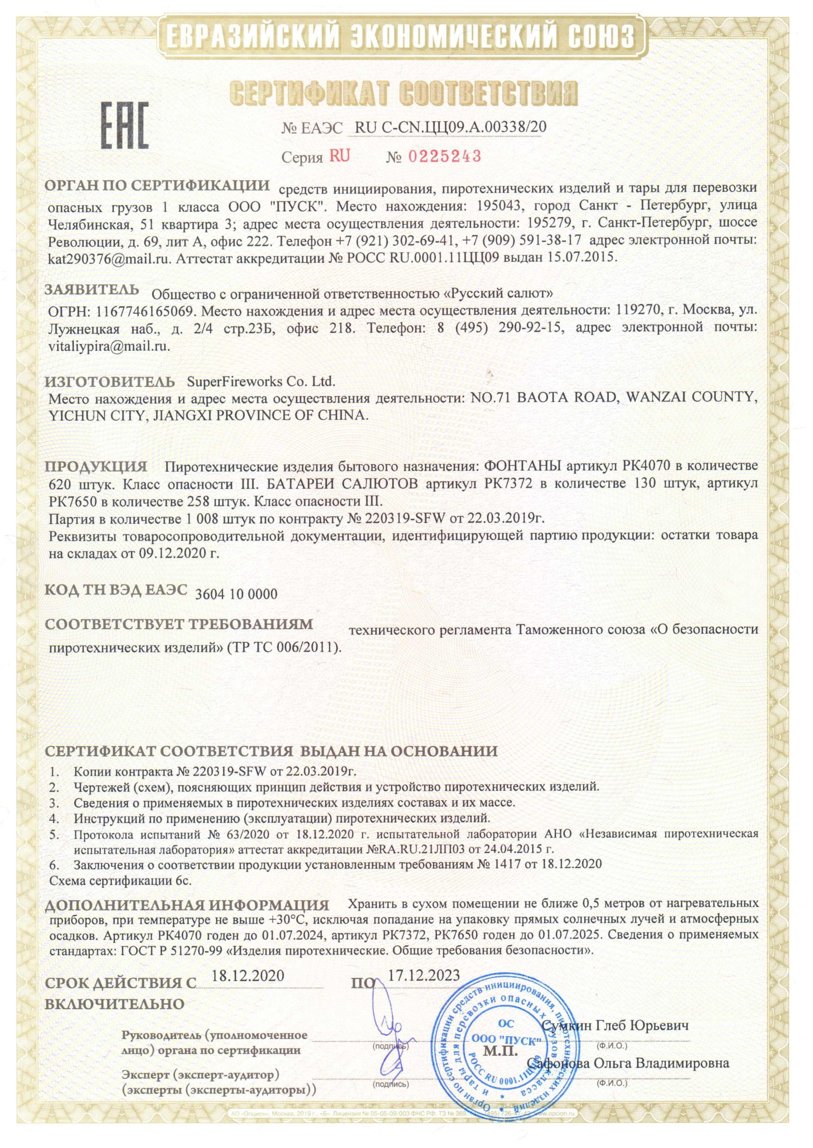 Магазин фейерверков ББ-Салют предоставляет гарантию на весь ассортимент интернет-магазина и розничных магазинов ББ-Салют! Мы торгуем пиротехникой самых лучших, проверенных торговых марок. Все изделия сертифицированы для продажи на территории России и имеют актуальный срок годности.