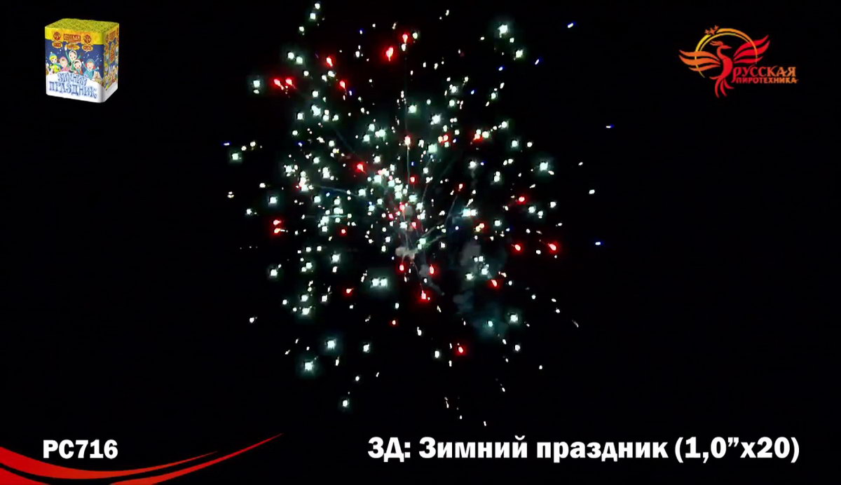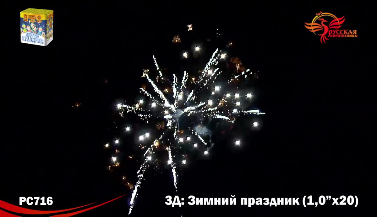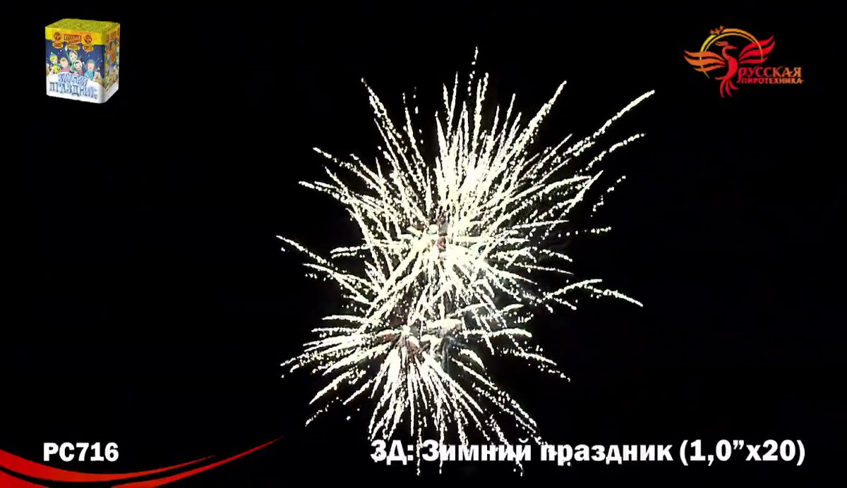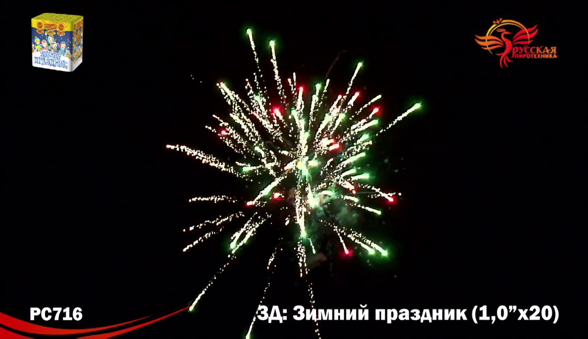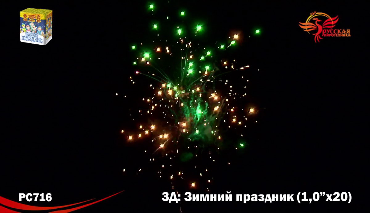Вы будете наслаждаться фейерверком "Зимний праздник" в течение 40 секунд, количество пиротехнических залпов - 20. В салюте использованы такие эффекты как: пионы, раскрывающиеся на фоне трепетного мерцания золотистых огоньков; насыщенные золотистые форсы со звездами на концах; сочетания сфер, состоящих из серебристых форсов с огнями всех цветов радуги на кончиках. Завершающий эффект, вызывающий всеобщий восторг - сферы из золотистых форсов.