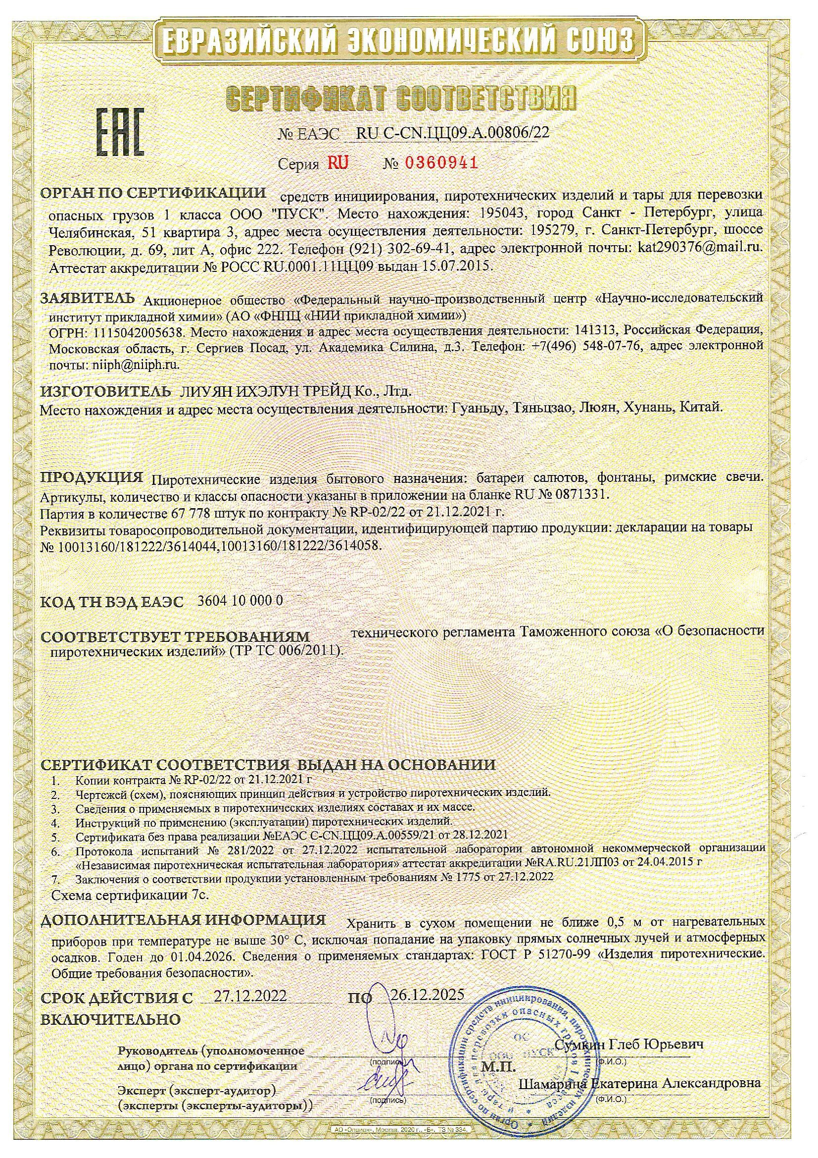 Магазин фейерверков ББ-Салют предоставляет гарантию на весь ассортимент интернет-магазина и розничных магазинов ББ-Салют! Мы торгуем пиротехникой самых лучших, проверенных торговых марок. Все изделия сертифицированы для продажи на территории России и имеют актуальный срок годности.