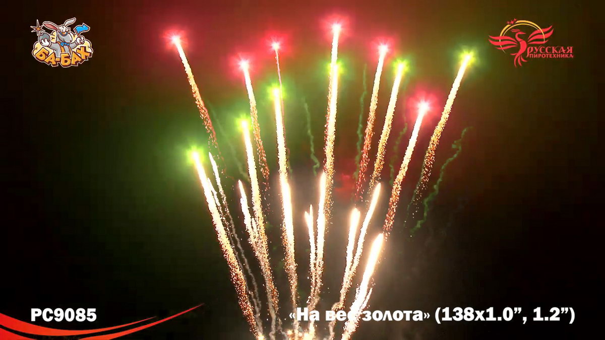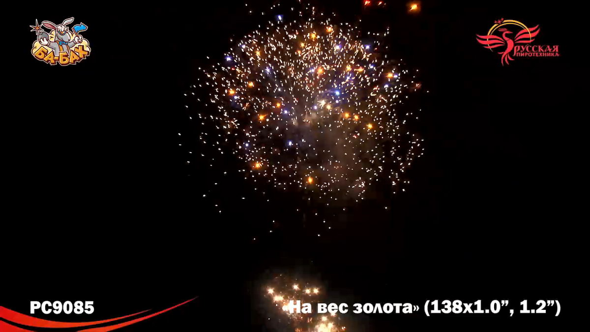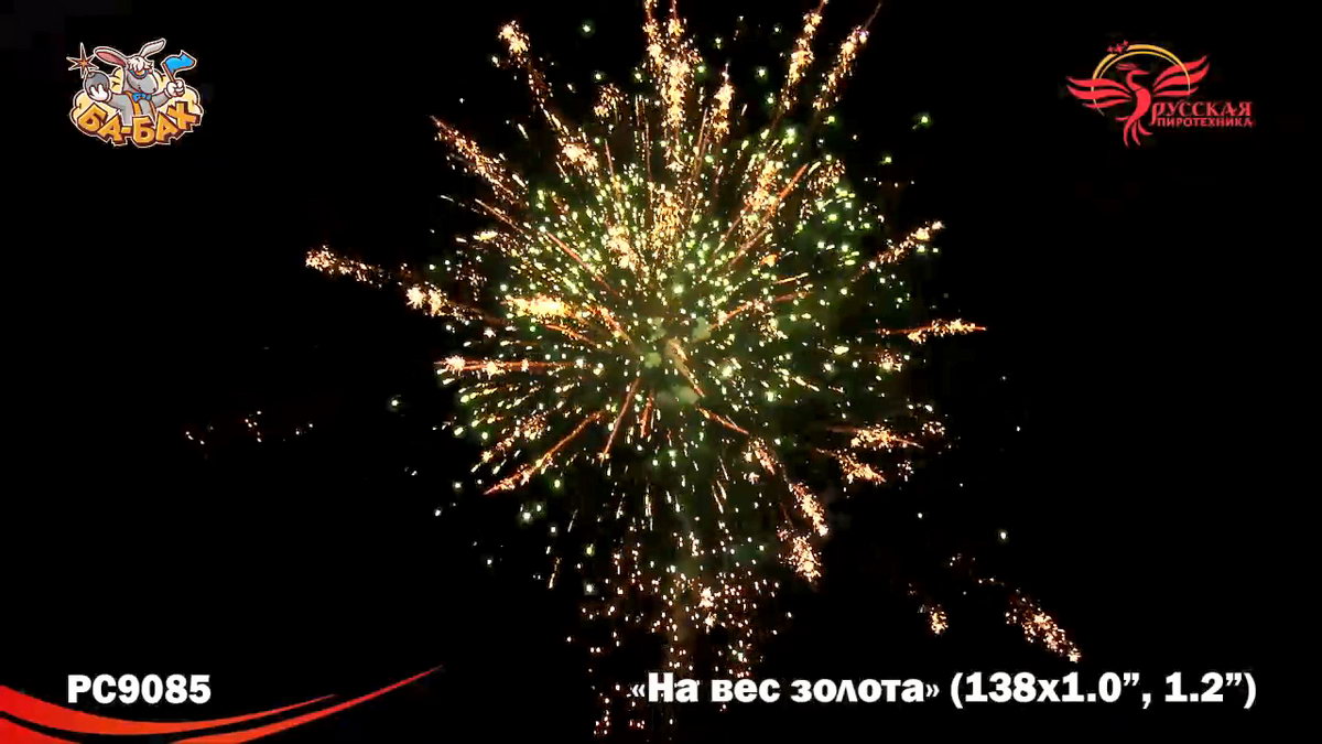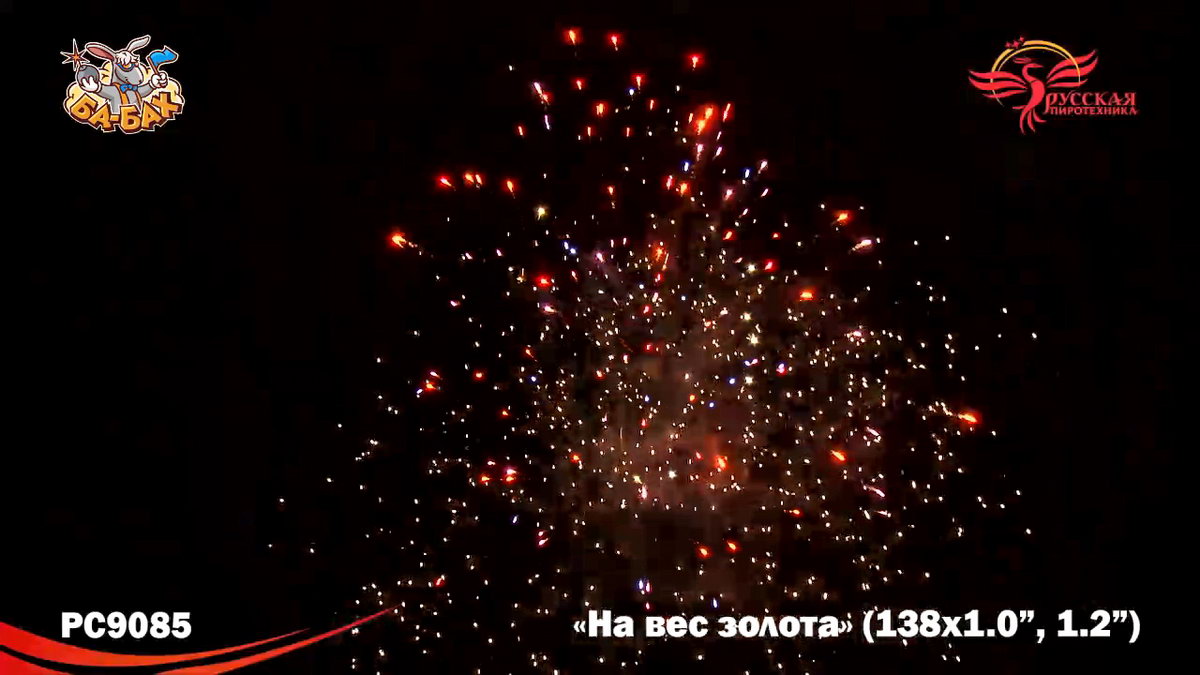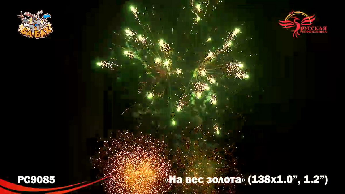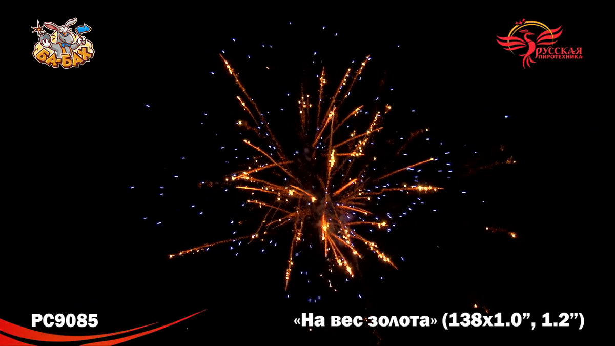По-настоящему блистательная композиция пиротехнических эффектов - вот что такое новый мультикалиберный фейерверк от "Русской Пиротехники". И в самом деле, каждый из этих 138 зарядов - "На вес золота"! Здесь нет ничего лишнего, только отборные, самые впечатляющие эффекты: два уровня залпов, из которых нижний, "парковый" фейерверк - букеты из серебристых огней и трассирующие искры, а верхний - предлагает лучшее что есть в фейерверочном искусстве: ВЕЕРНЫЕ залпы фантастической красоты и мощи! Это настоящий VIP-фейерверк для самой искушенной публики: Ваших близких и друзей!